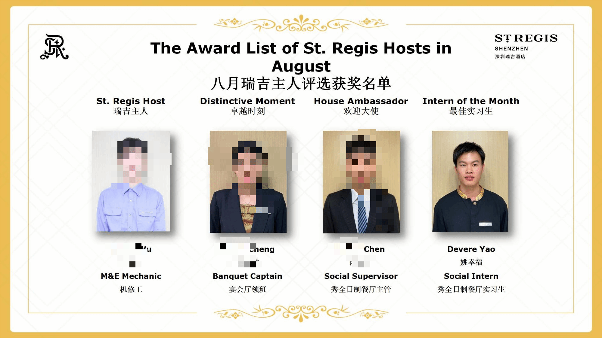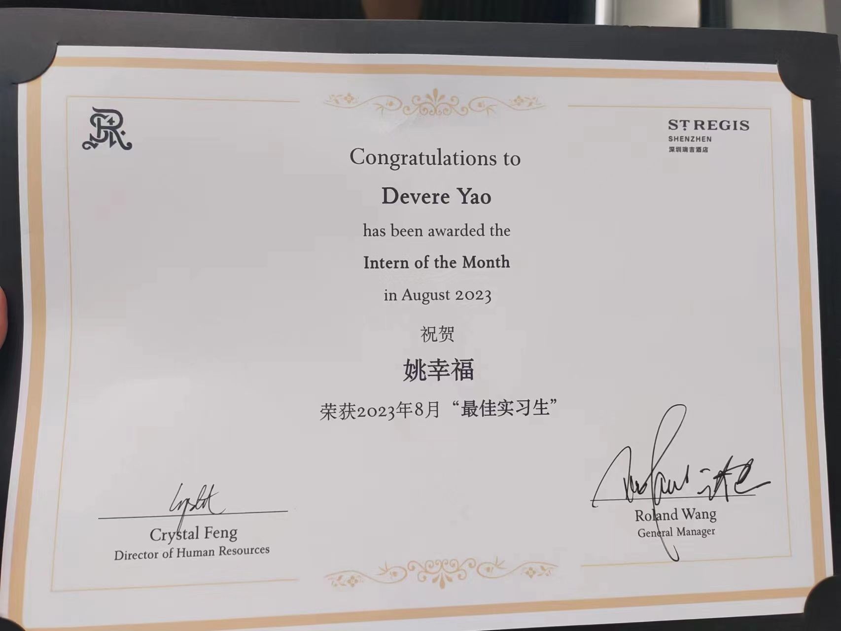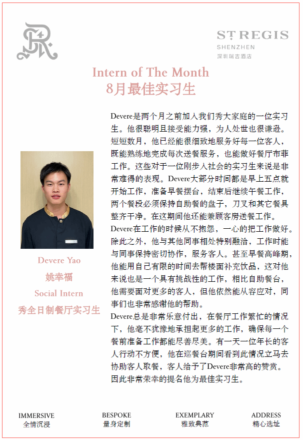 现于深圳瑞吉酒店餐饮部实习