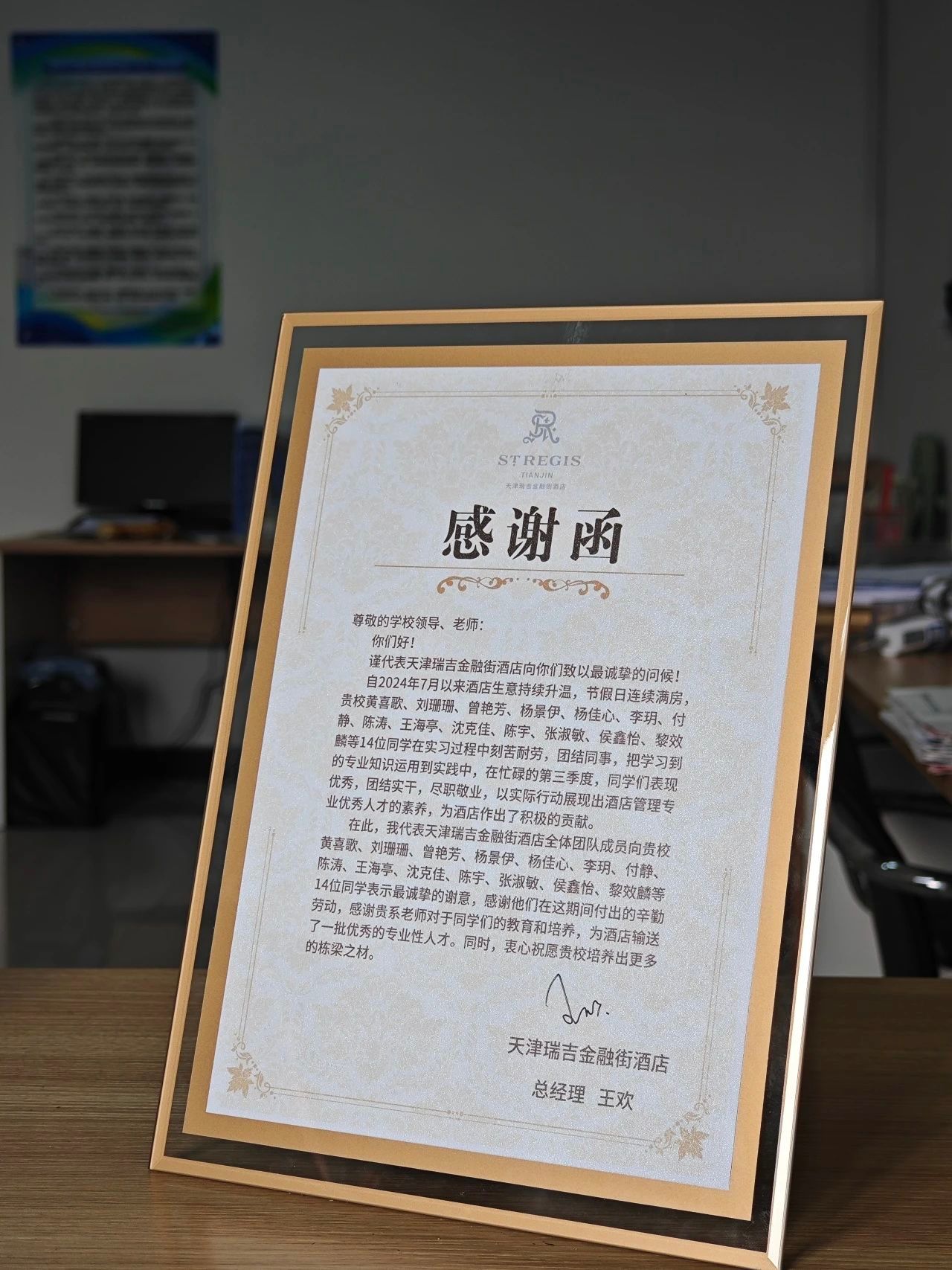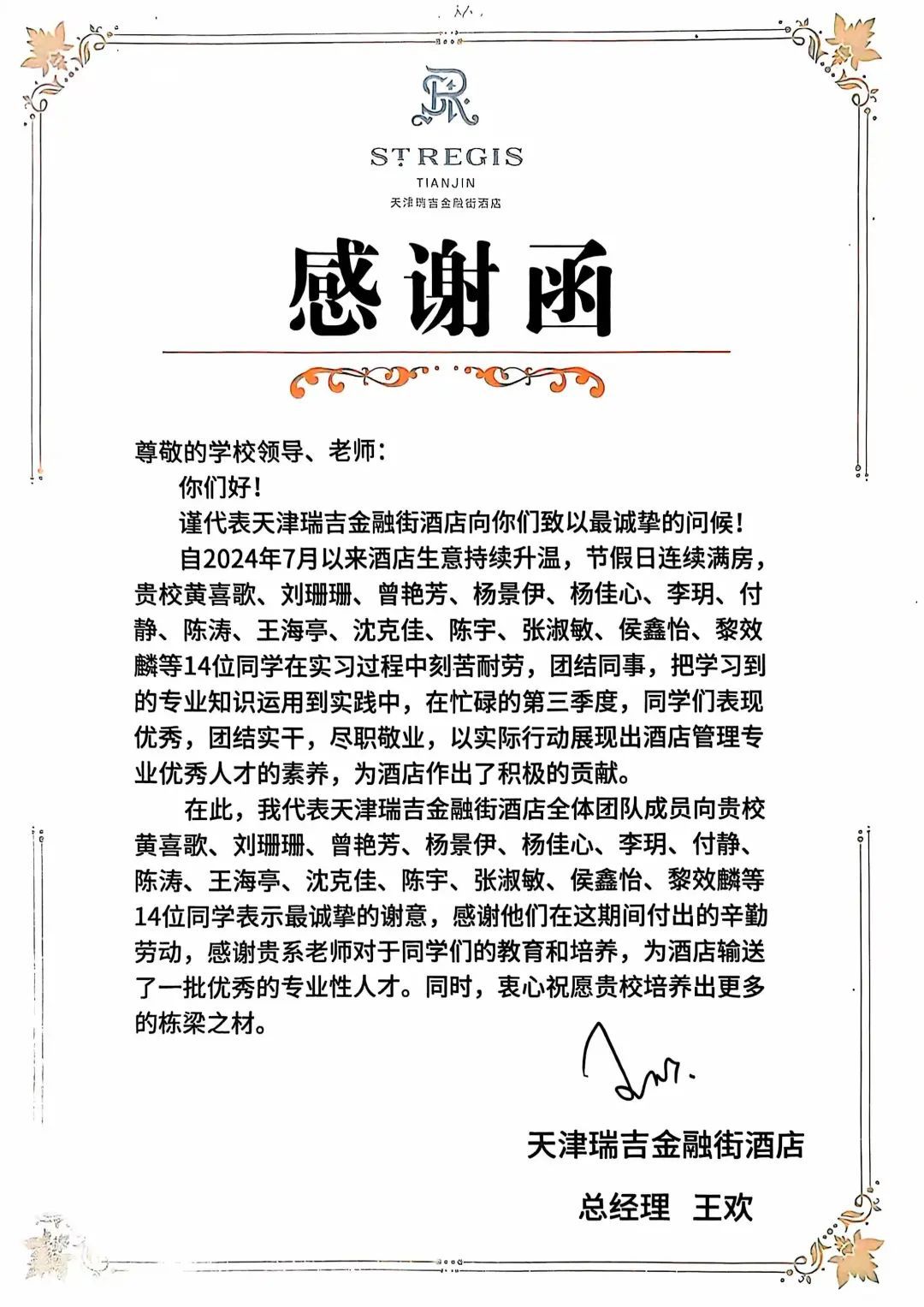 近日,我院收到来自天津瑞吉金融街酒店对2022级顶岗实习学生的感谢信。信中,对我院14位实习生在酒店的突出表现表示感谢。