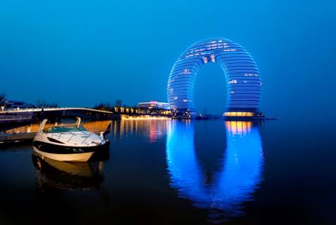 湖州喜来登温泉度假酒店位于中国浙江省湖州市闻名遐迩的太湖南畔。这座指环形度假酒店呈弧形横跨湖面之上,成为湖州的标志性景观。