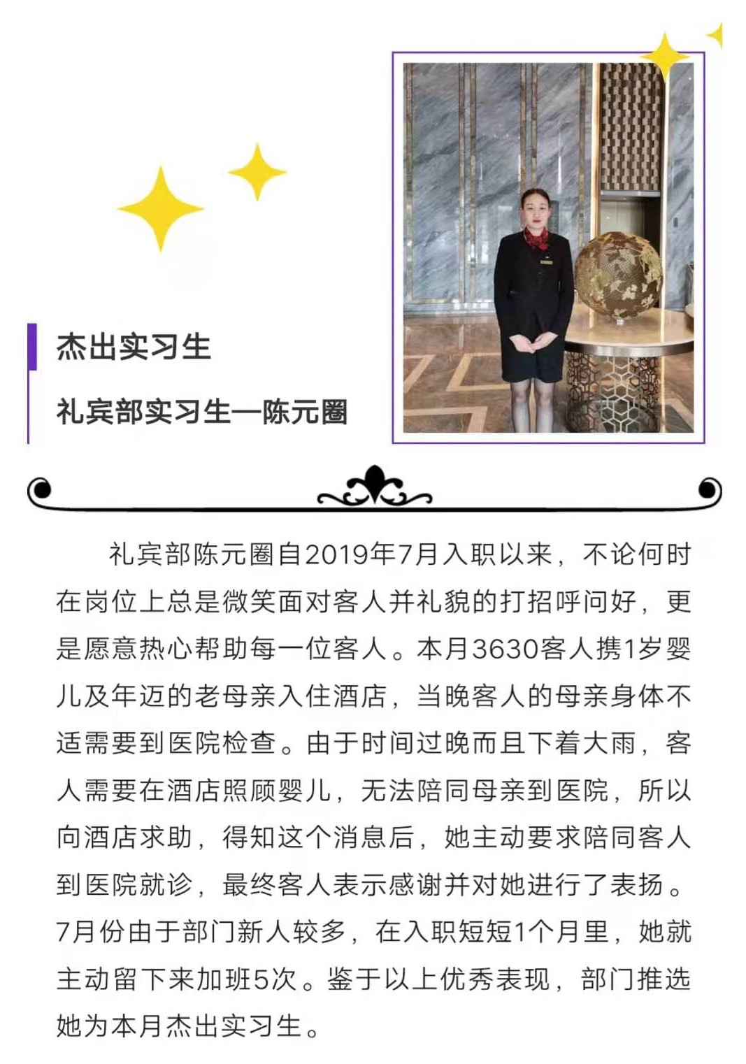 班主任:代慧峰实习酒店:郑州万达文华酒店部门:礼宾部事迹:实习以来一直在酒店认真学习工作,实习第一个月在几十名实习生中脱颖而出,短短一个月就有了优秀服务案例。