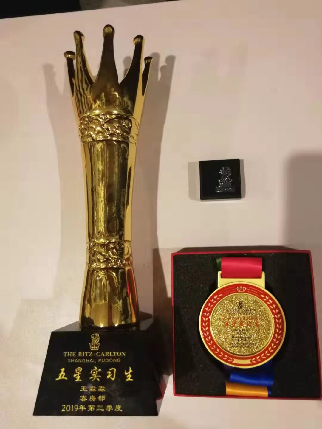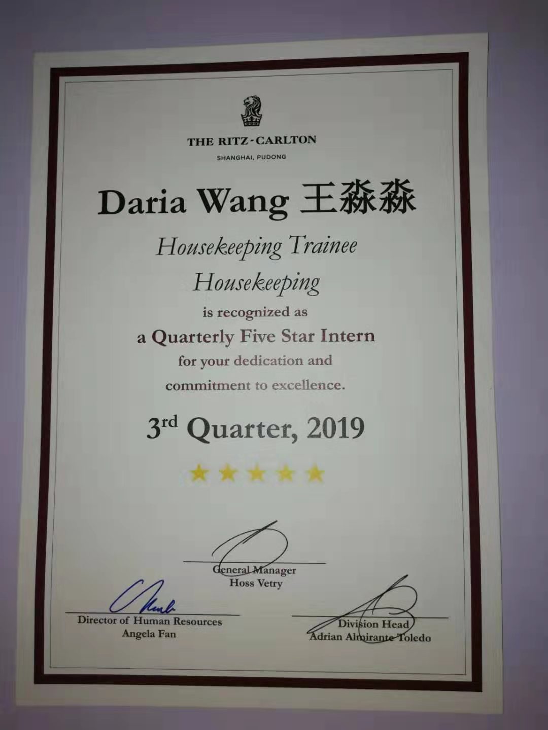 17级九班 王淼淼,实习于上海浦东丽思卡尔顿酒店,所从事工作岗位是客房文员。主要负责的工作任务有酒店客房工作量分配,客房信息的采集,客房部酒水的采购,客房与其他部门电话的接打等等。这些最普通不过的工作,她每天持之以恒的完成并做到尽善尽美。因此酒店客房部为了鼓励调动员工积极性特推荐她为浦东丽思卡尔顿五星员工,并且在所有部门中脱颖而出。五星员工奖项主要是颁发给对酒店有积极贡献、工作努力的员工。五星员工大会每季度举办一次,每部门被选上的五星员工寥寥无几。所以得到了这个奖项便意义着代表着酒店对员工工作上的肯定,也为以后的工作打下了好的基础。