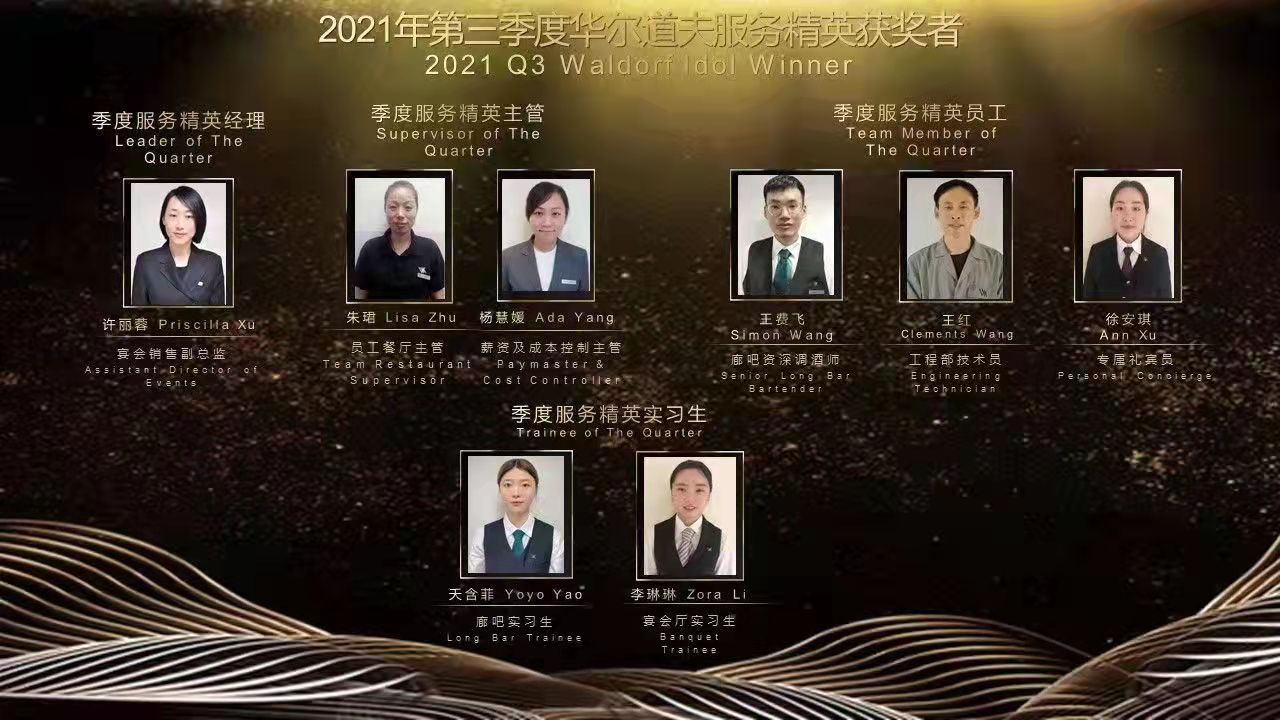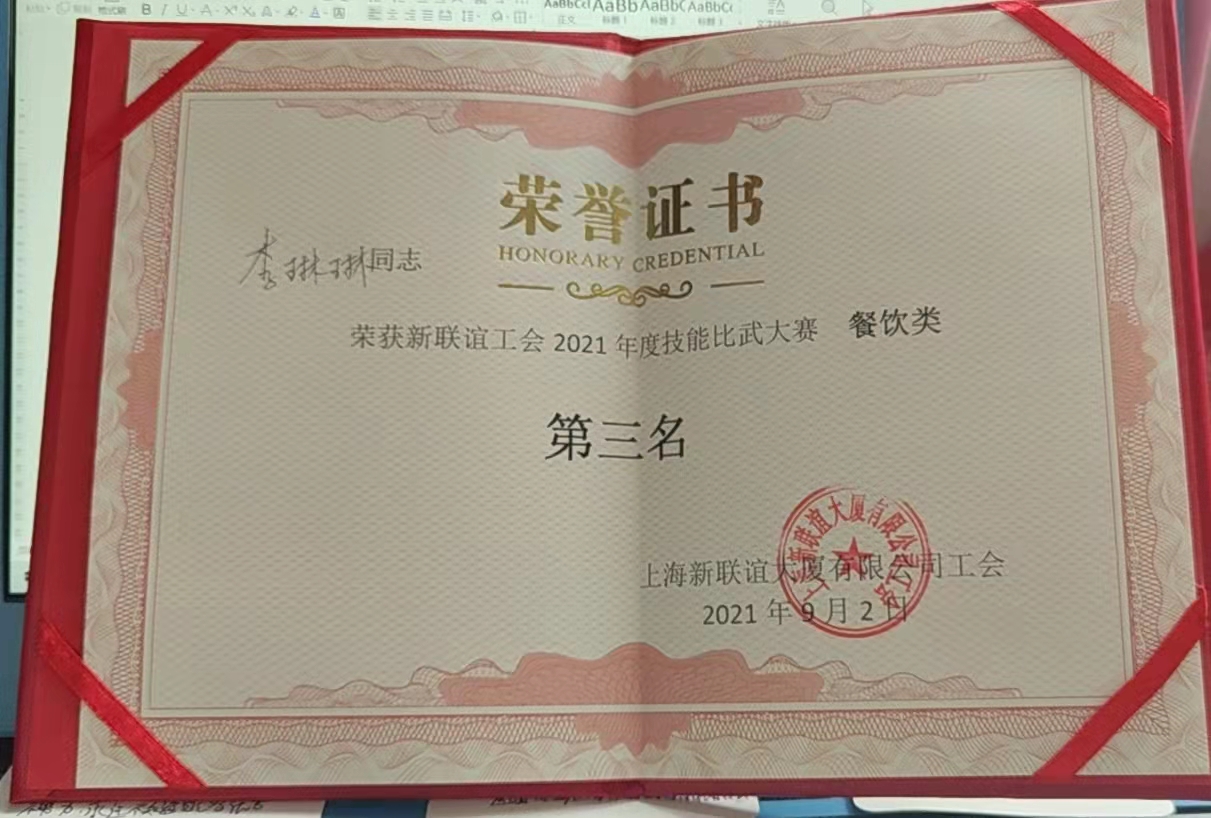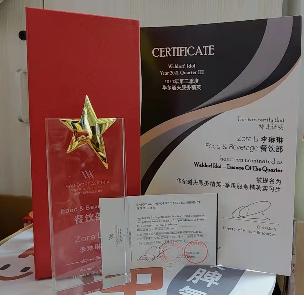 2021年8月,酒店业主方在上海外滩华尔道夫酒店中餐厅举行了“技能大赛”。接到活动通知后,部门领导经商讨决定让我代表部门成员,参与此次比赛。但因备赛时间紧促,我便利用下班时间进行了为期一周的急训。一次次分析比赛细节,一遍遍铺台演练,最终不负期望,以从容不迫、落落大方的形象,朝气蓬勃的精神风貌在酒店业主方举办的技能比武大赛中取得了第三名的成绩。可能成绩算不上很好,但对我而言则是最大的鼓励与动力,让我充分相信有付出就会有回报。