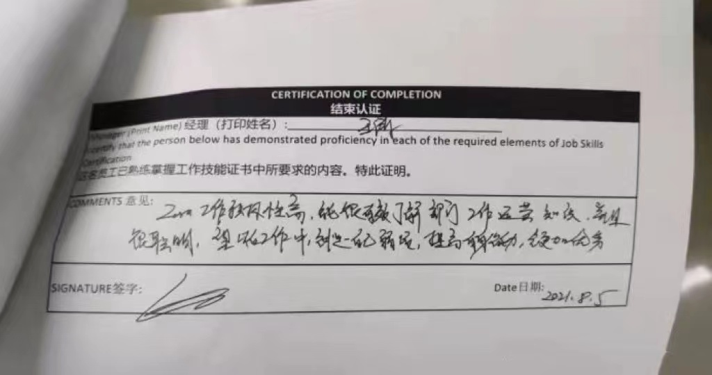 在入职培训后,每位实习生都将接受为期45天系统的部门培训,在工作中培训,在培训中工作,部门领导在培训意见中提出了对我的赞许,同时也提出了自己的期望,期望我能够提升自己,更加优秀。