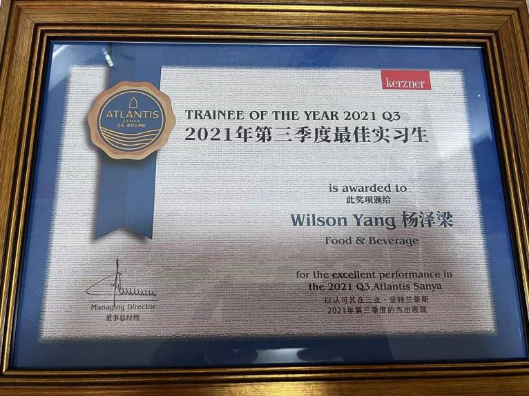 2021年第三季度获三亚·亚特兰蒂斯度假区最佳实习生的荣誉
