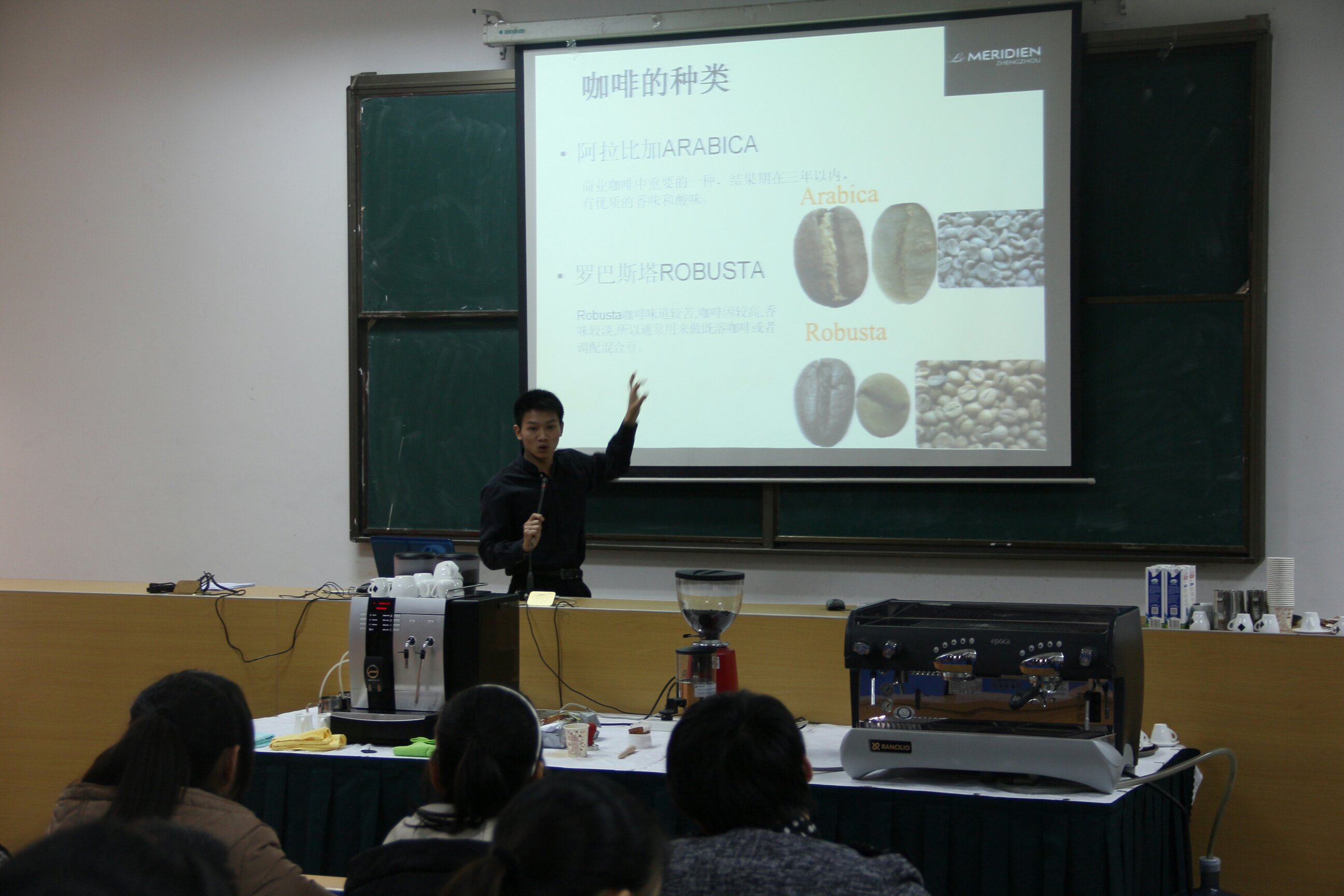 咖啡作为一种从海外传入的饮料,在中国发现已有22年的历史。调酒师首先从咖啡的起源,果实结构,采摘技术三个方面将听众带入了咖啡的神奇世界。接着,调酒师又深入讲解了咖啡豆的种类,咖啡机的种类、制作咖啡的要素、制作咖啡的技巧、咖啡机的操作及清洗方法等。同学们听的津津有味。最后调酒师使用咖啡机为同学们展示了如何制作咖啡, 并邀请现场同学上台学习制作咖啡,大家都兴致勃勃,跃跃欲试。