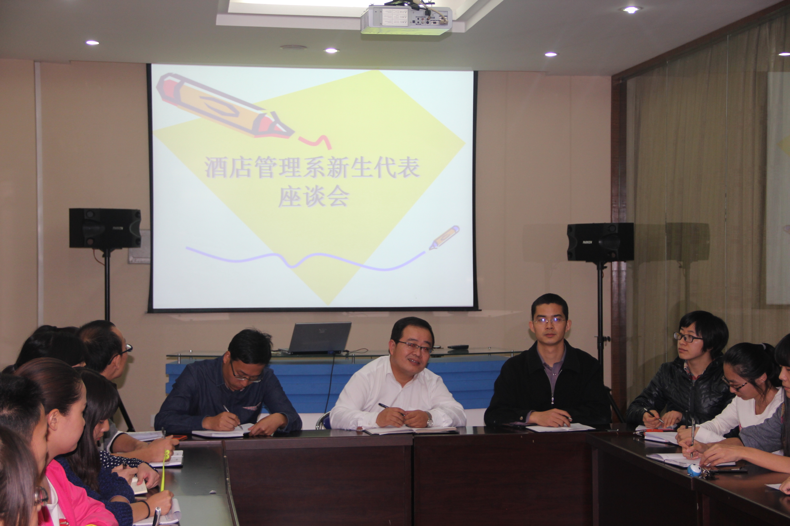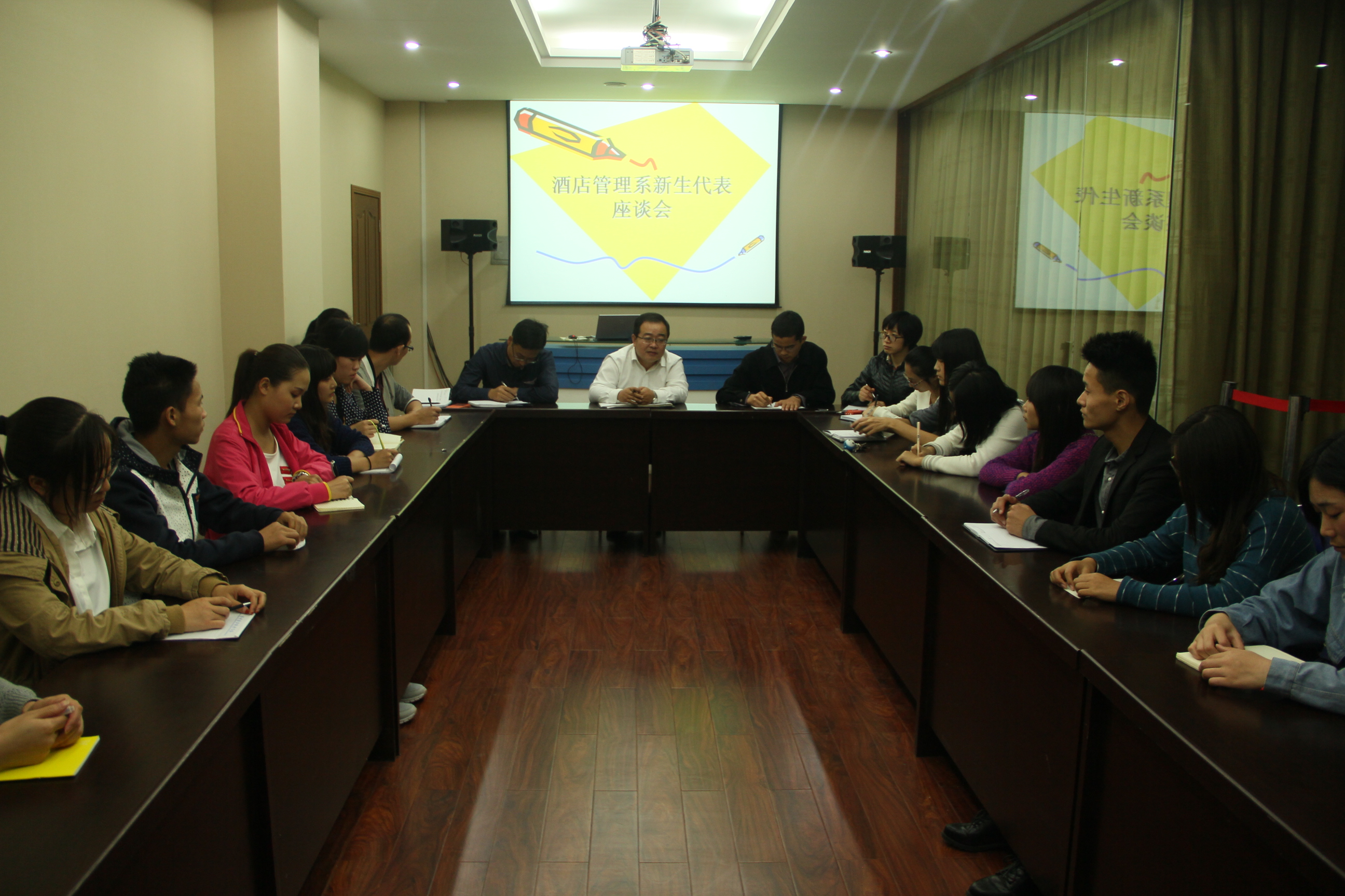 2014年10月16日17时,酒店管理系新生代表座谈会于实训搂水晶客房拉开帷幕,会议由酒店管理系主任李晓东、副书记陈海彬主持,参加会议的有全体辅导员及2014级酒店管理系新生代表。