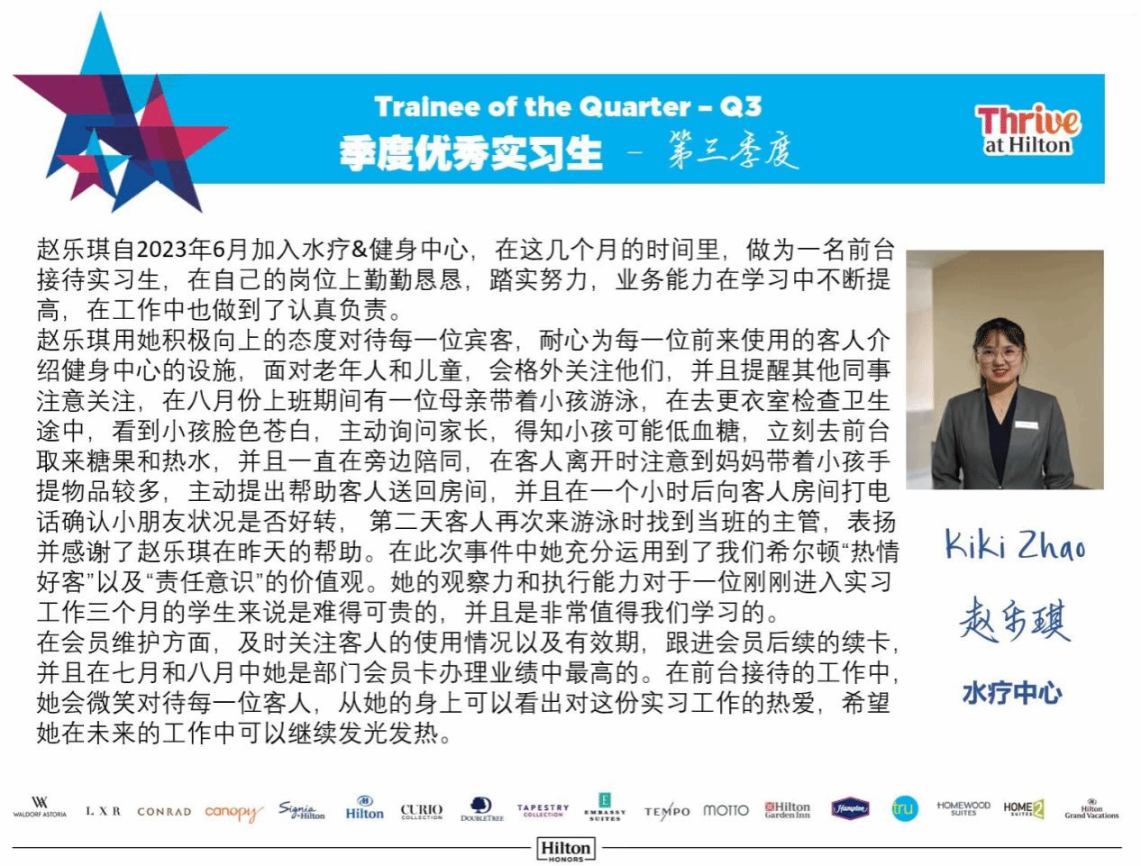 现于西安高新希尔顿酒店水疗&健身中心实习生