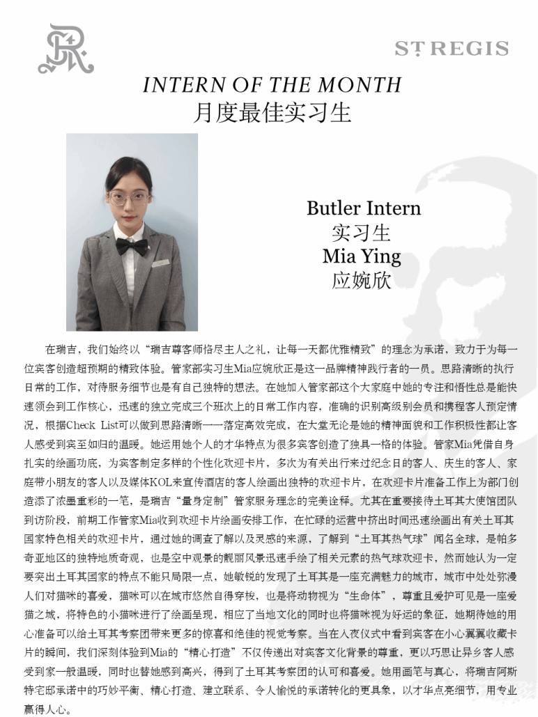 在瑞吉酒店实习的这两个月,我从最初的小心谨慎,到如今能够从容应对客人的多样化需求,逐渐领悟到“奢华”二字的真谛并非仅仅体现在璀璨的水晶灯或大理石地面上,而更在于一种近乎隐形的体贴与预判,以及细致入微、恰到好处的关怀。