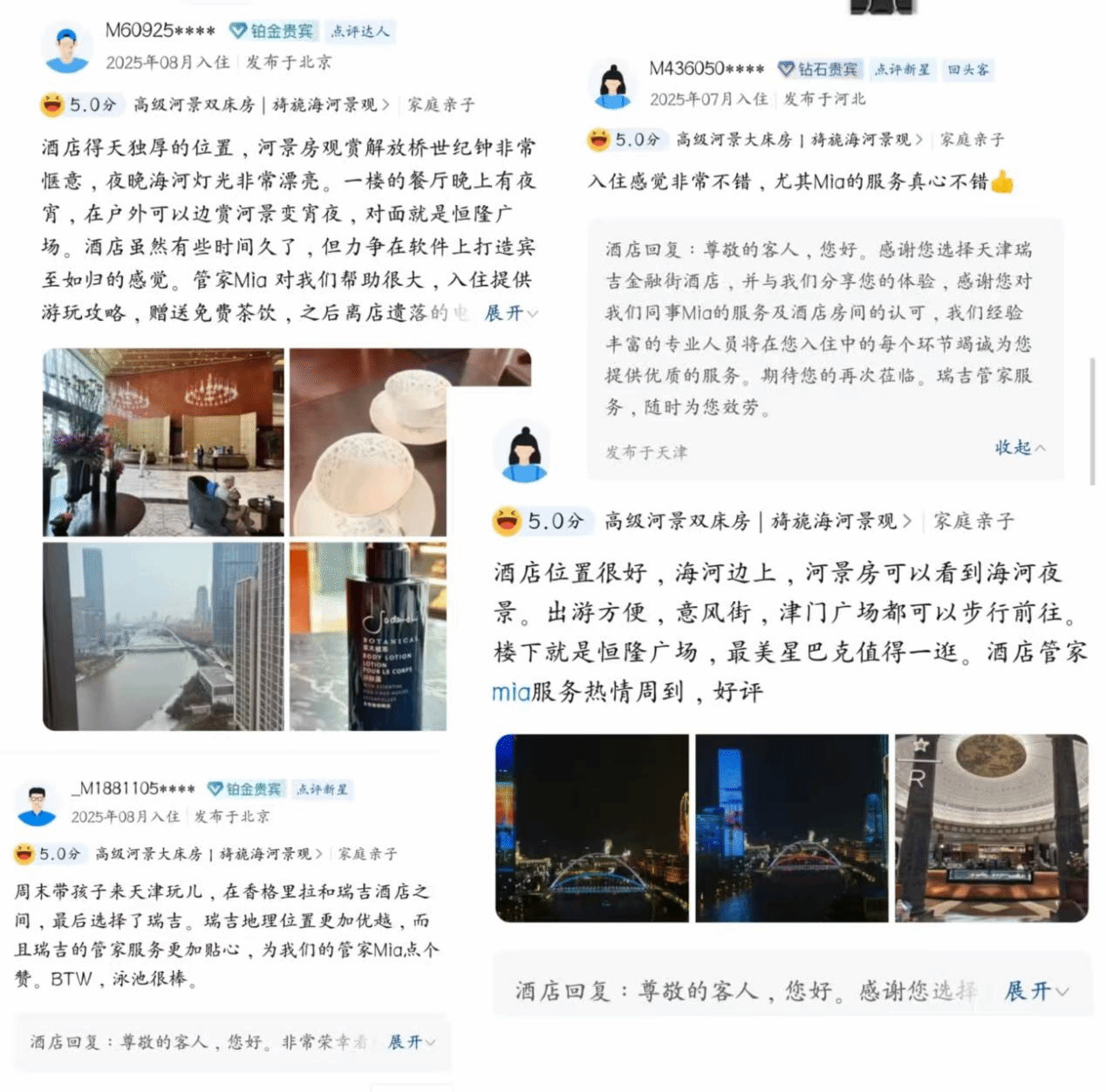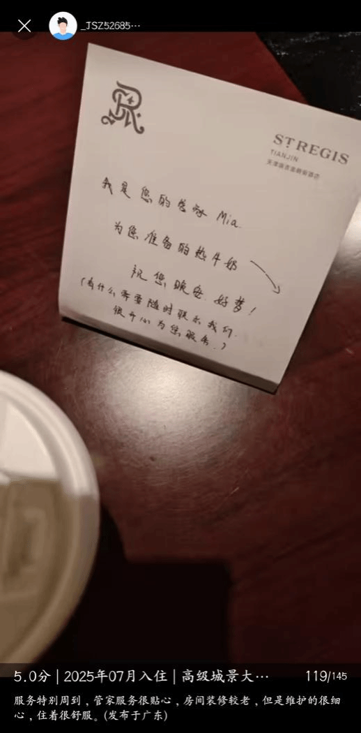 记得有一次,一位客人深夜到店。由于该客人上次偶然提到喜欢在入睡前喝热牛奶,我便在客人办理入住手续期间,提前准备了一杯热牛奶并送至房间。当客人进入房间,看到床头摆放的热牛奶和问候卡时,感到无比惊喜,并对我表达了深深的感谢。看到他满意的笑容,那一刻,我瞬间体会到了投身服务行业的乐趣。(如下所示,该客人在线上平台发布的评价及照片)