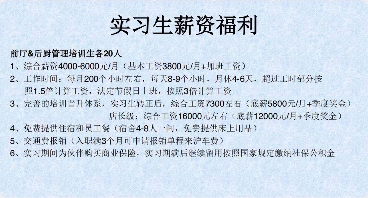 招聘前厅&后厨管理培训生各20人,不限专业。综合薪资4000 - 6000元/月(基本工资3800元/月 + 加班工资),月休4 - 6天,超工时按1.5倍计算工资,法定节假日3倍工资 。转正后综合工资7300元左右,提供免费食宿和商业保险。