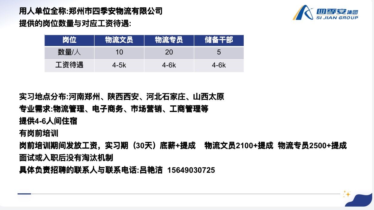 实习招聘(十七)郑州市四季安物流有限公司实习介绍