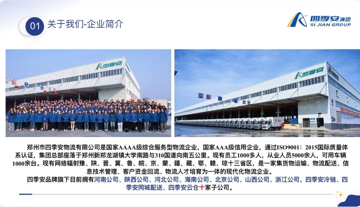 郑州市四季安物流有限公司是国家AAAA级综合服务型物流企业,通过ISO9001:2015国际质量体系认证。总部位于郑州新郑龙湖镇,现有员工1000多人,网络辐射十三省区,旗下有十家子公司,业务涵盖零担快运、供应链管理等多个领域。