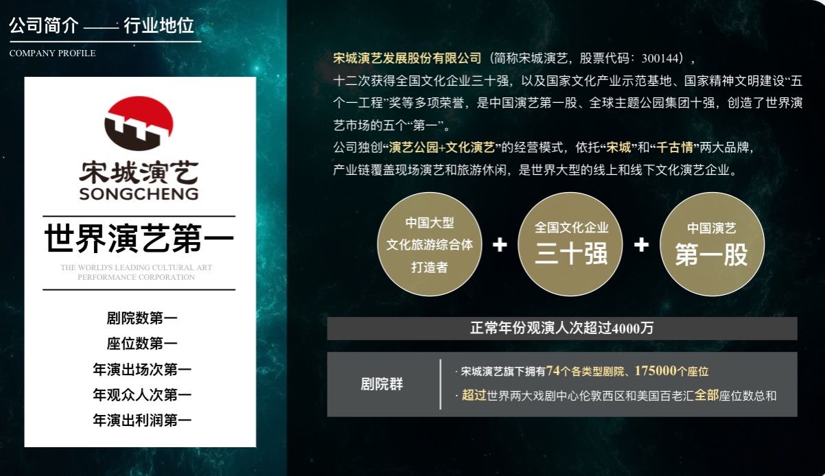 宋城演艺发展股份有限公司是中国演艺行业的领军企业,十二次获得全国文化企业三十强等多项荣誉,独创“演艺公园 + 文化演艺”经营模式,旗下剧院众多,座位数超世界两大戏剧中心总和。其“千古情”演艺系列是高品质文化作品,在多个城市落地项目,年观演人次超4000万 。