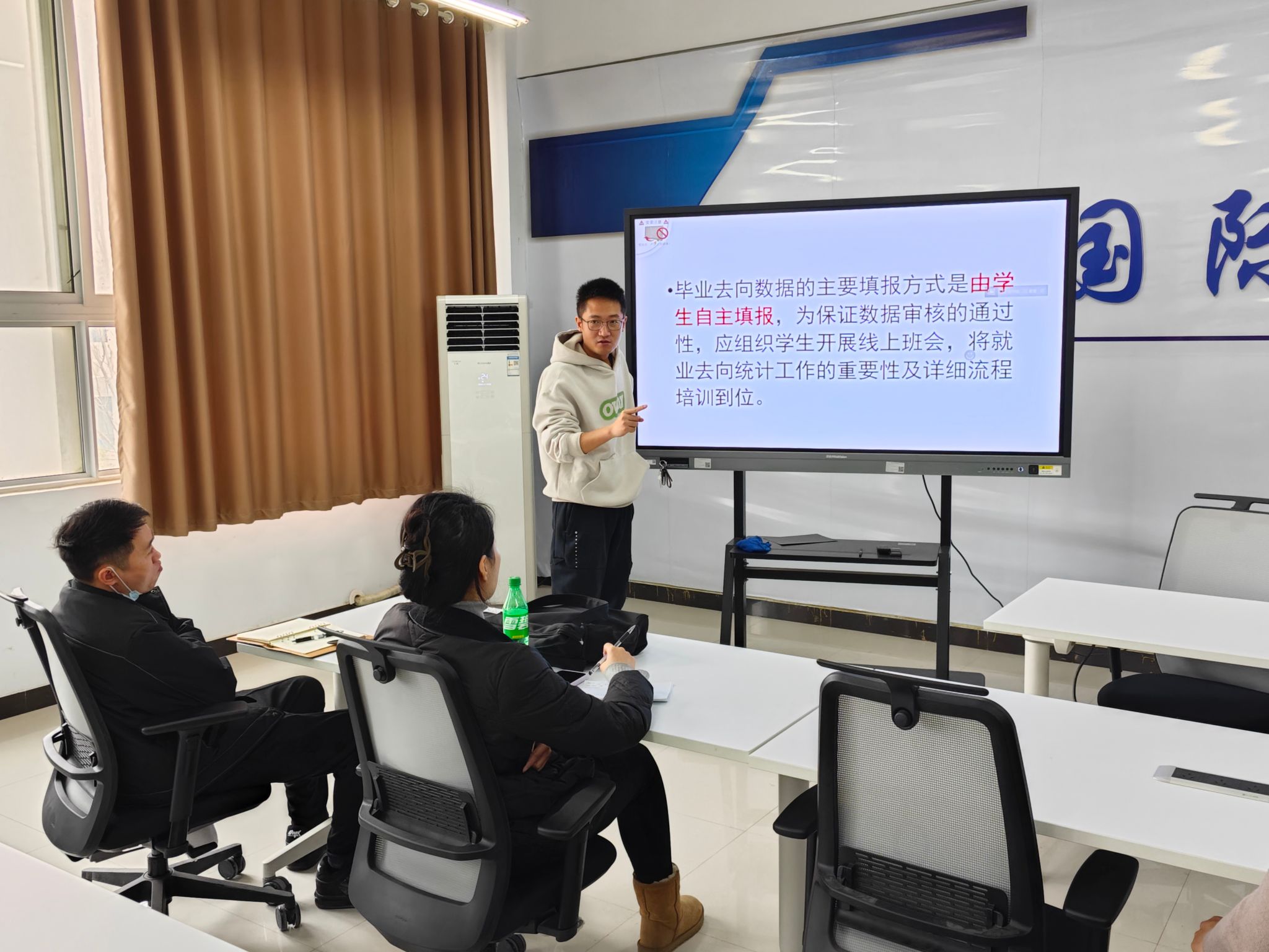 随后,戴鹏围绕毕业去向数据提交关键节点展开培训,着重强调“四不准”原则,在维持学生就业质量的基础上,确保就业数据真实可靠。同时,针对毕业生重点群体帮扶工作,戴鹏也提出一系列切实可行的举措,助力困难学生就业。随后,他详细讲解了具体数据上报业务流程,明确各环节操作规范,以提升就业工作效率与质量。