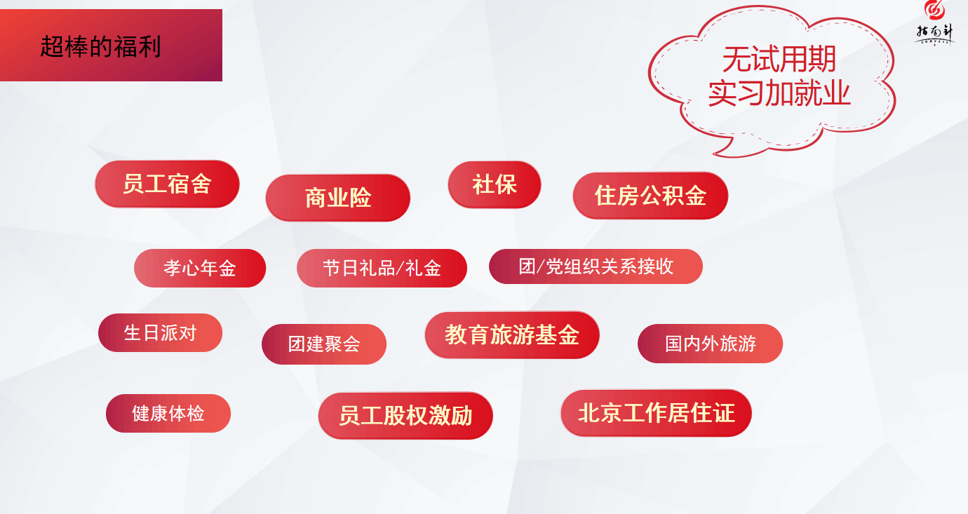 办公与福利:拥有北京、广东指南针大厦独立办公区,提供员工宿舍(步行5分钟通勤)、带薪学历提升(国家开放大学本科,可减免学费)、节日仪式感礼品及国内外团建旅游。