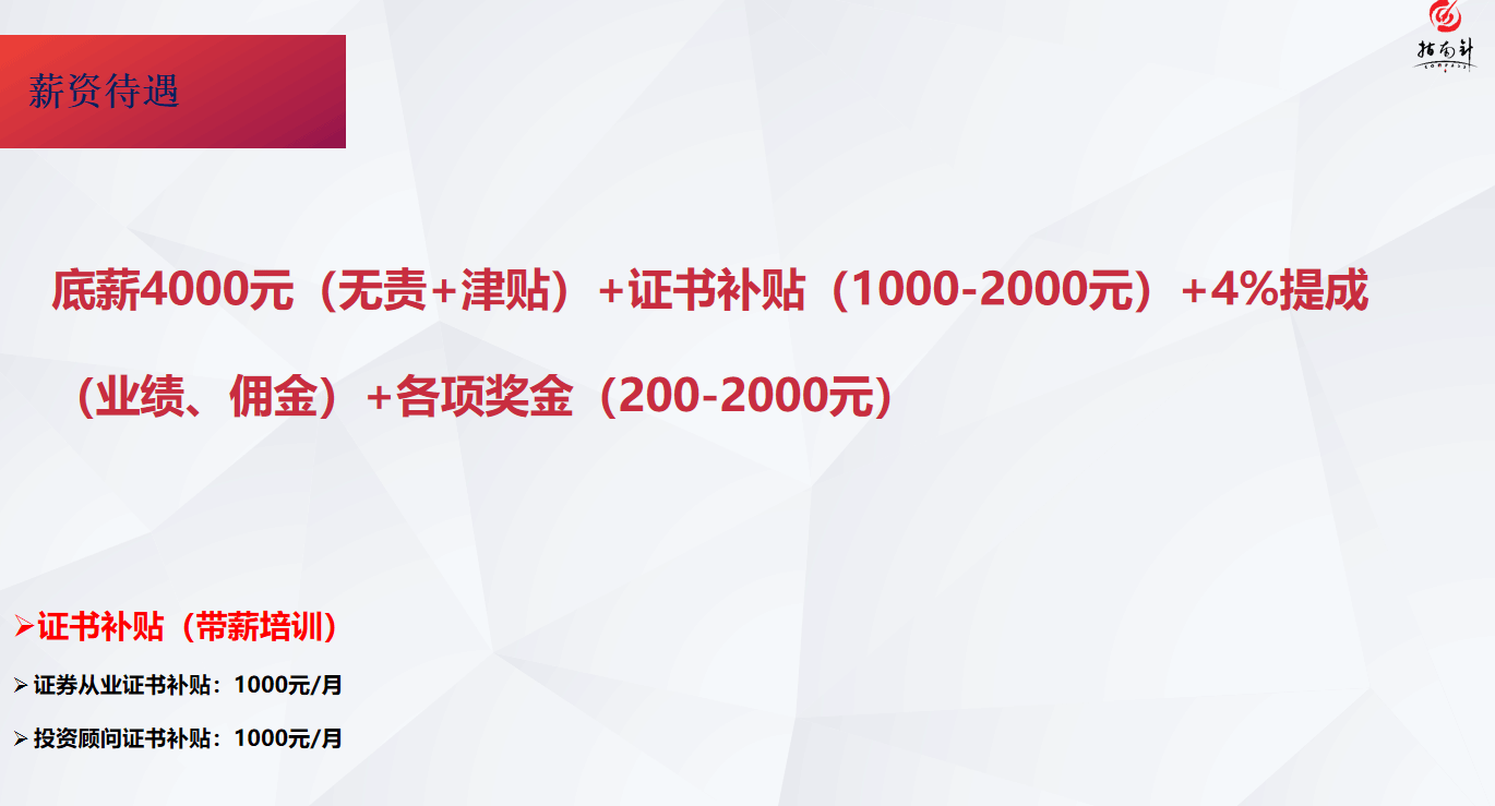 平均年薪:入职1年约9万,2年13万,3年19万 - 福利:带薪岗前培训、证券从业考证辅导、六人间独立卫浴宿舍(免费)、季度晋升通道(见习→主管→总监)。