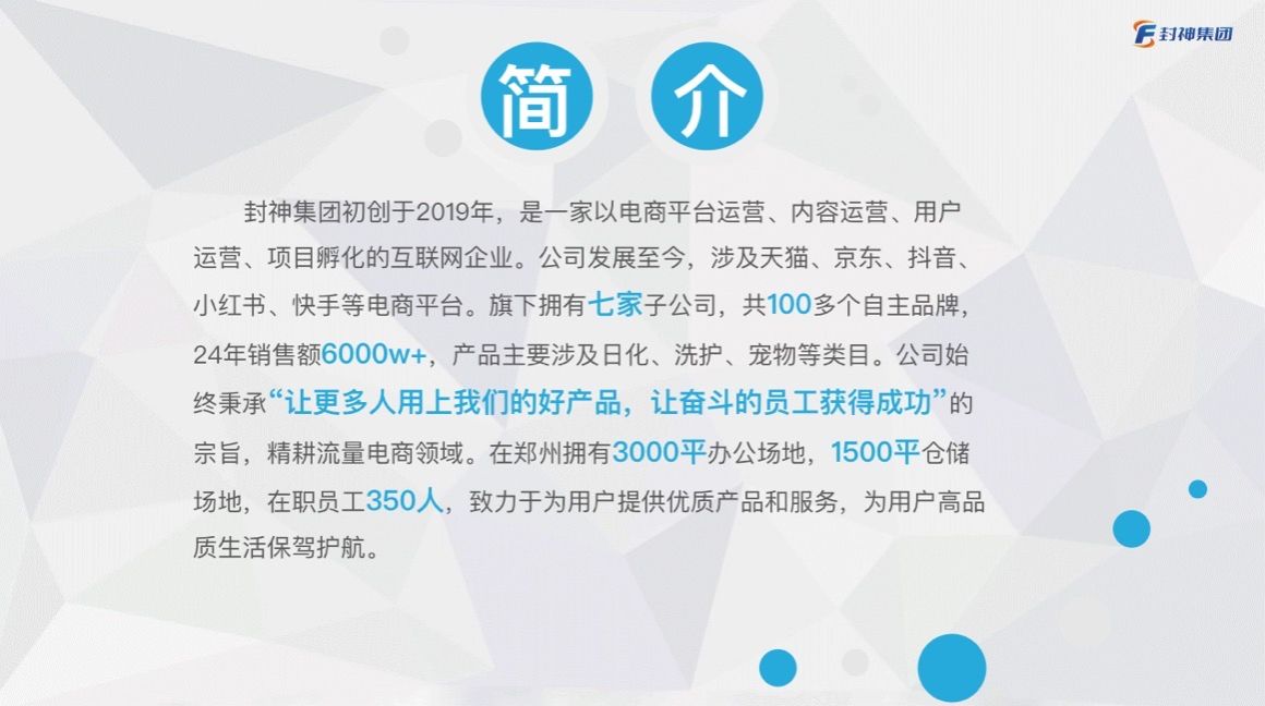 封神集团 2019 年创立,是涉足多电商平台运营、项目孵化的互联网企业,旗下有七家子公司、100 多个自主品牌,2024 年销售额超 6000 万元,产品涵盖日化、洗护、宠物等类目。公司秉持 “让更多人用上我们的好产品,让奋斗的员工获得成功” 的理念,拥有完善的办公和仓储场地,在职员工 350 人。