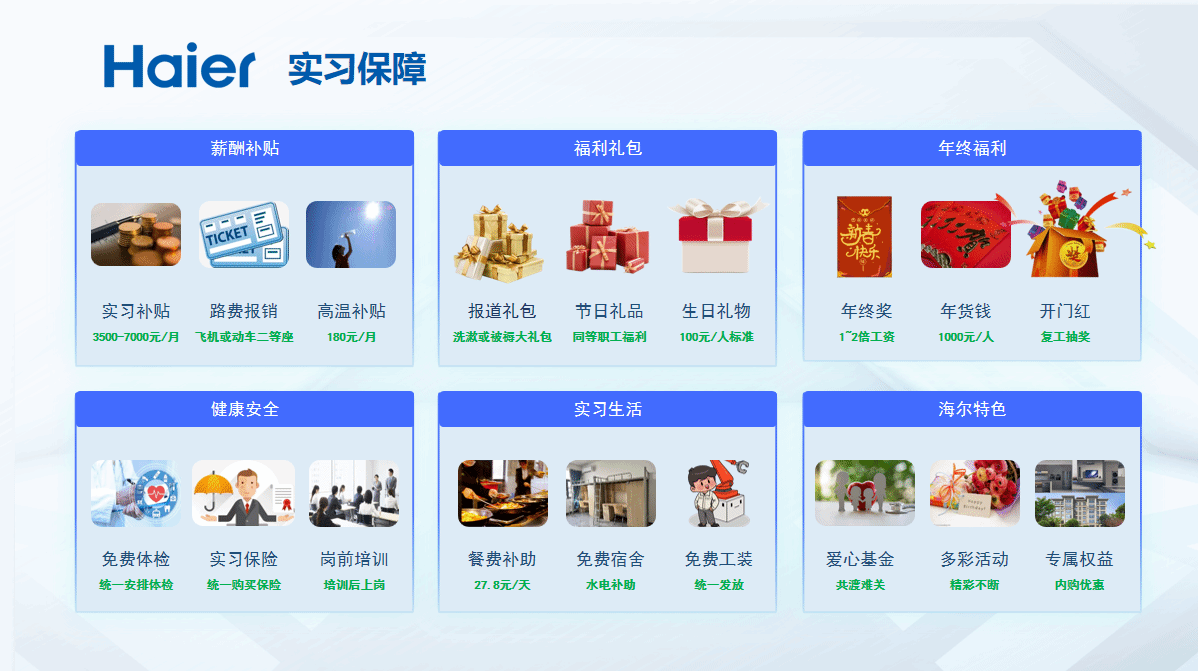 实习补贴 3500 - 7000 元 / 月,还有高温补贴、路费报销、年货钱等福利,提供免费体检、宿舍、工装,购买实习保险,表现优秀有年终奖。
