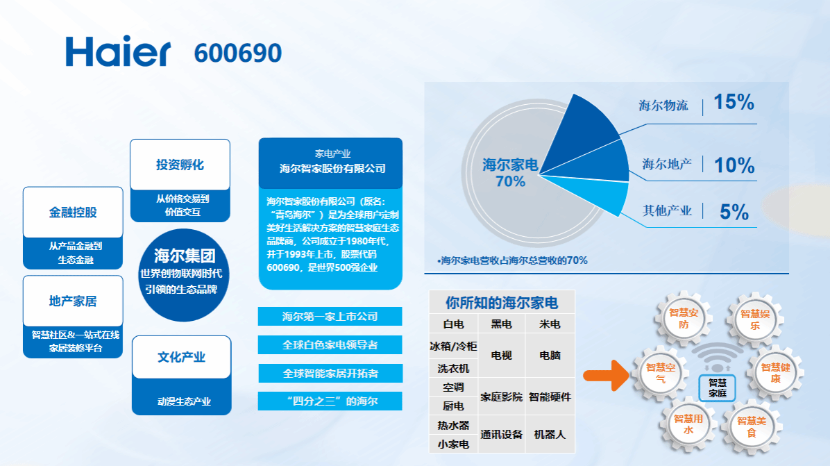 海尔智家是世界 500 强企业,为全球用户提供智慧家庭解决方案。业务涵盖家电、智慧安防、娱乐等多领域,在全球有众多研发中心、工业园、制造中心和营销中心。积极履行社会责任,在公益、环保方面成果显著,旗下工厂获多项荣誉。