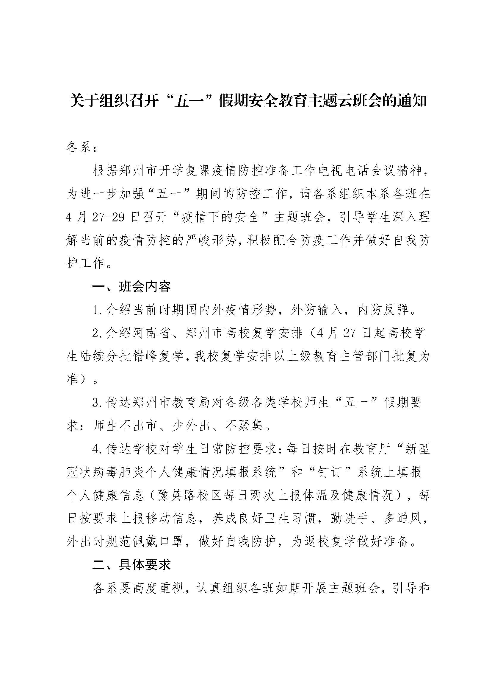 关于组织召开“五一”假期安全教育主题云班会的通知