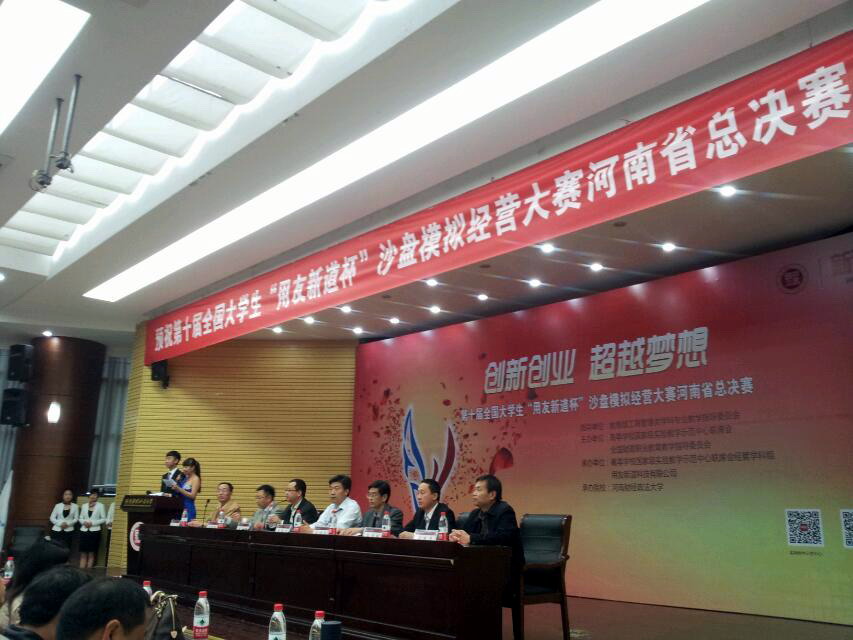 第十届全国大学生“用友新道杯”沙盘模拟经营大赛河南省总决赛开幕式于2014年5月10日上午,在河南财经政法大学盛大开幕。本次大赛以“创新创业,超越自我”为宗旨,通过模拟企业经营管理,让学生熟练地掌握了企业ERP管理软件的一体化应用模式与业务处理,体验企业间的竞争,熟悉生产制造、渠道建设、订单争取等多个环节的运营模拟。这样不仅可以锻炼学生的实际操作能力、随机应变能力,而且能够提升学生系统思考、整体构架的企业运营和管理能力,激发大学生自主创业的热情,提高大学生自主创业的综合能力。