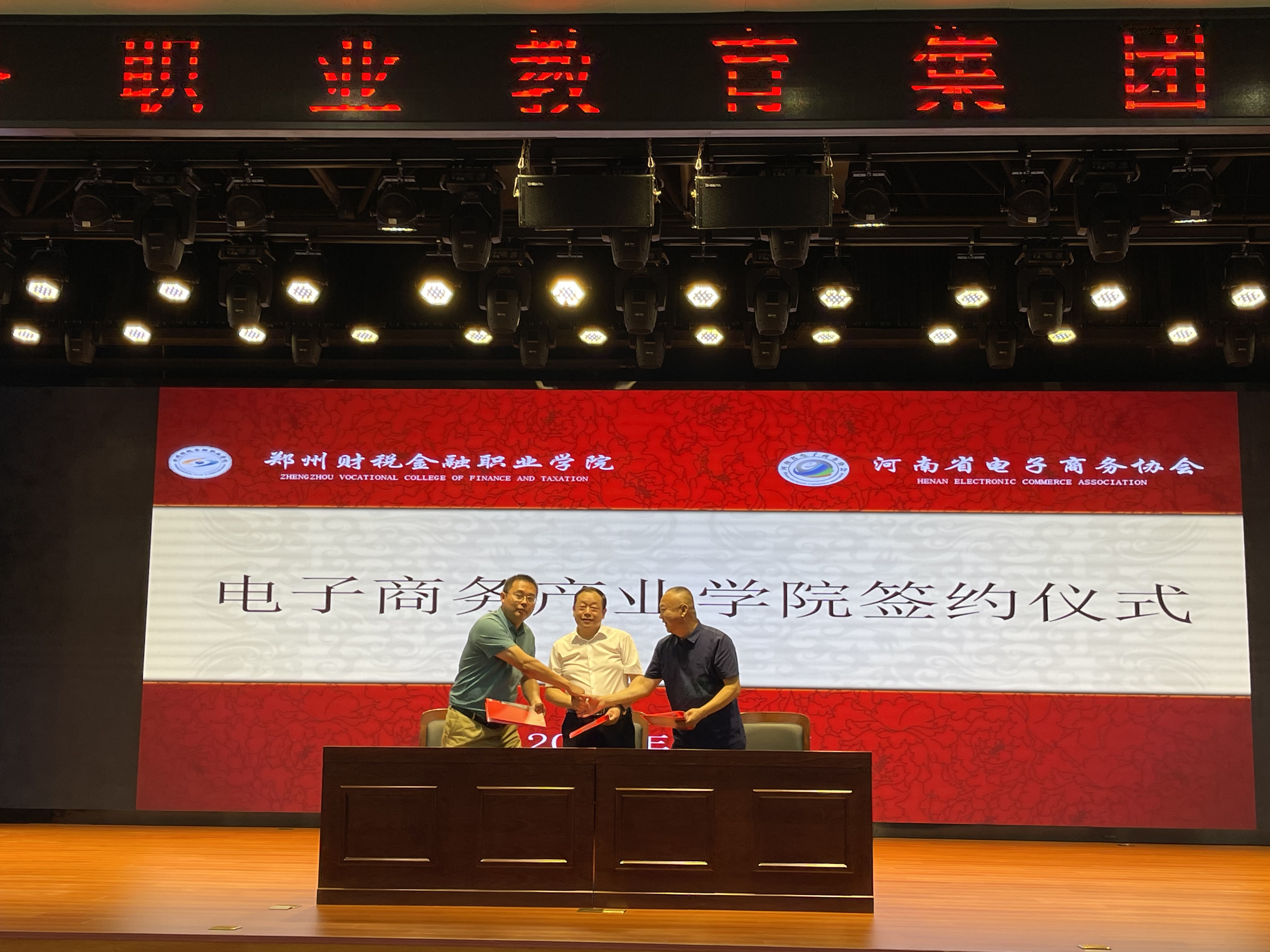 10点30分,在换届大会暨2021年会现场,作为电商职教集团副理事长单位代表,pp电子游戏平台网站国际工商学院院长孙权、河南省电商职教集团理事长程慎,郑州正方房地产实业有限公司董事长樊敬国,三方签署了《共建河南省电商职教集团网络直播产业学院战略合作框架协议》。