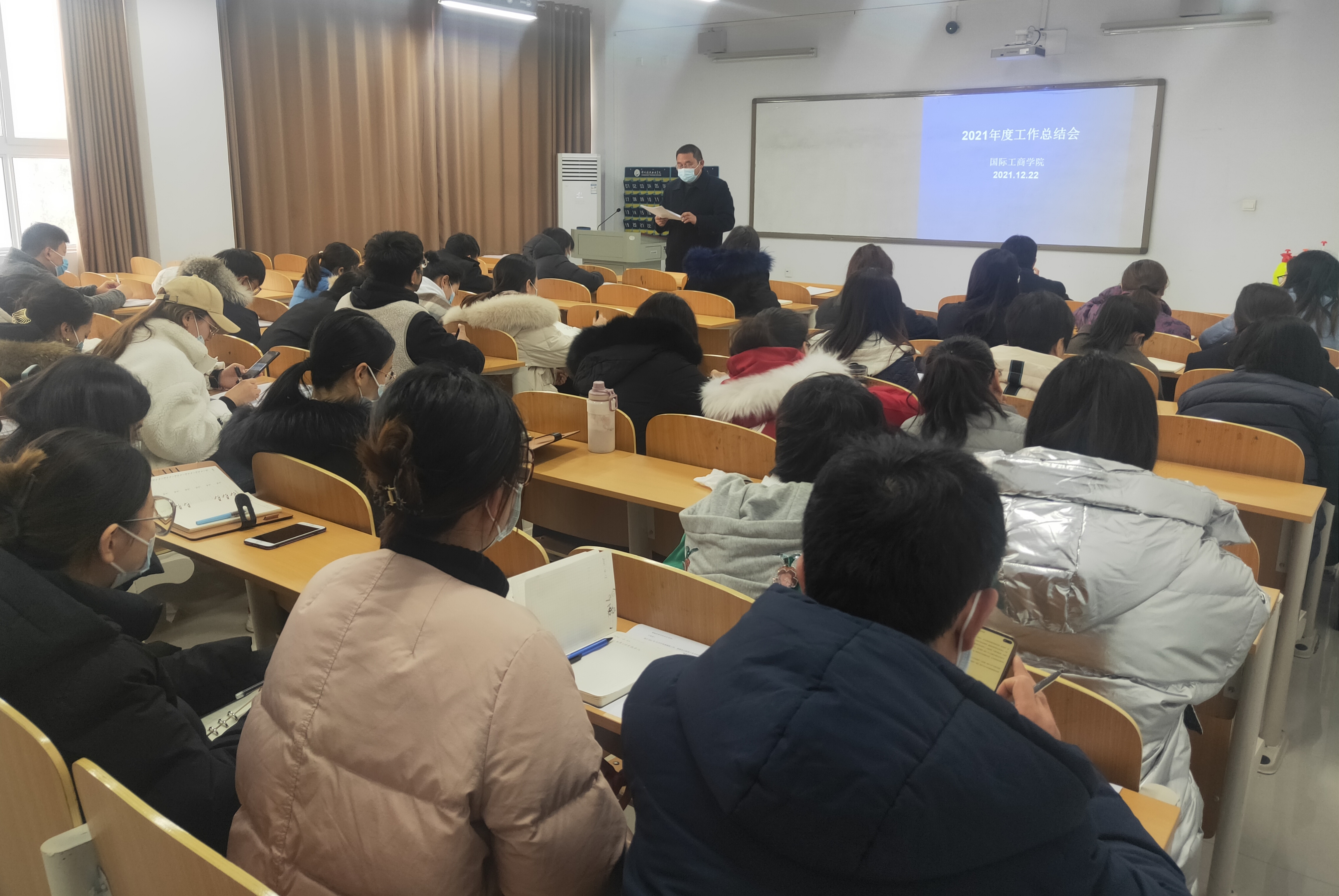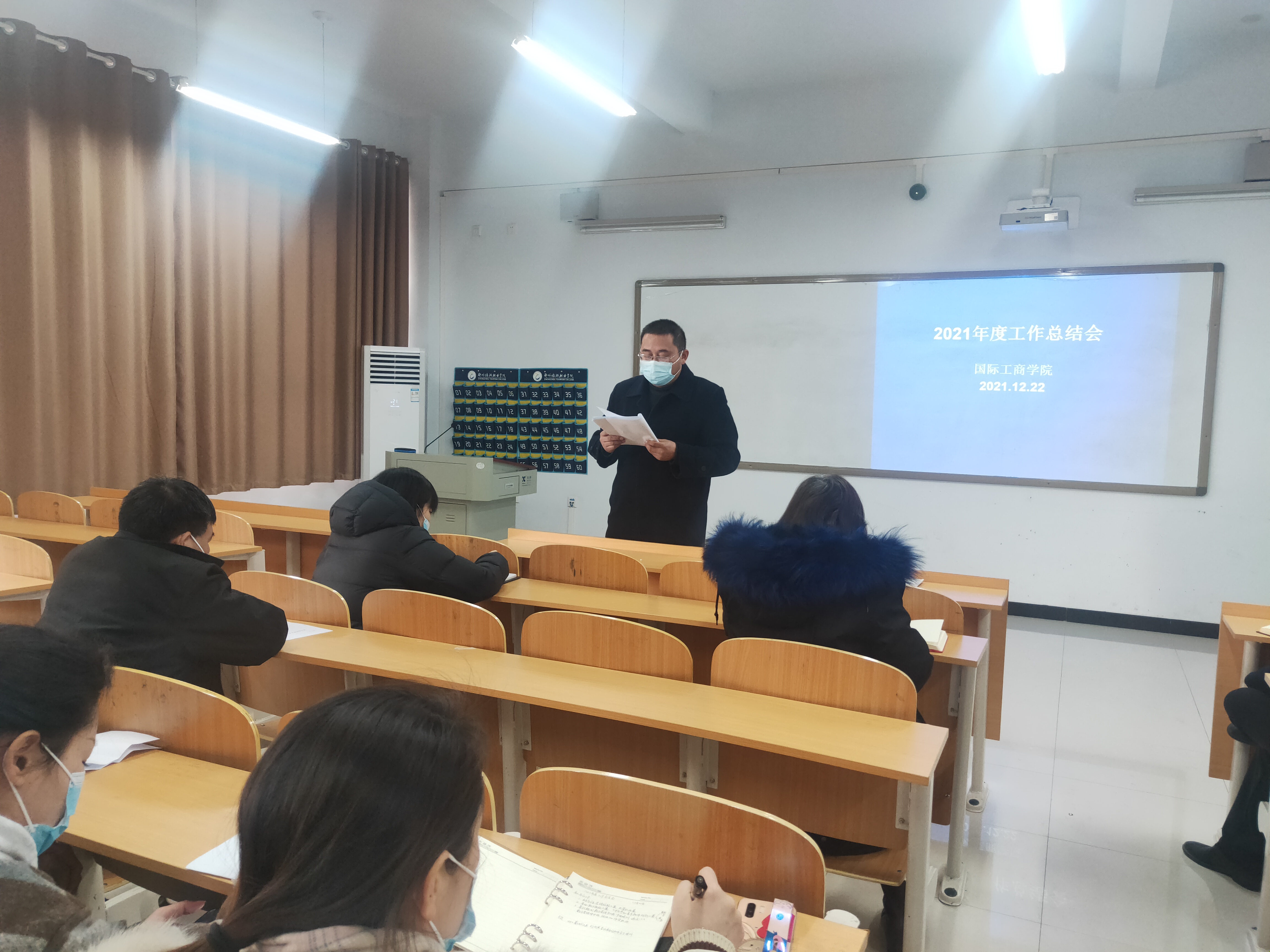 12月22日,国际工商学院在1B203教室召开2021年度工作总结会,回顾总结2021年度各项工作的完成情况,谋划下一年的工作构想。国际工商学院党总支书记张鹏、副院长郭崖、全体教师参加。会议由国际工商学院孙权院长主持。