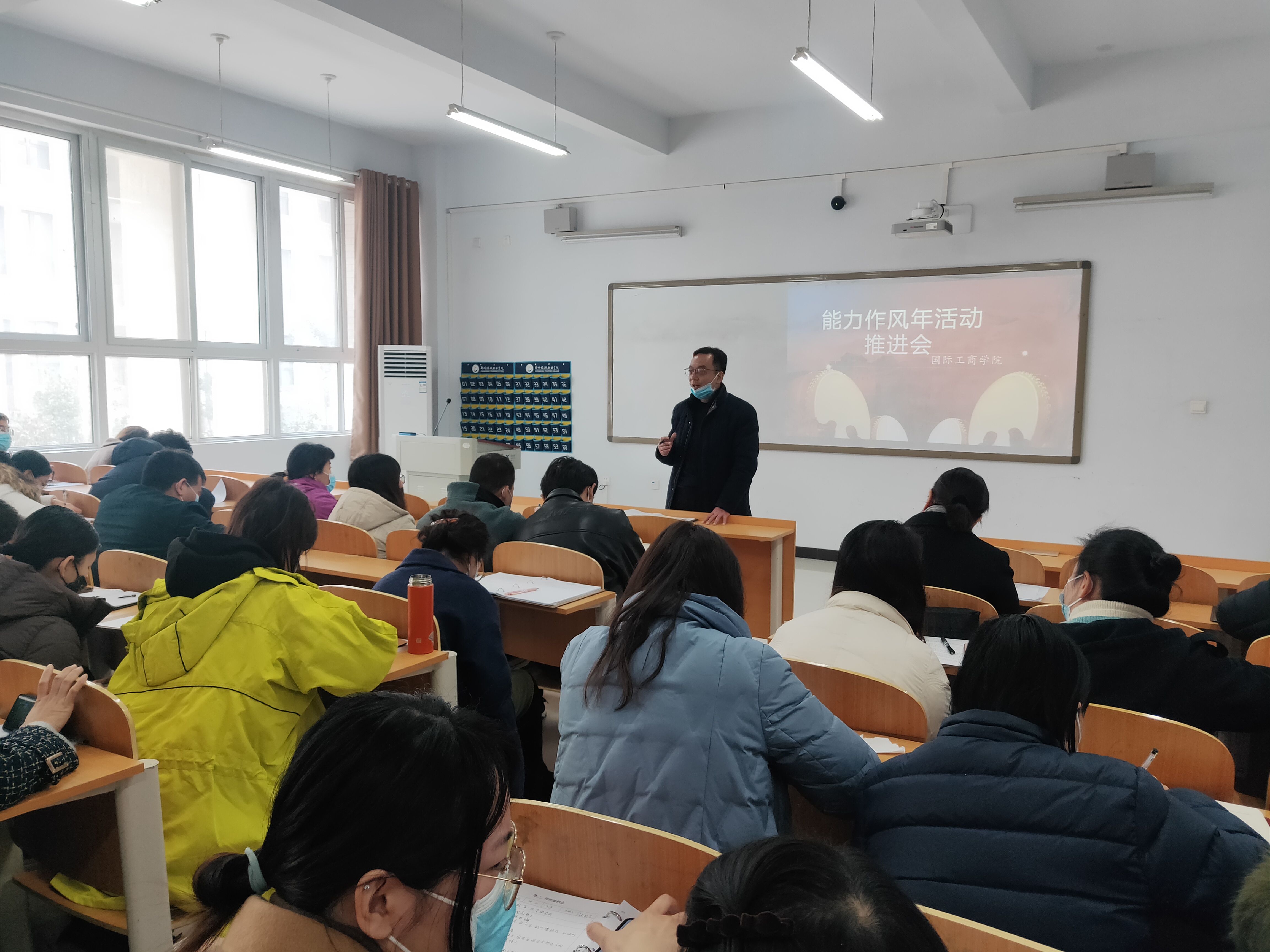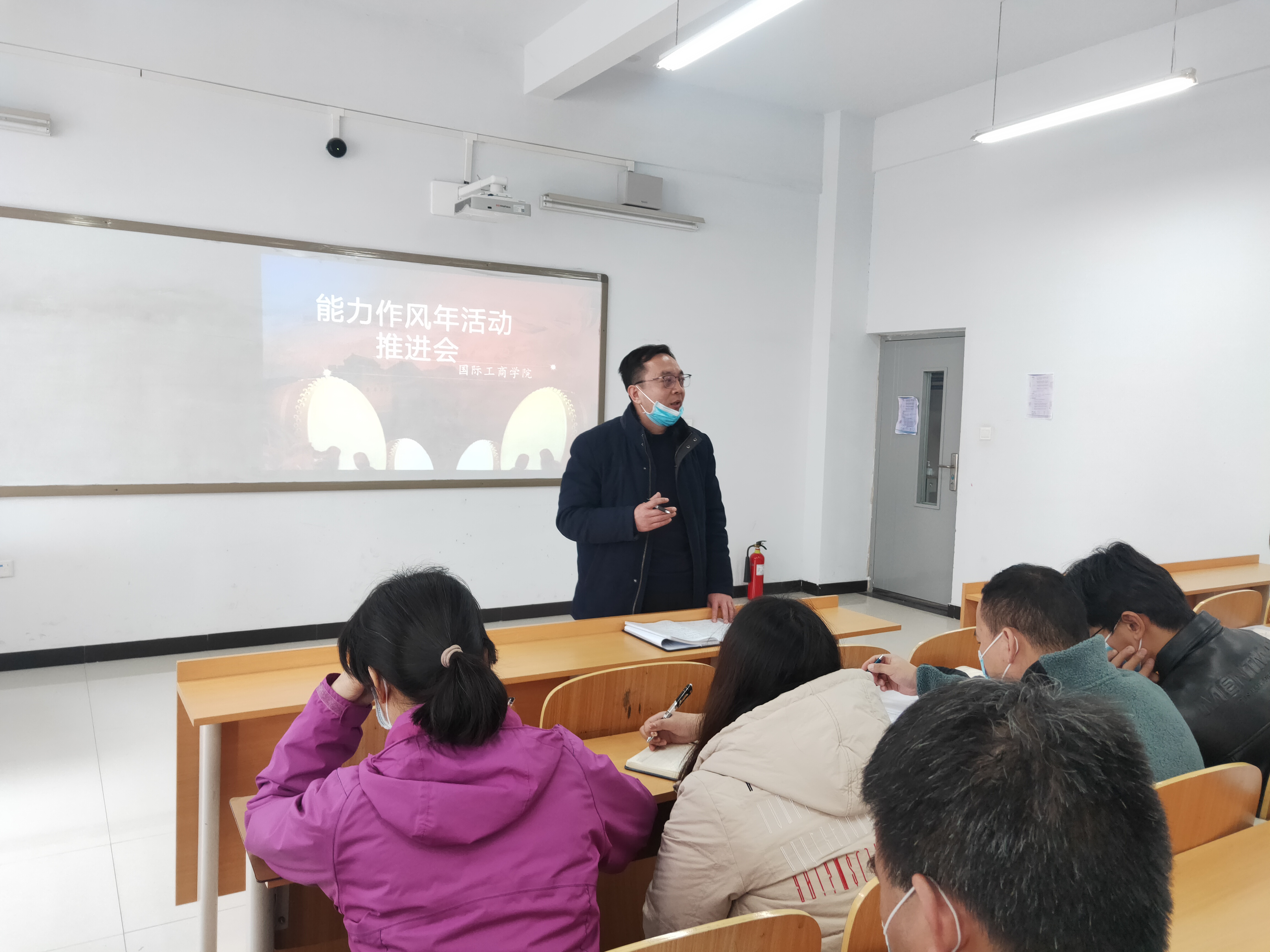 为深入学习贯彻党的十九届六中全会精神,推进“能力作风建设年”活动走深走实,2022年2月25日,国际工商学院在1B203室召开“能力作风建设年”活动推进会。国际工商学院学院院长孙权、副院长郭崖、全体党员干部、教职工参会。会议由国际工商学院党总支书记张鹏主持。