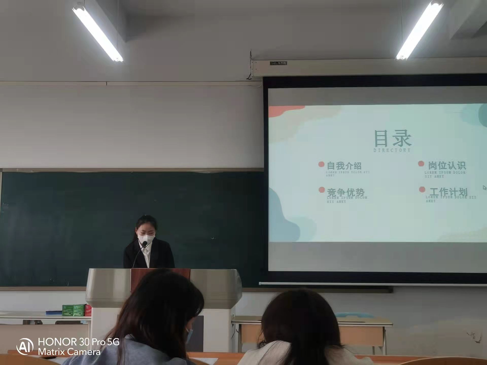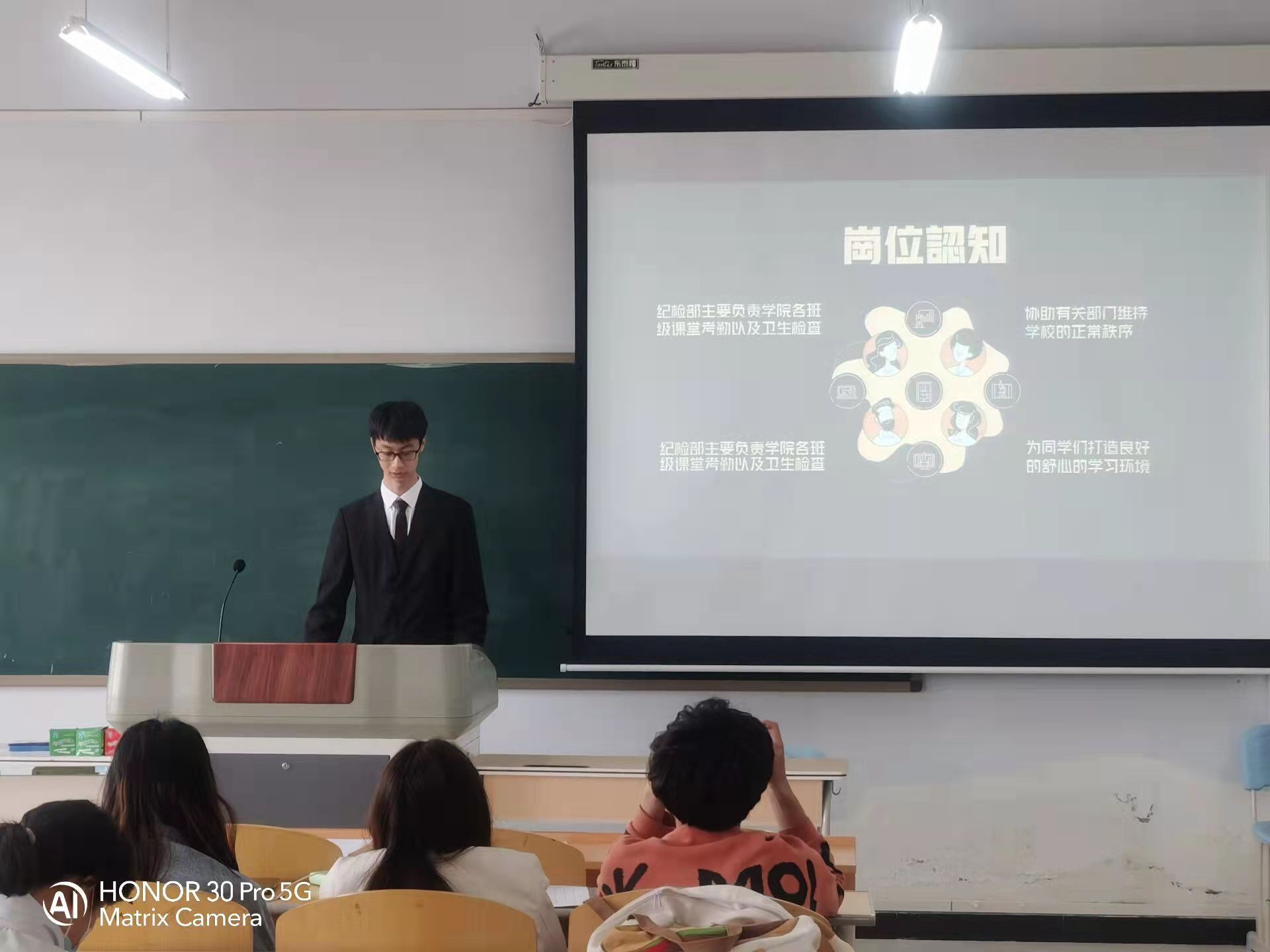 随后,参加竞选的同学陆续上台演讲,分别从自己对部门的认识,在过去工作中取得的优异成绩,对未来工作的展望等方面做出竞选演讲。竞选的同学以饱满的热情讲述自己积极为同学服务的竞选志愿赢得了观众们的阵阵掌声和一片认可。参会老师与上届学团干部根据同学们的表现进行打分评选。