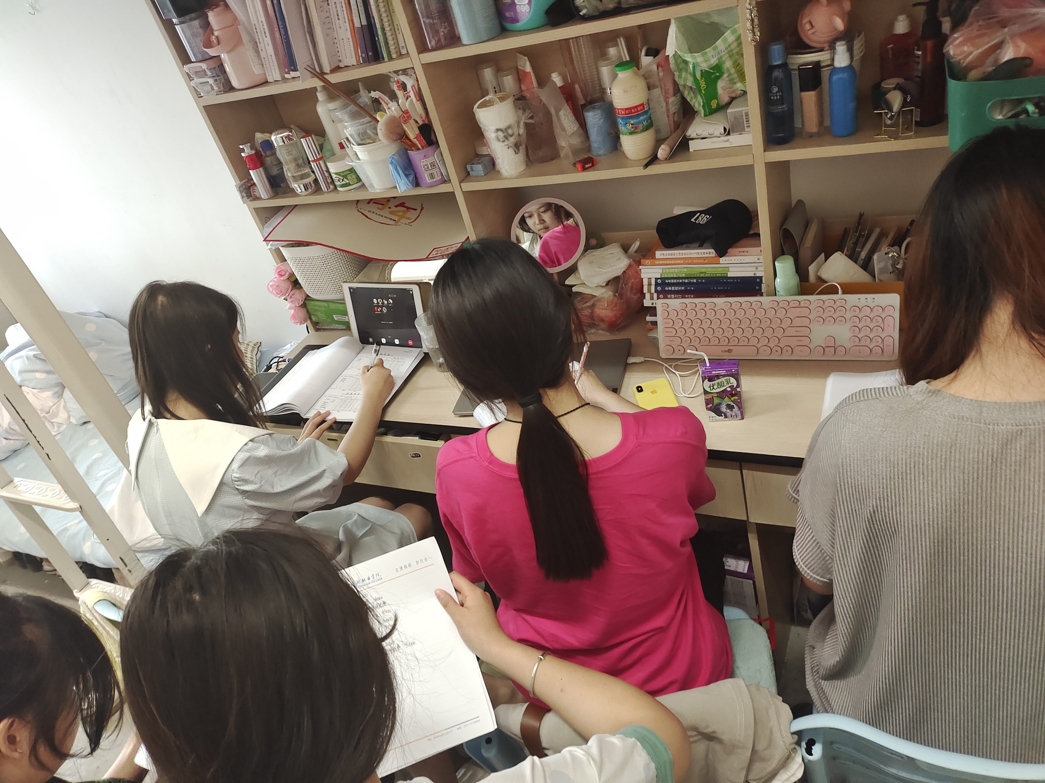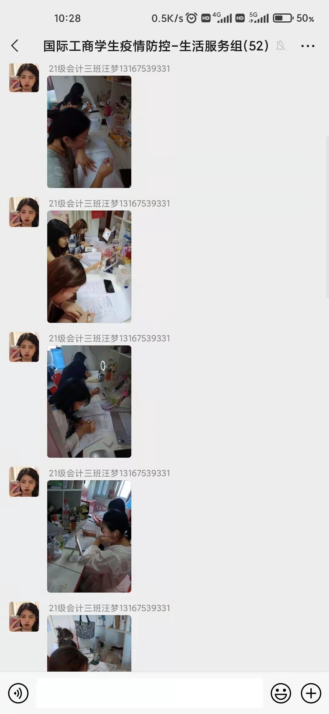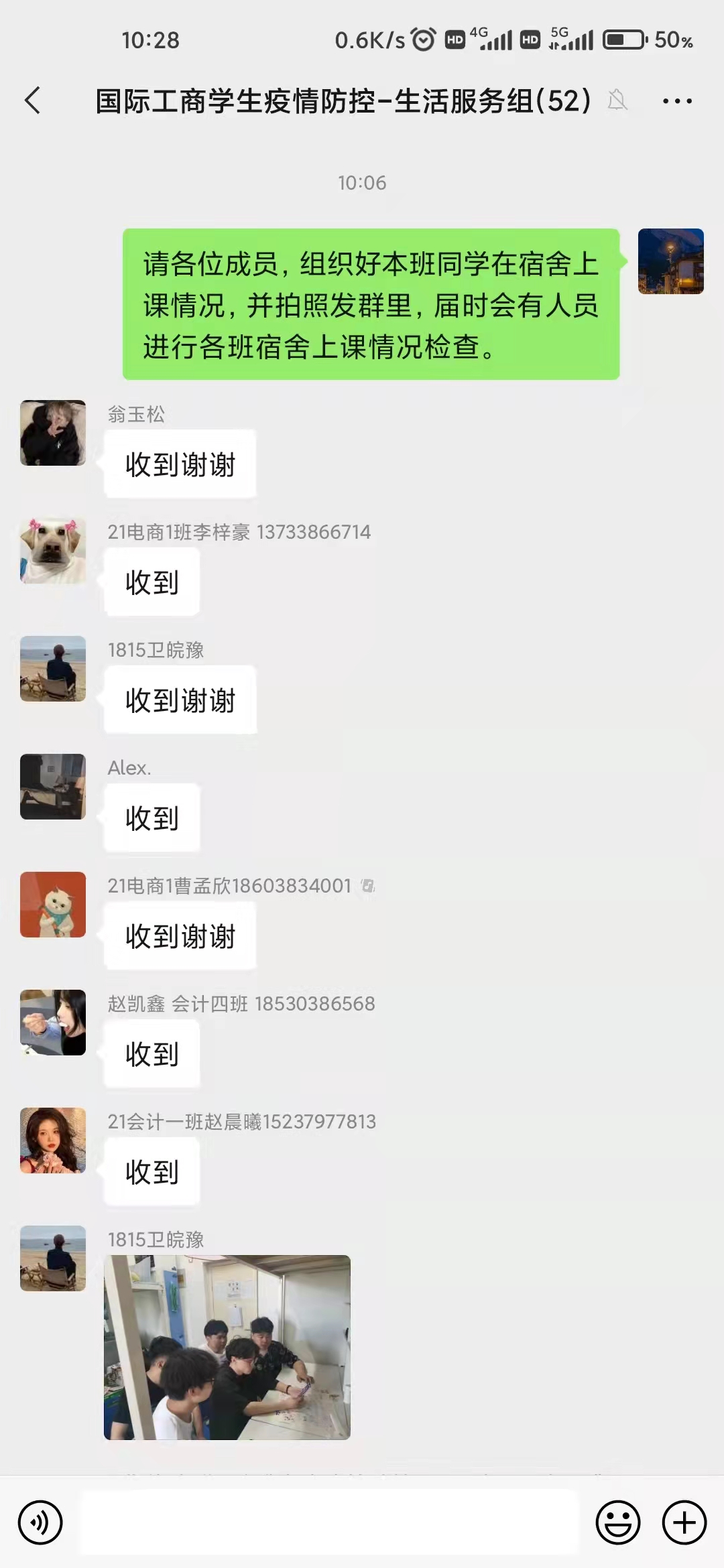 随后,通过面对面建群,建立相应的工作小组群,便于更好地开展防疫工作。在群聊中,大家按时汇报各班情况,及时沟通交流,进行意见反馈。各班寝室长配合各小组拍摄记录大家的上课过程,做到抗疫学习两手抓,保障同学们的正常生活。学团干事也会在自己负责的楼层进行检查,及时处理防疫、生活问题。