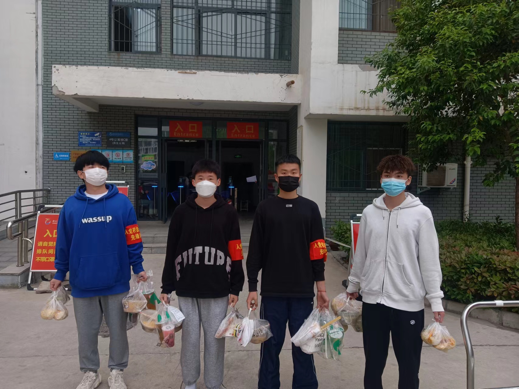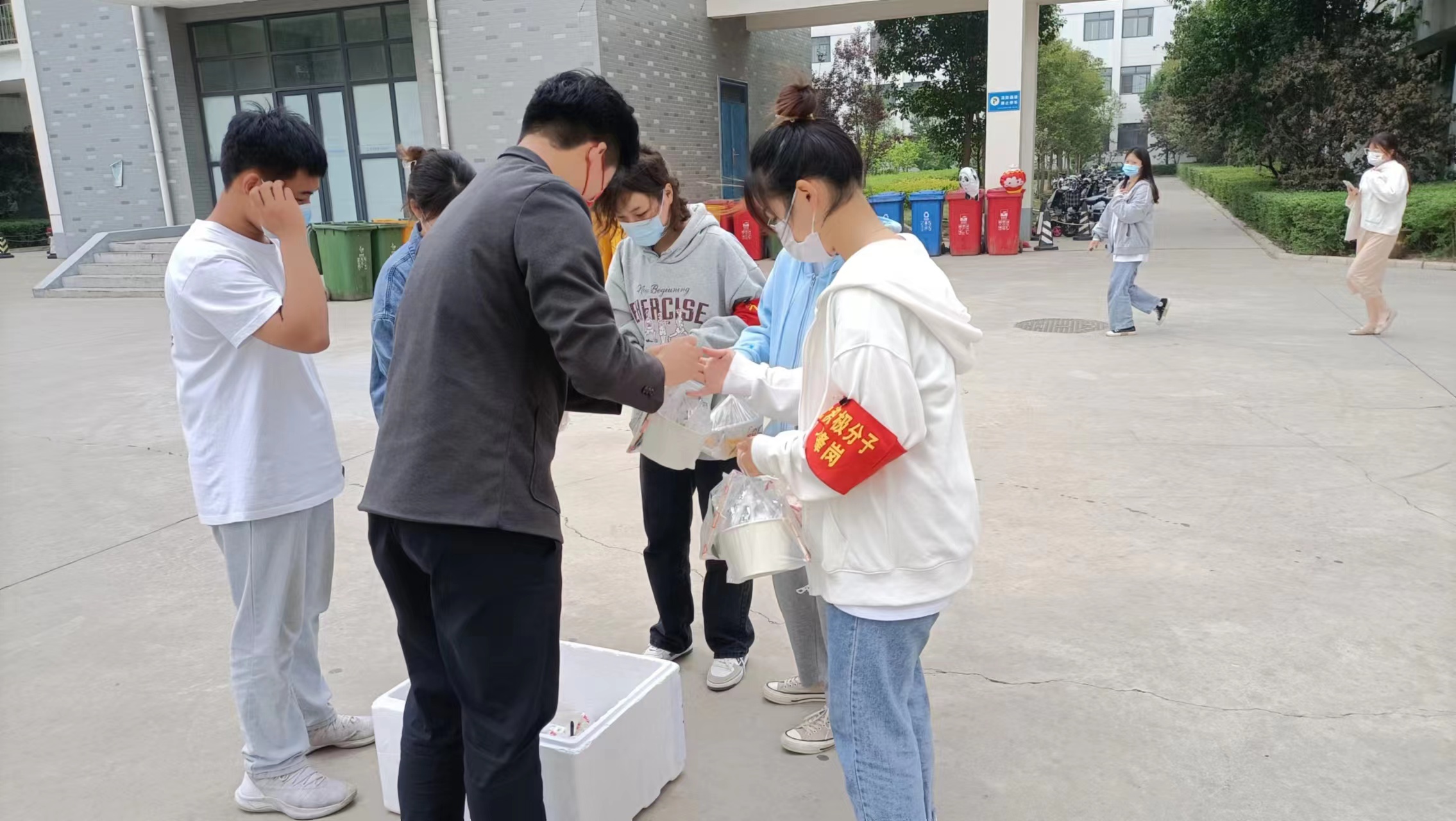 随着疫情形势的变化,有部分学生被隔离在宿舍,为了方便他们的生活,每到三餐时间,入党积极分子先锋队伍便为隔离在宿舍楼的同学送上可口的饭菜。其背后,是来来回回地统计每顿饭菜,是跑上跑下地奔波送饭,是耐心询问地解决学生的困难。保证了一日三餐,被隔离的同学也有了更充沛的精力进行线上学习,不再因“疫”而慌。