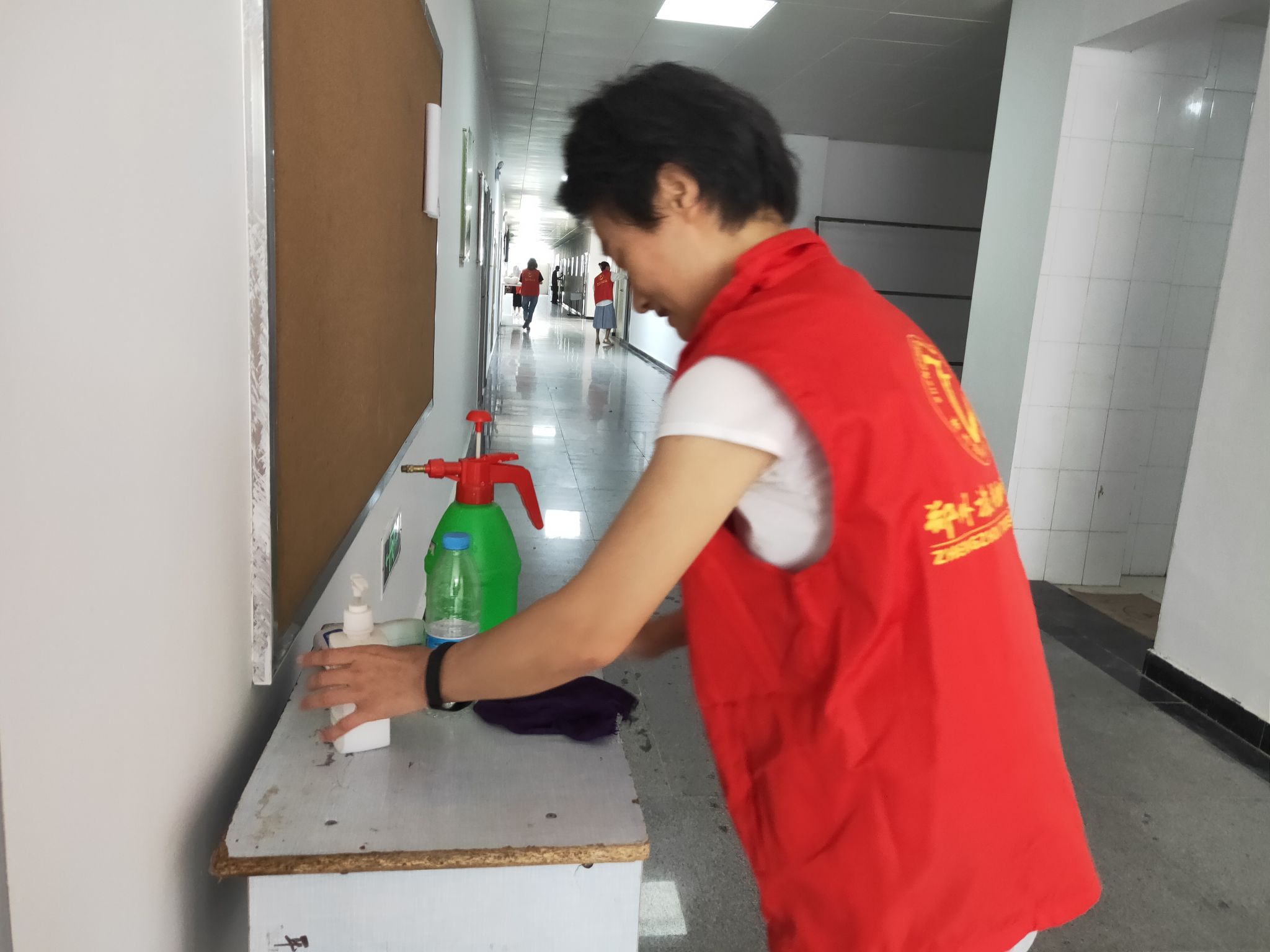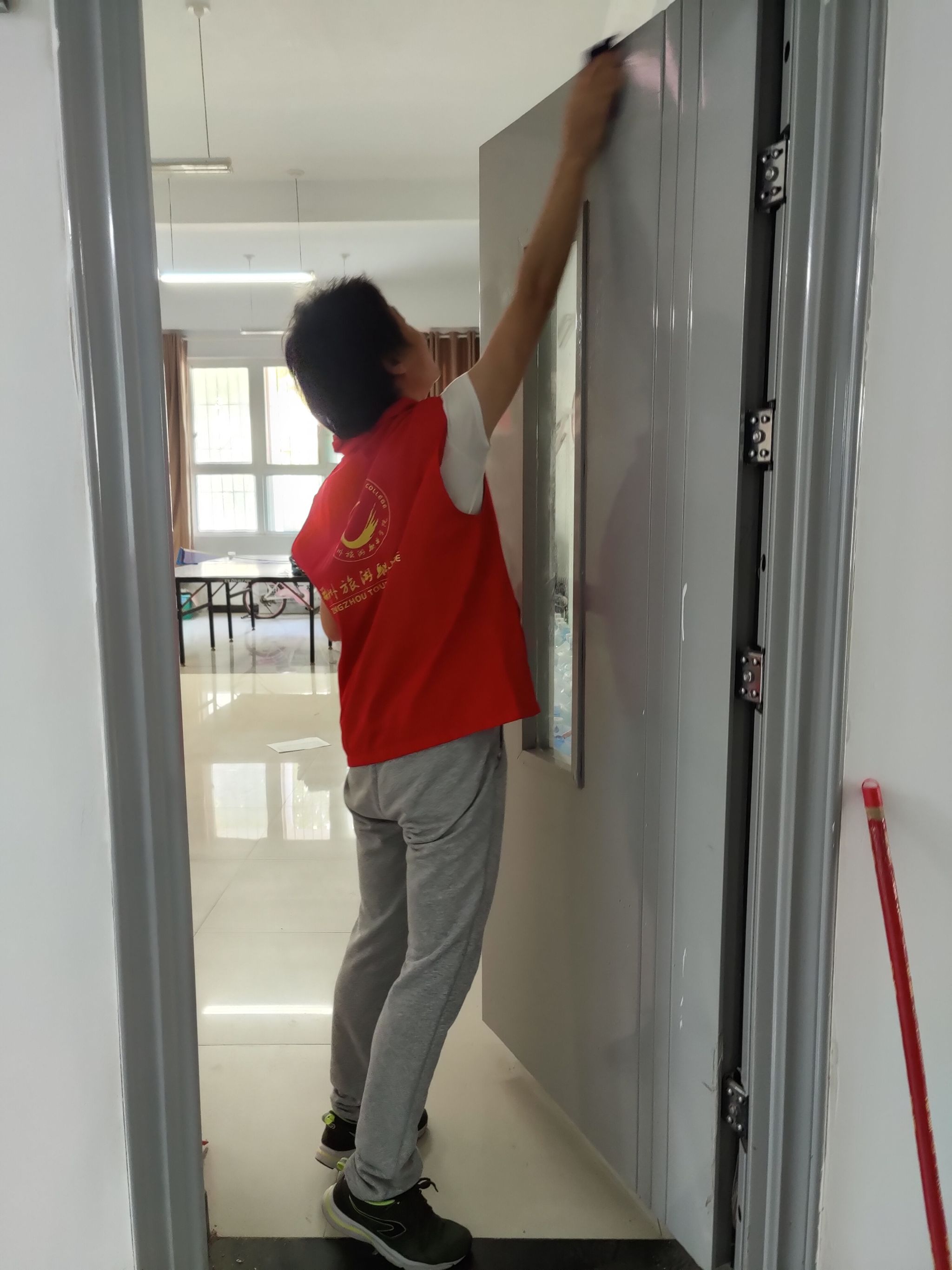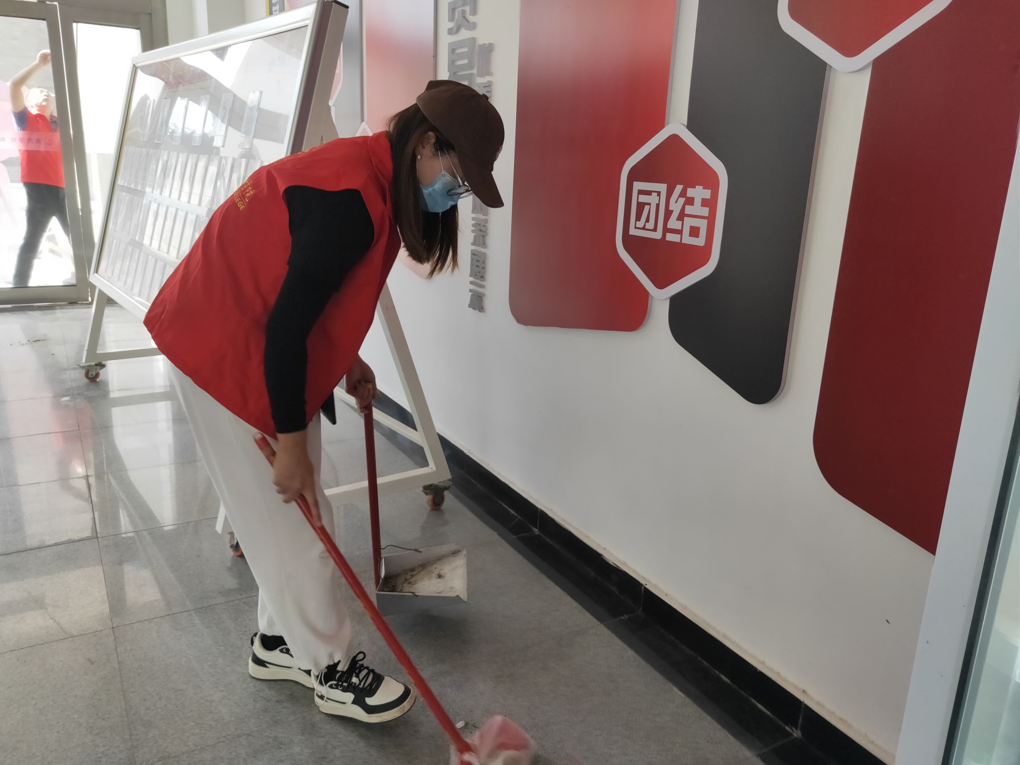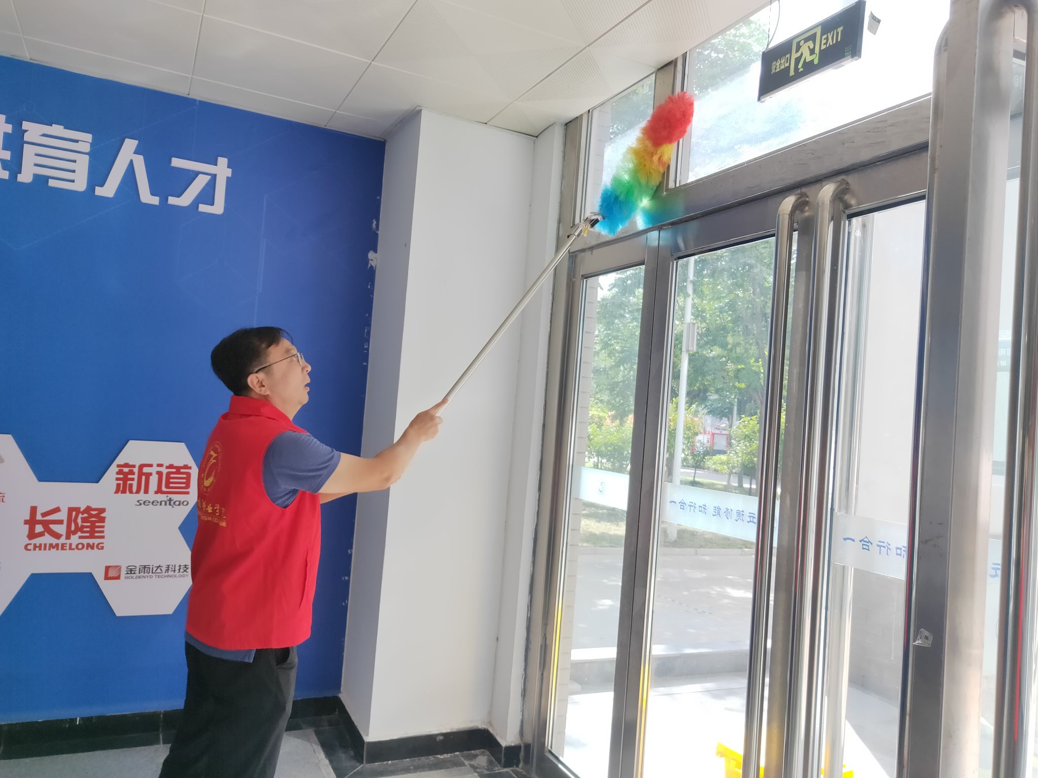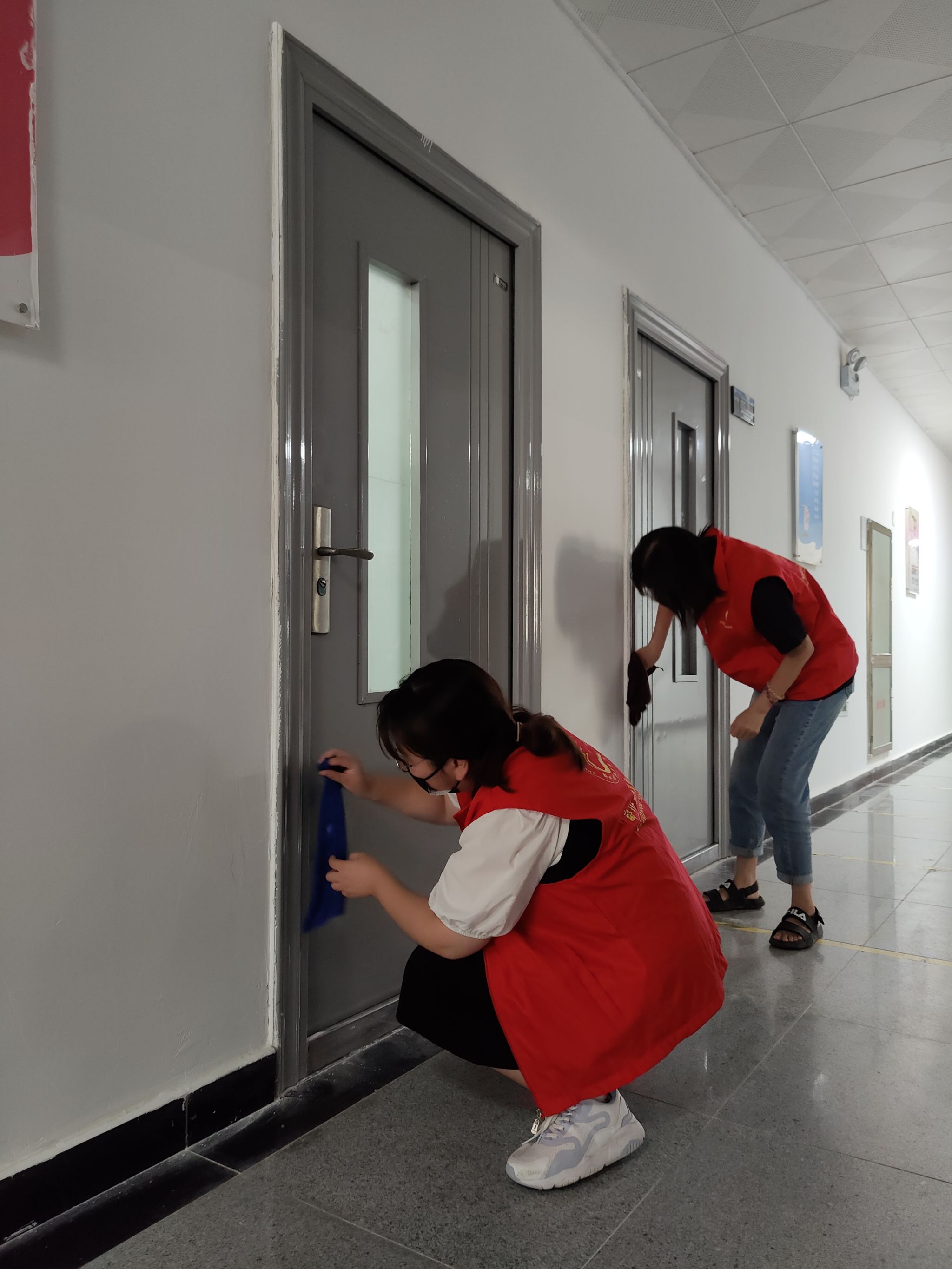 本次活动学院领导高度重视,亲自参与。在张鹏书记和孙权院长的带领下,我院教师穿戴红马甲,迅速行动起来,着手清理教学楼卫生。在活动中,大家分工合作,密切配合,纷纷拿起扫把和拖把对教学楼的地面进行彻底的清扫,利用抹布擦洗楼内的门窗、文化墙标识等。在大家的共同努力下,积尘了一个假期的教学楼环境卫生得到了改善,整体面貌焕然一新。