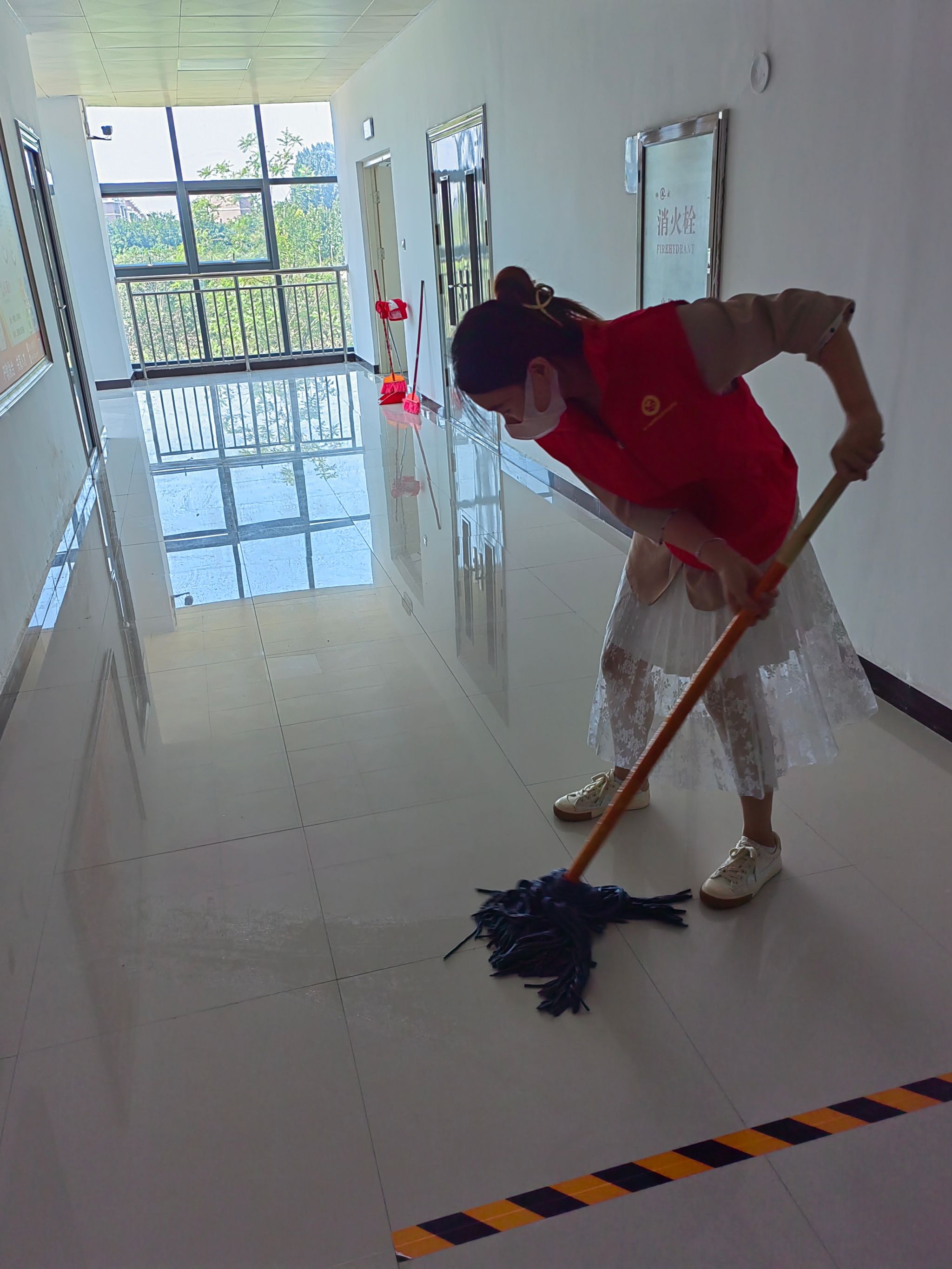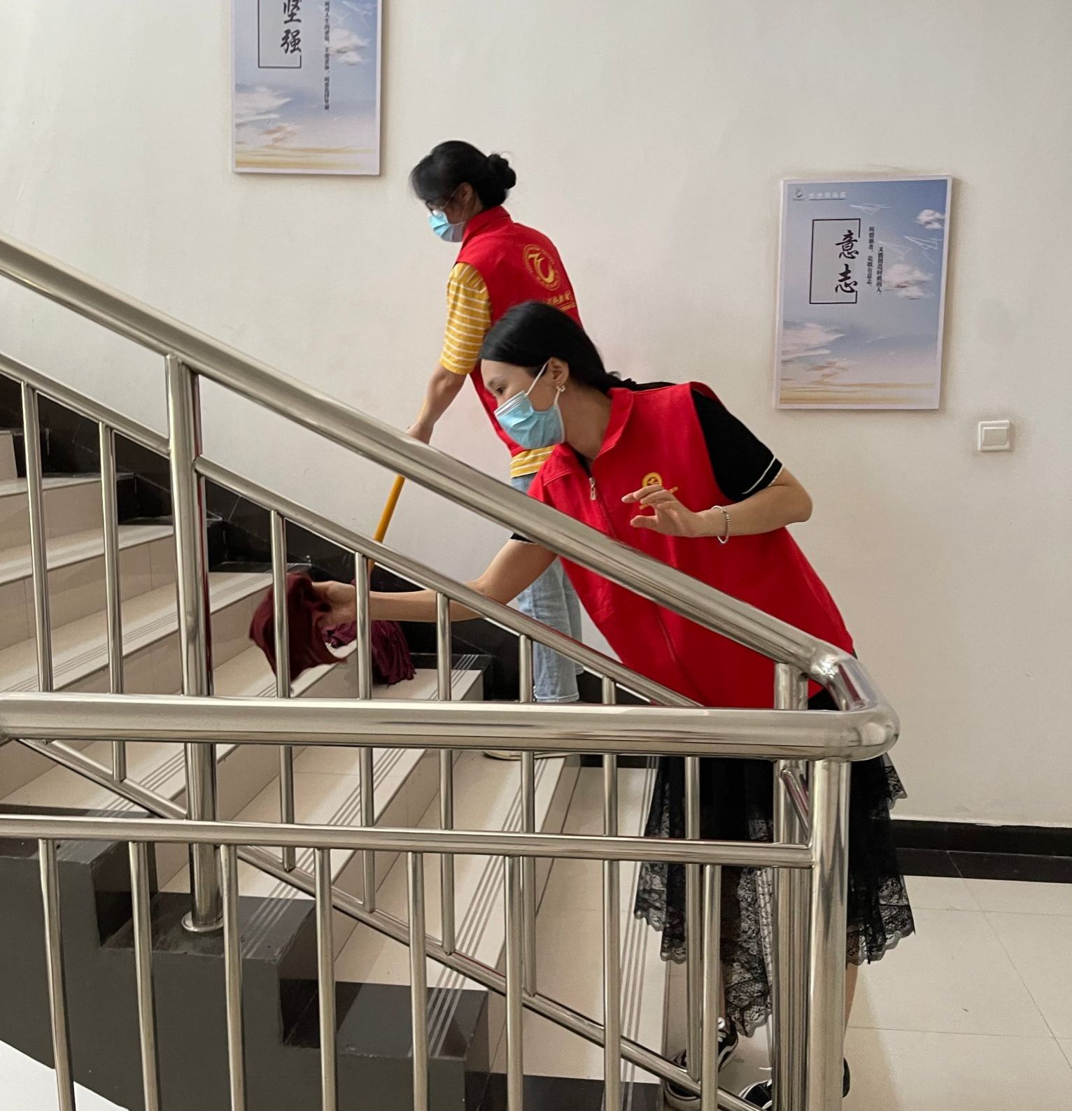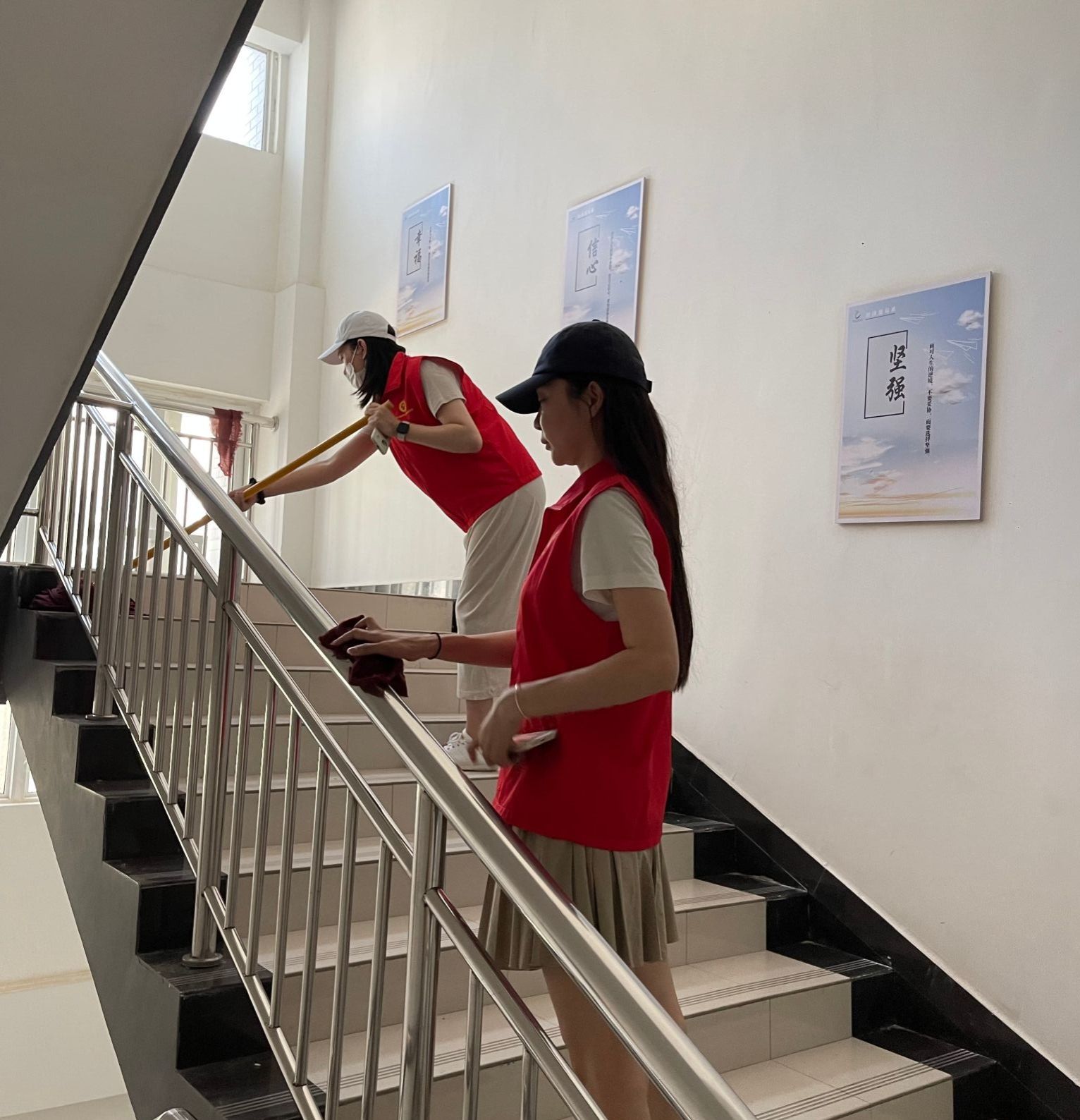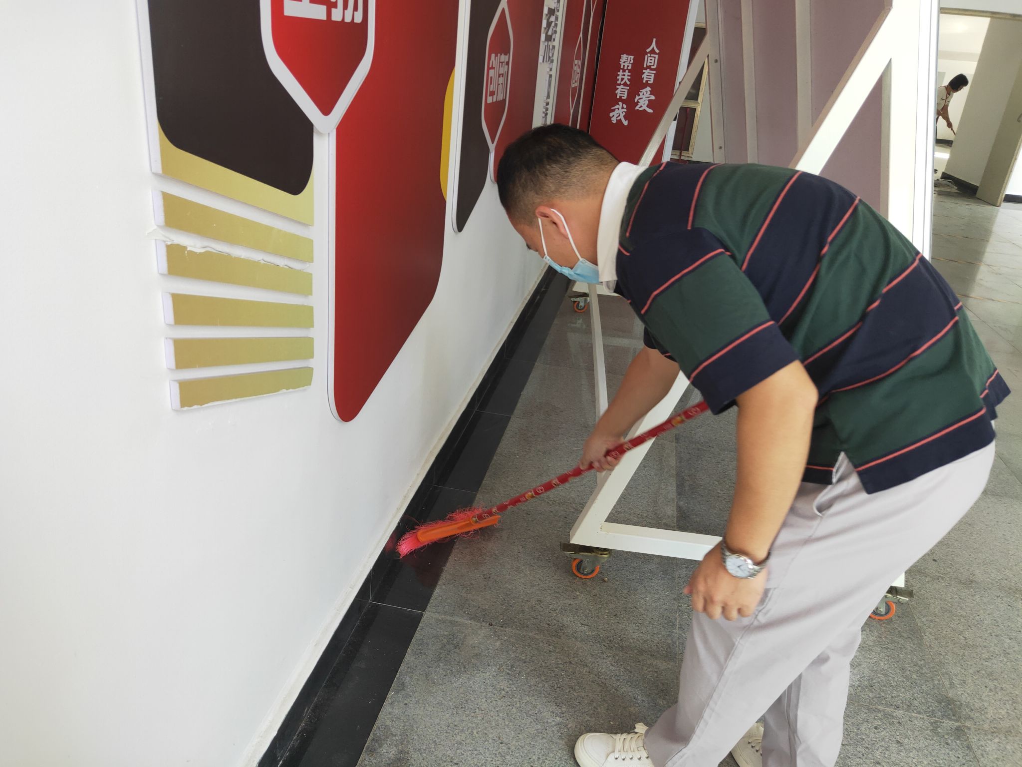 本次活动学院领导高度重视,亲自参与。在张鹏书记和孙权院长的带领下,我院教师穿戴红马甲,迅速行动起来,着手清理教学楼卫生。在活动中,大家分工合作,密切配合,纷纷拿起扫把和拖把对教学楼的地面进行彻底的清扫,利用抹布擦洗楼内的门窗、文化墙标识等。在大家的共同努力下,积尘了一个假期的教学楼环境卫生得到了改善,整体面貌焕然一新。
