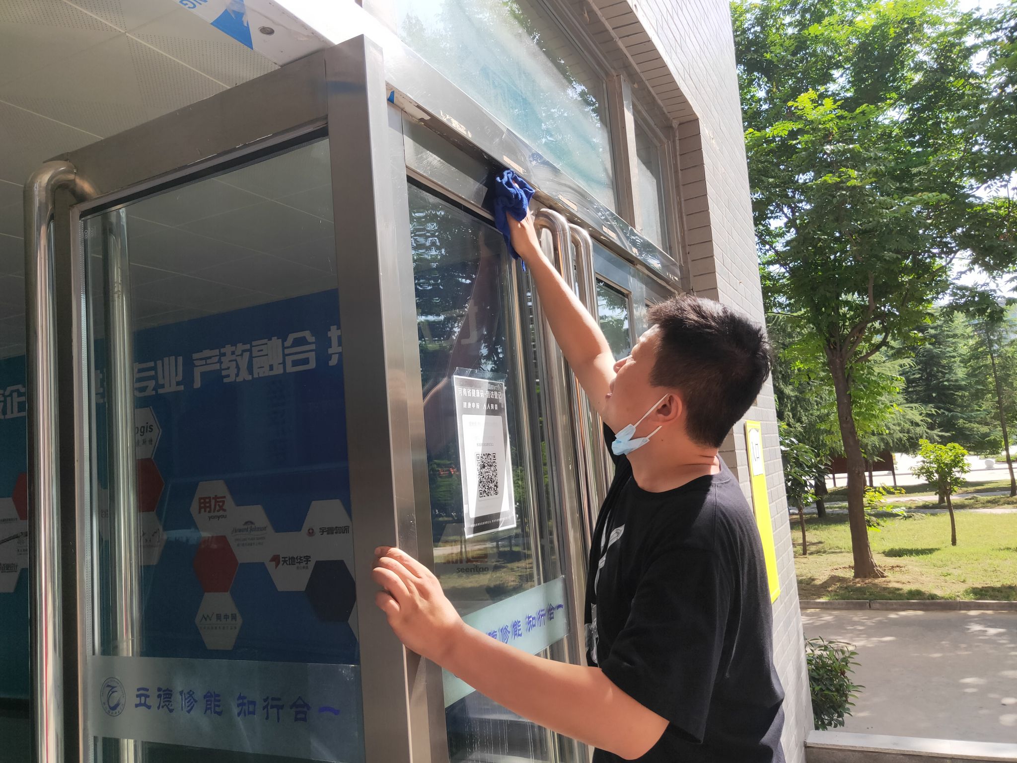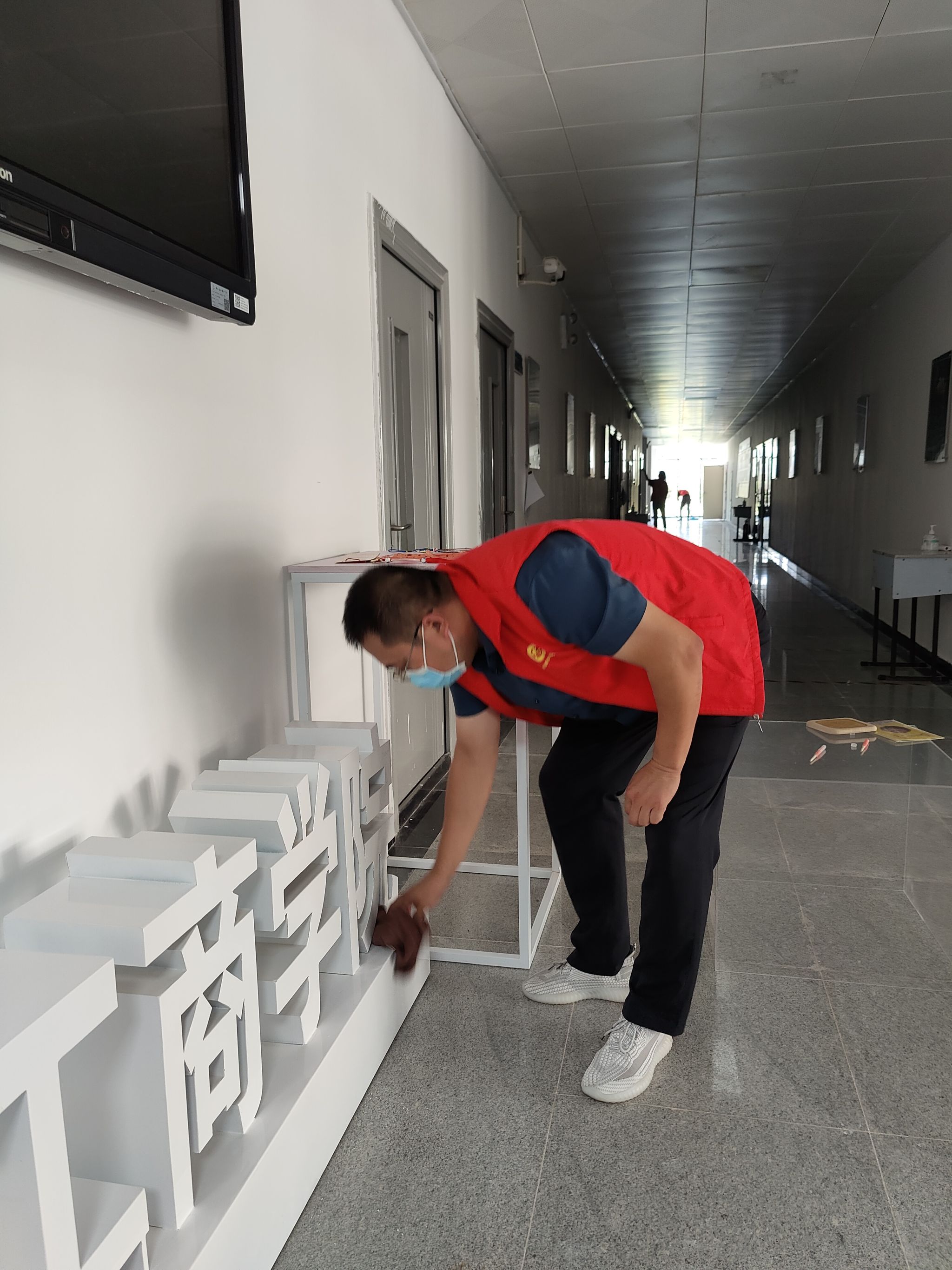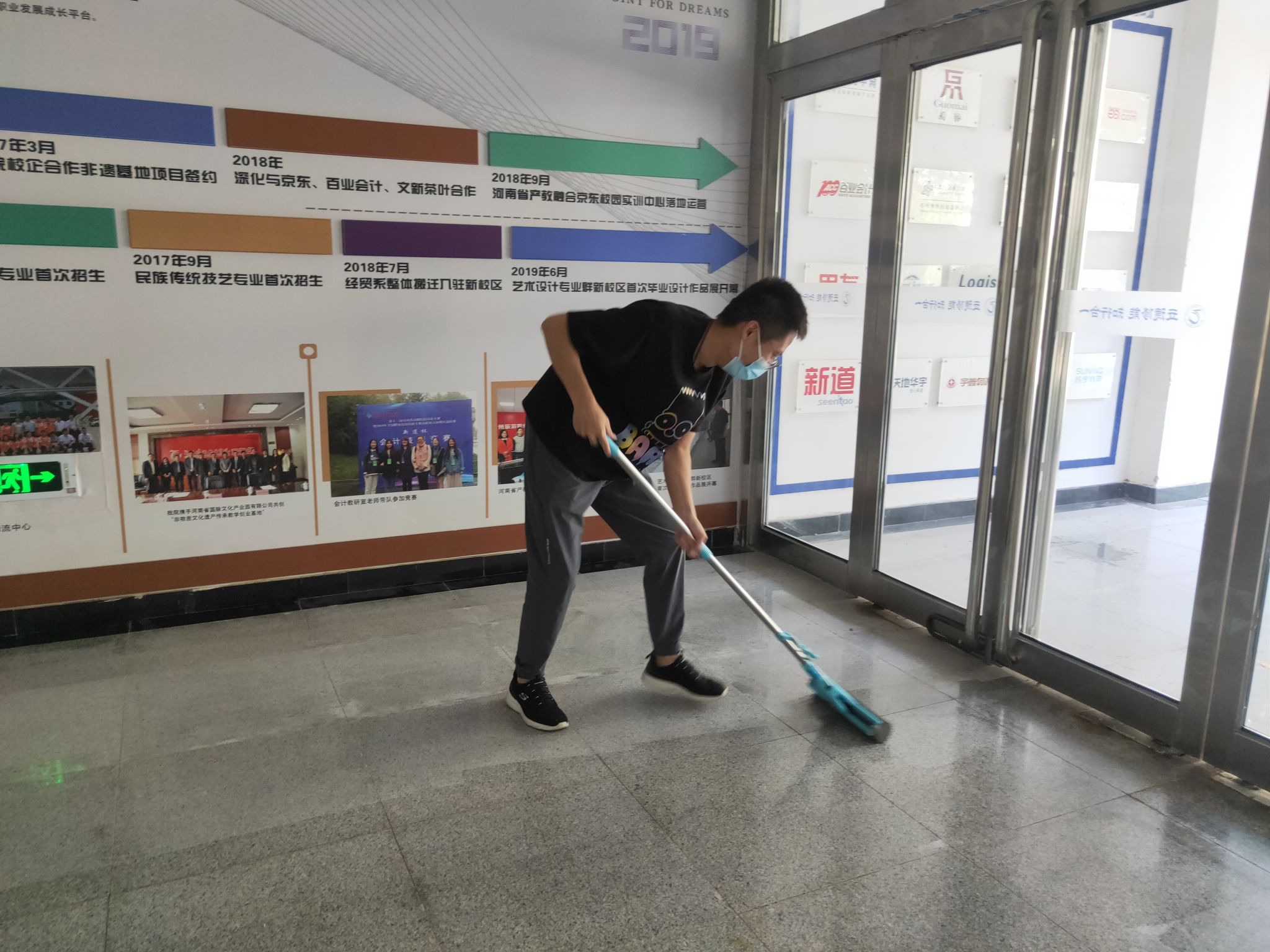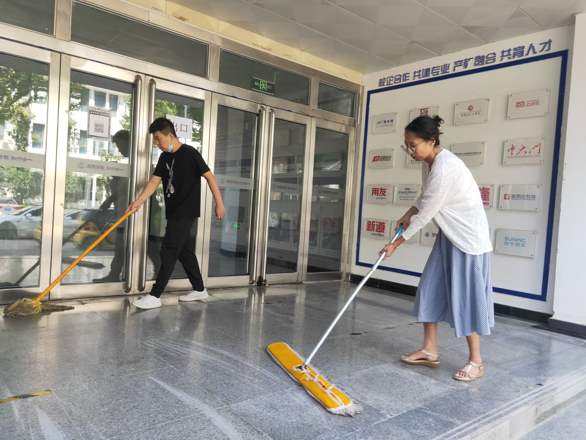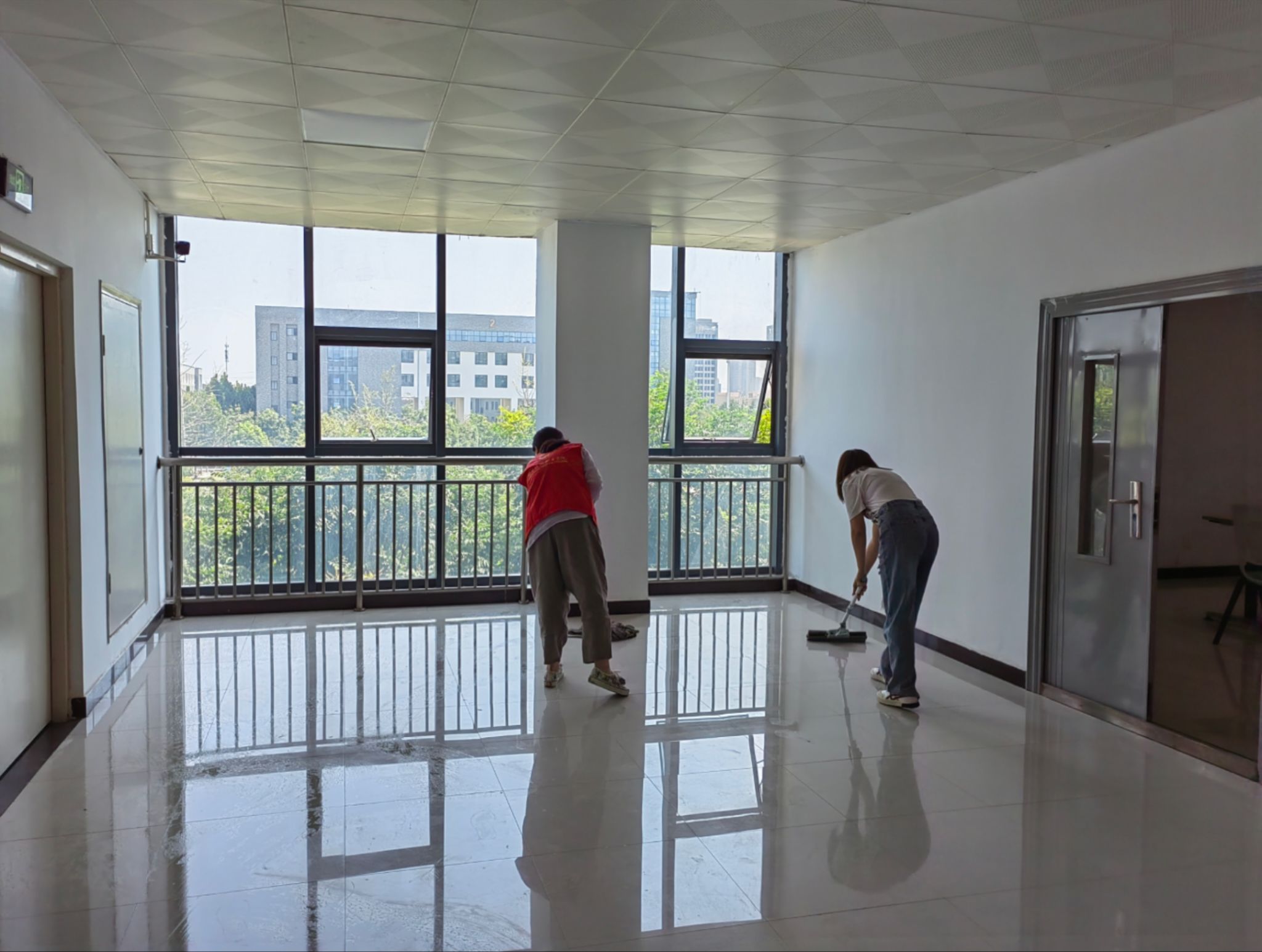 本次活动学院领导高度重视,亲自参与。在张鹏书记和孙权院长的带领下,我院教师穿戴红马甲,迅速行动起来,着手清理教学楼卫生。在活动中,大家分工合作,密切配合,纷纷拿起扫把和拖把对教学楼的地面进行彻底的清扫,利用抹布擦洗楼内的门窗、文化墙标识等。在大家的共同努力下,积尘了一个假期的教学楼环境卫生得到了改善,整体面貌焕然一新。