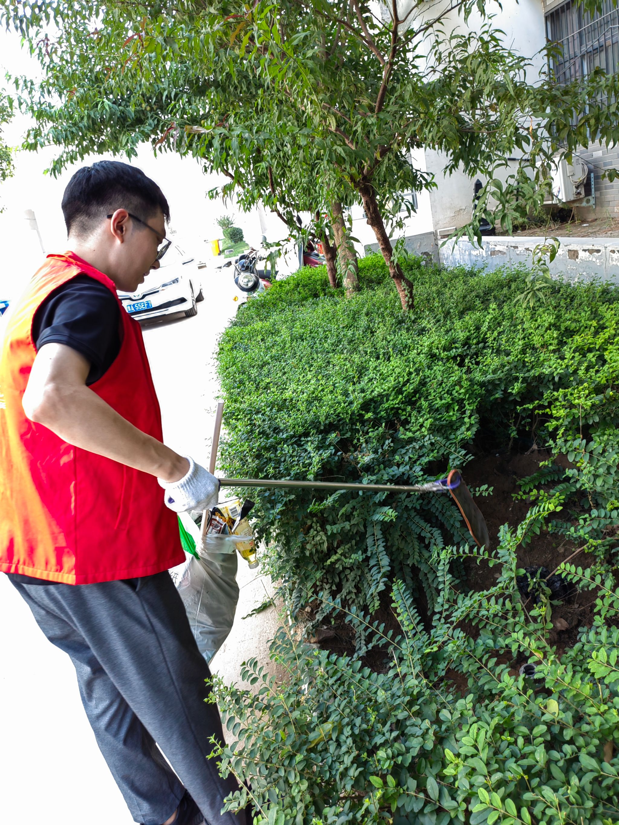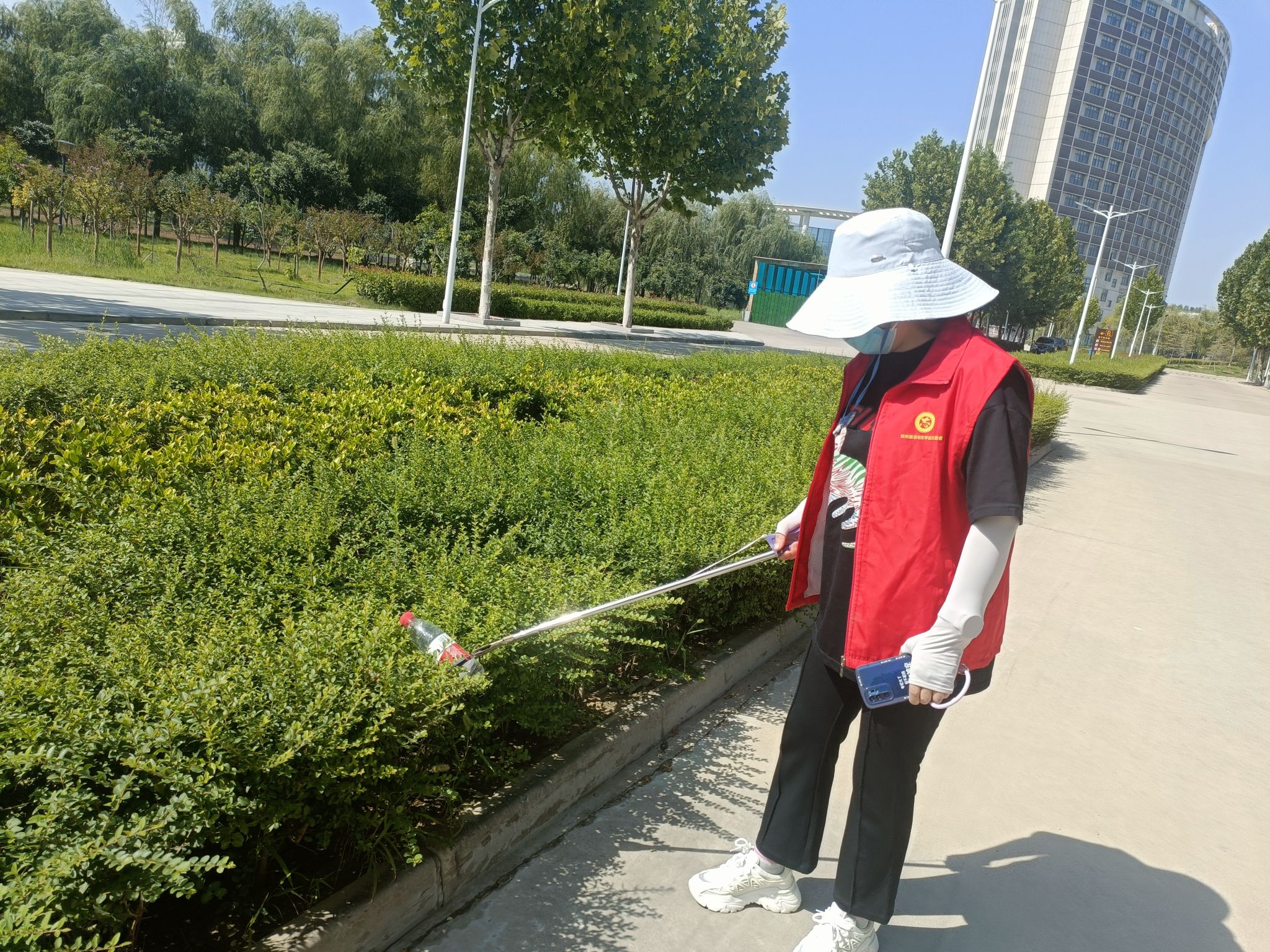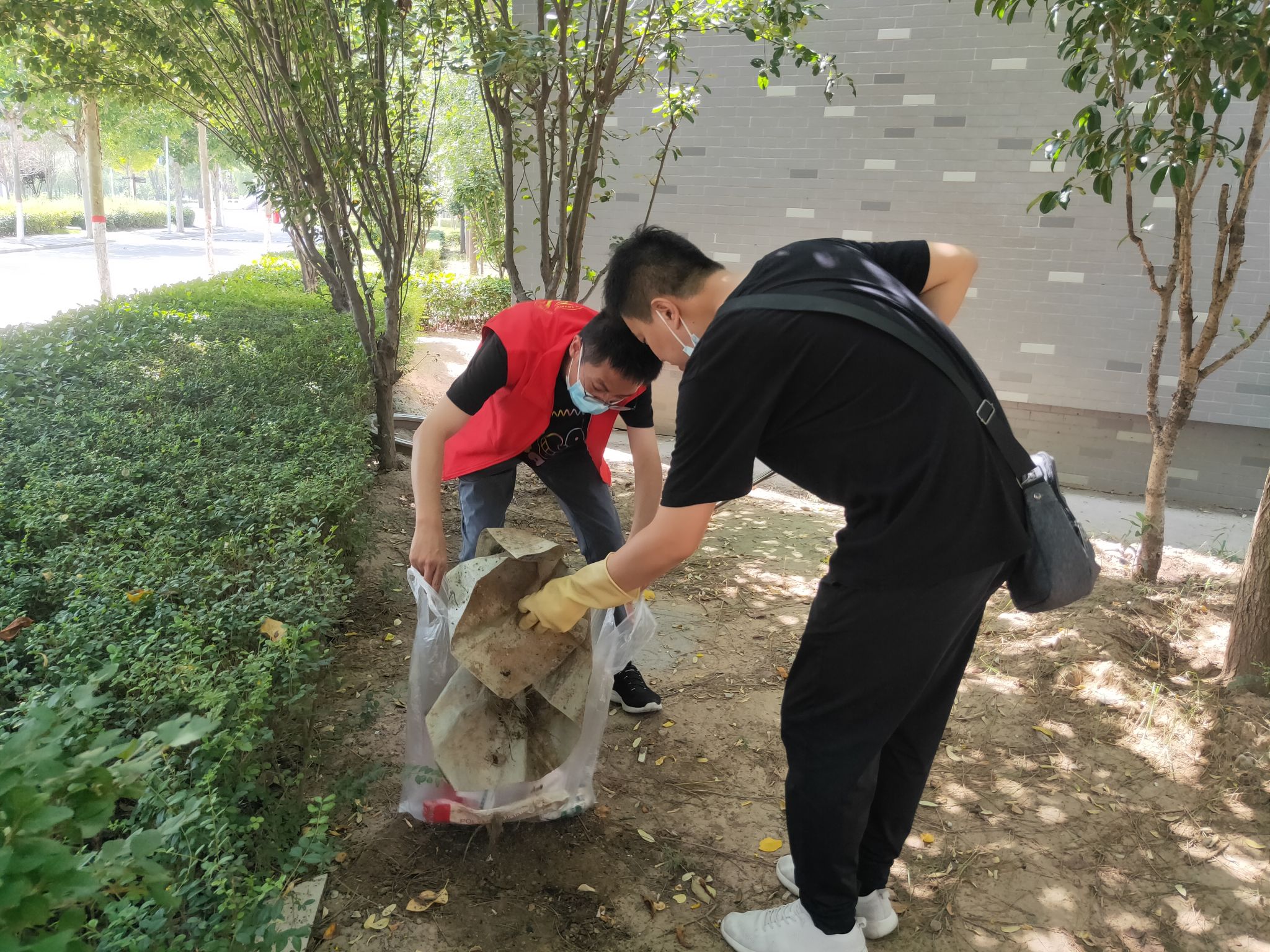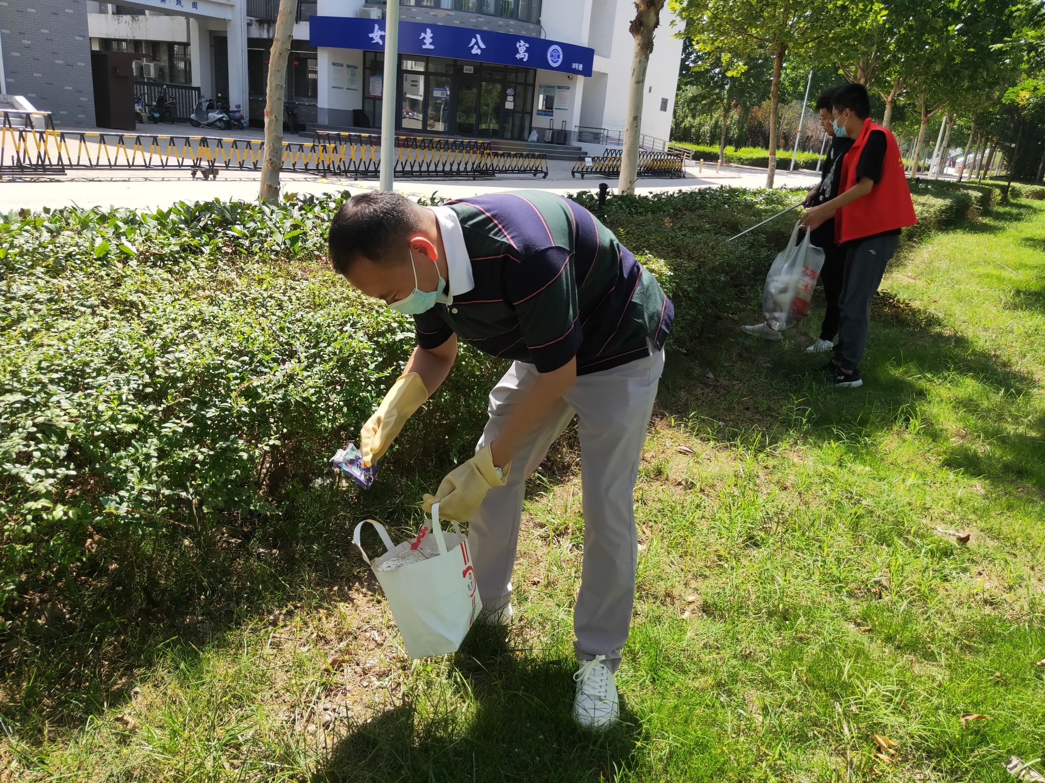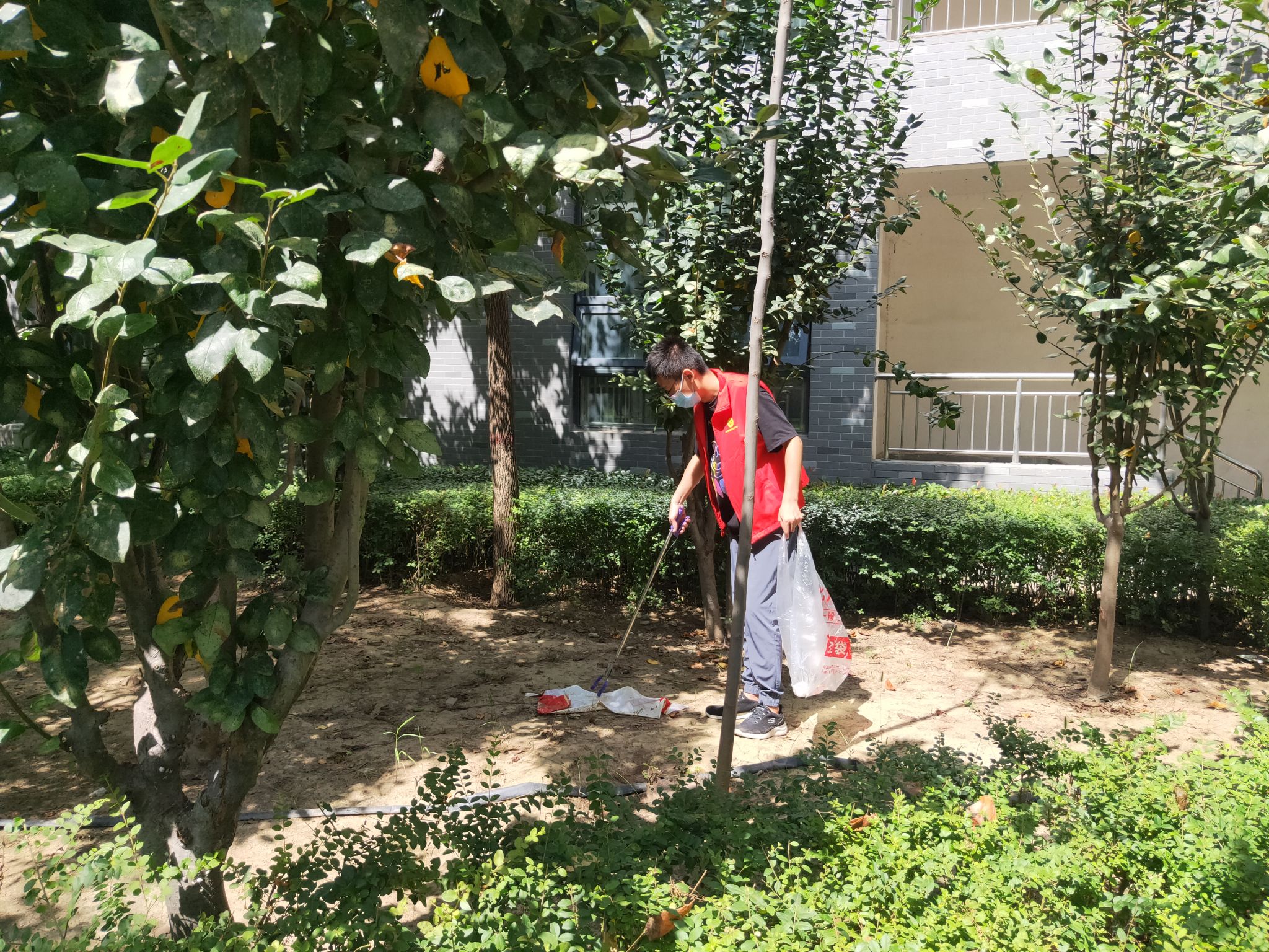 除此之外,我院教师还对学院分管的绿地区域进行了细致的清扫。虽然天气炎热,但教师们不怕脏、不怕累,不顾枝桠的剐蹭,捡起草坪上、绿化带丛中的各类垃圾,并分类处理,做到卫生无死角、无污物。经过大家的辛勤劳动,绿地区域的环境更加干净清爽,营造了浓厚的绿色校园氛围。