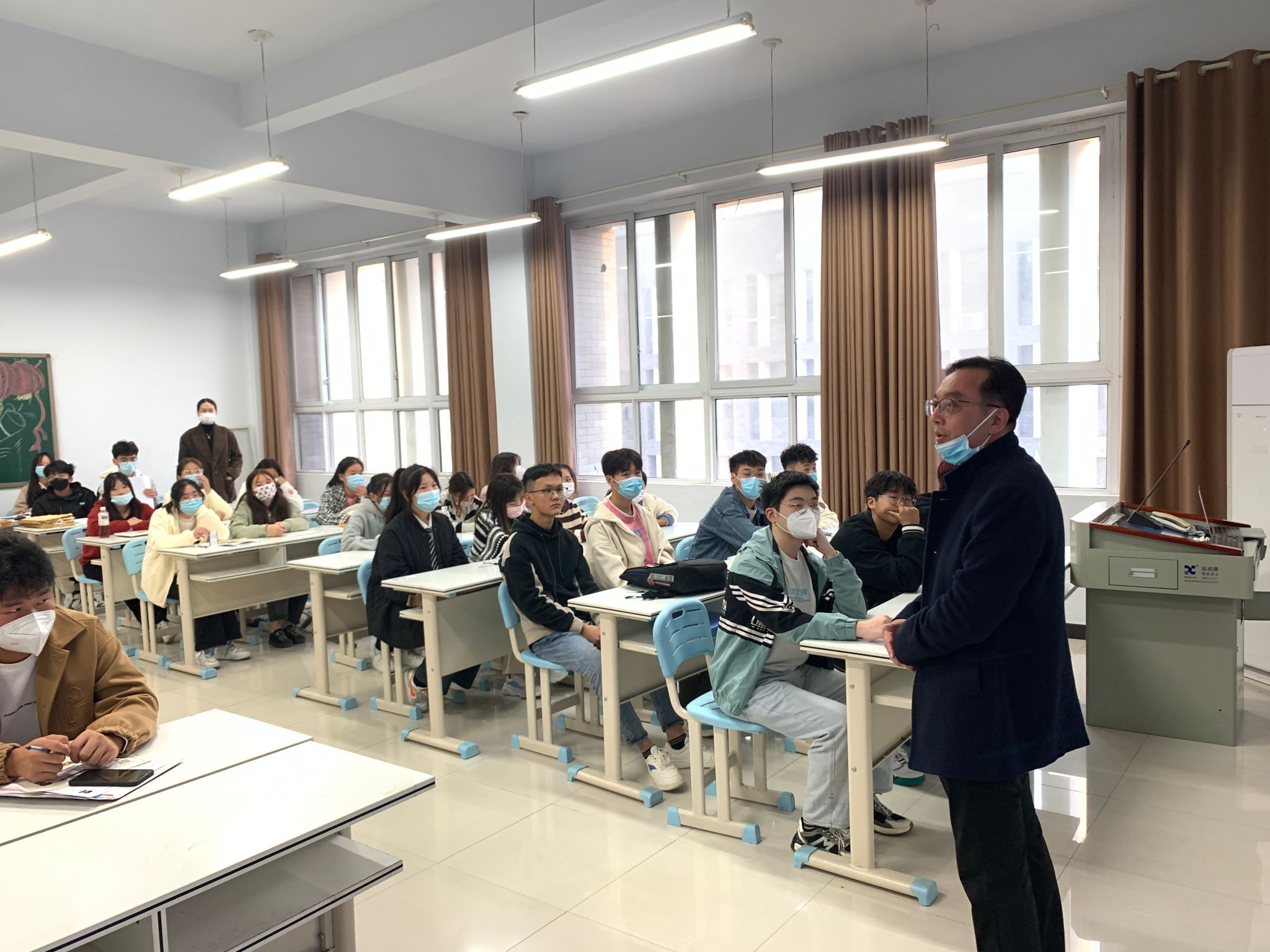 我院党总支书记张鹏在团总支书记谢锡莹的陪同下走进各班班会现场指导,为新生送去开学典礼寄语。张鹏书记对广大新同学的到来表示热烈欢迎,与新生进行了亲切的交流,了解新生到校后的生活。张鹏书记表示,新校园,新开始,希望同学们能够做好角色转换,尽快适应大学生活和学习节奏,如有任何问题一定要及时联系老师,因为学院永远是你们最坚强的后盾!也祝愿同学们珍惜新起点,扬起青春的风帆,笑迎新生活,启航新征程。