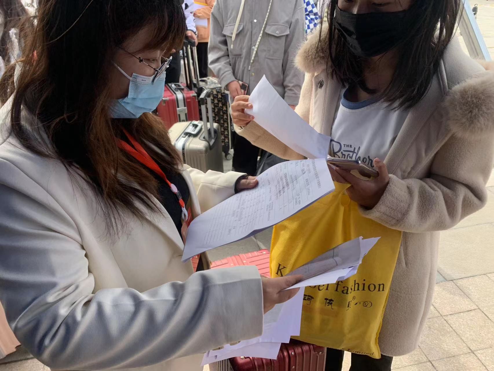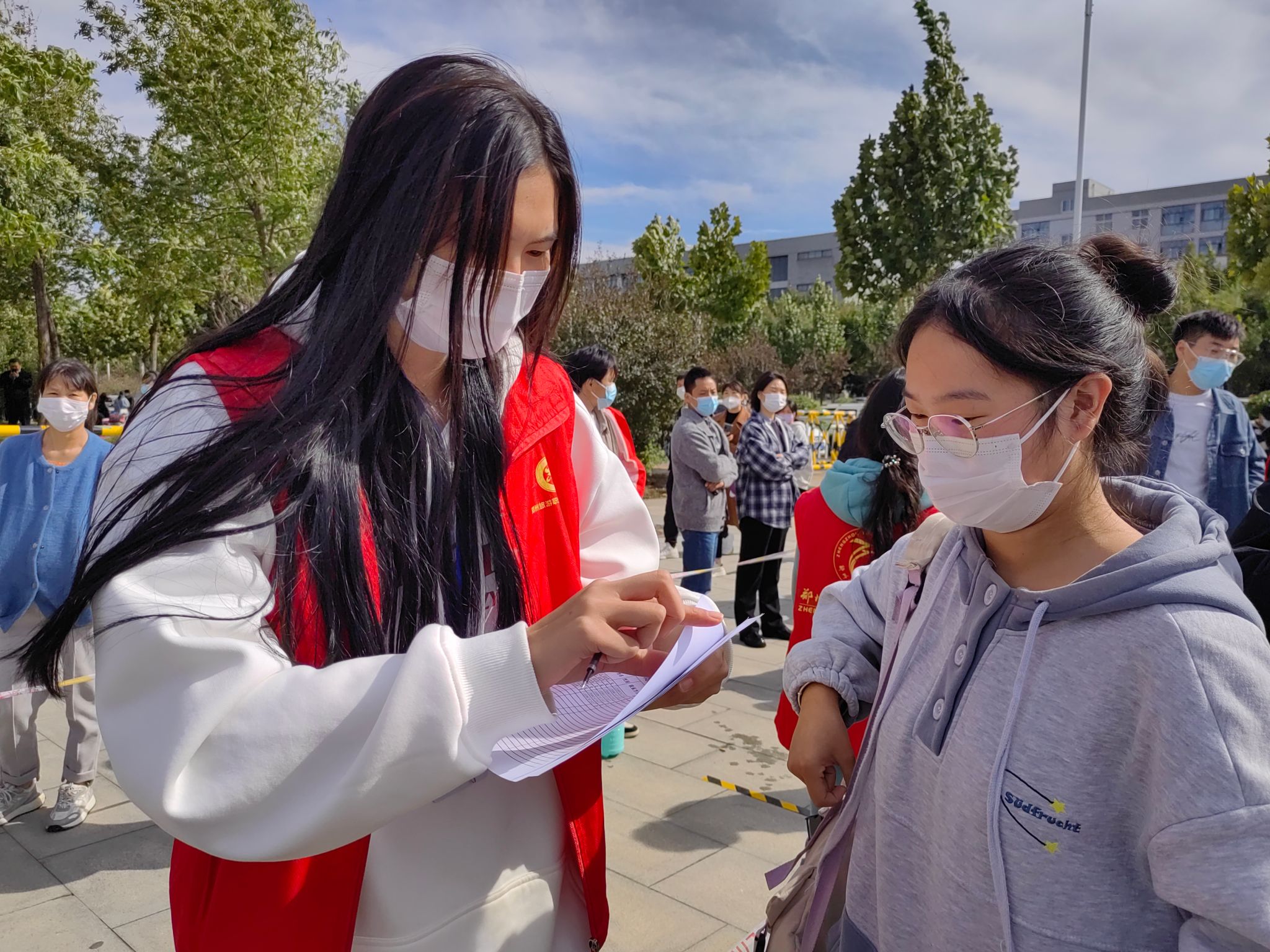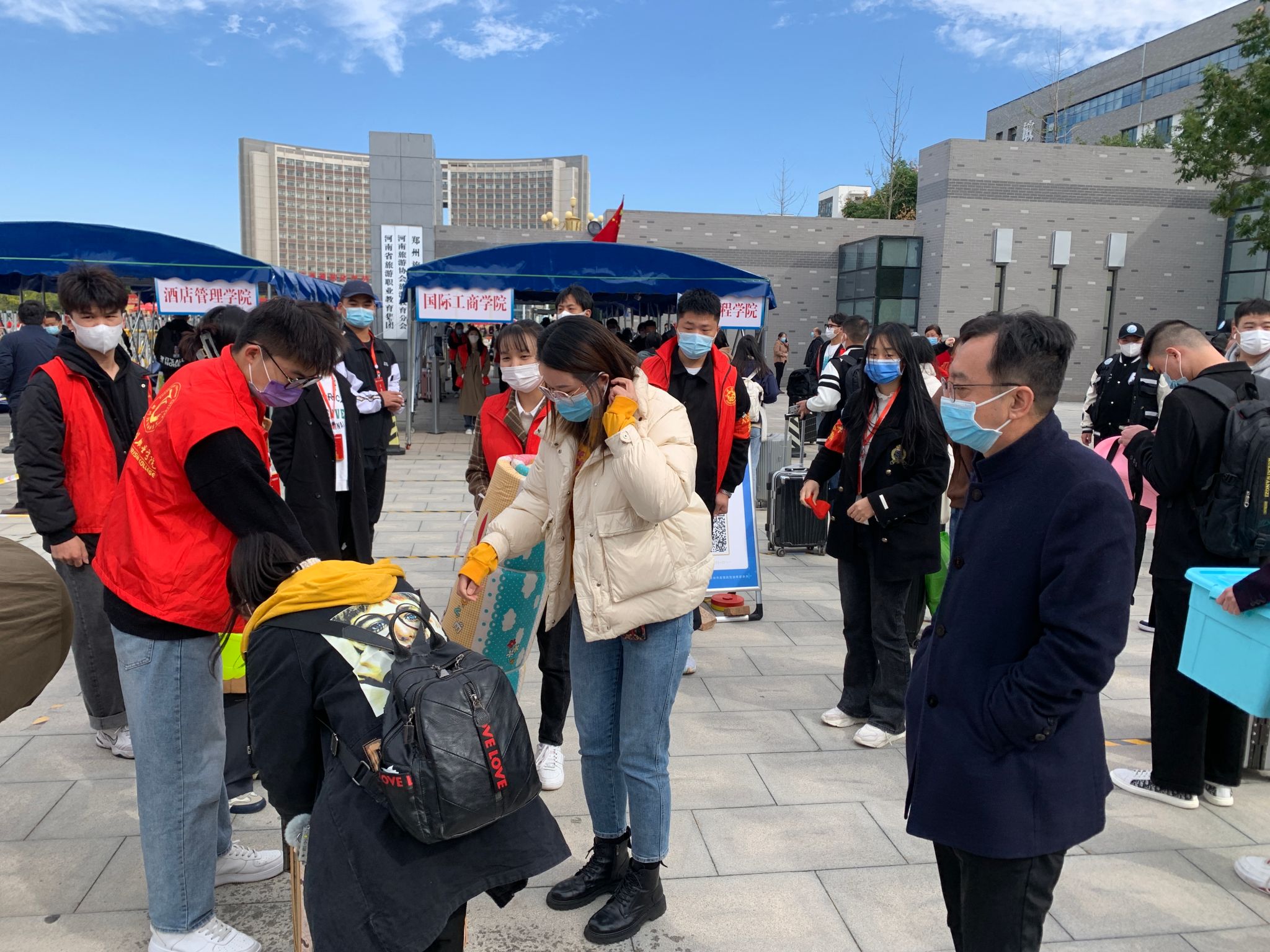 在新生报到前日,我院迎新团队提前布置迎新现场,一句句温暖热烈的欢迎祝福标语营造了浓烈的迎新氛围。在迎新当天,辅导员、志愿者团队在学校南门口迎接点耐心检查入校新生的六项健康档案、对其随身行李进行消杀和托运,引导学生入校人脸识别,入校做核酸、办理住宿、绿色通道等工作。班主任和班副在学院报到点收取学生档案、办理现场注册和分发校园卡等。虽然秋风冷冽,但大家都不辞辛苦,亲力亲为,热情地陪伴新生完成报到,尽快融入学校的新环境。