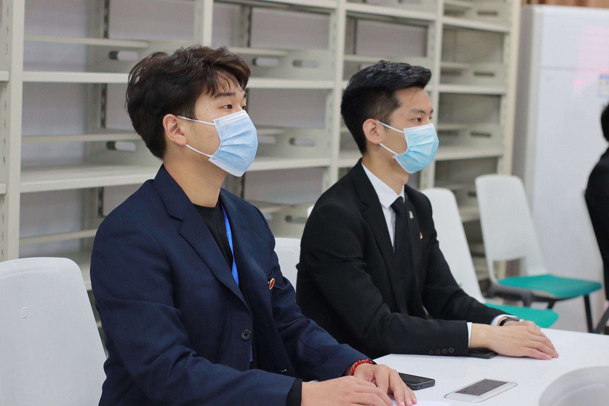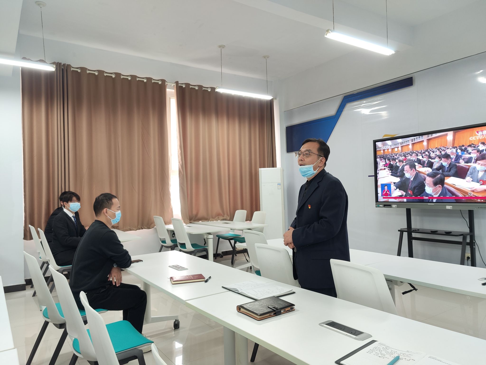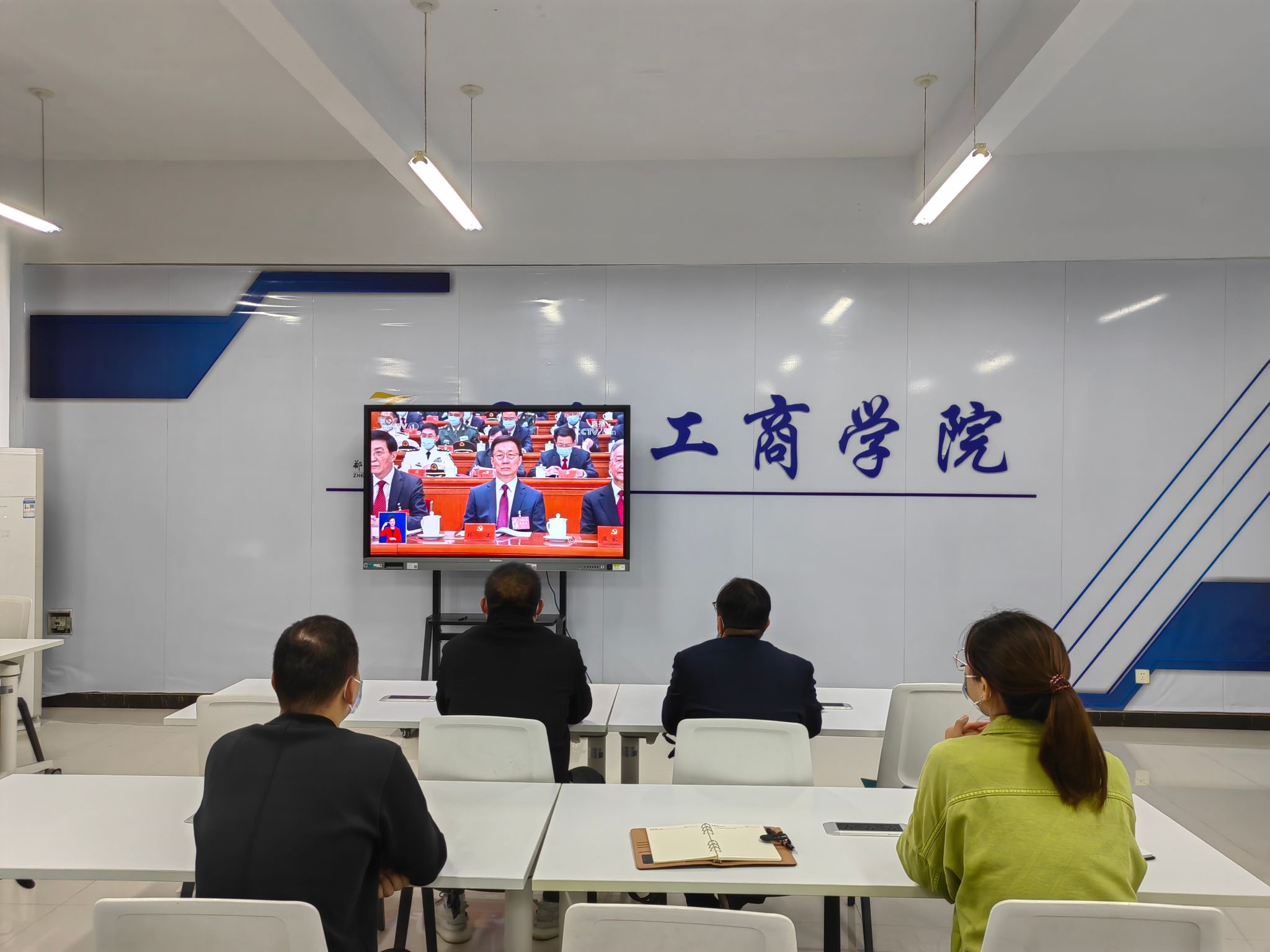 孙权院长、张鹏书记、在校老师、学生代表在1B304会议室、1B203教室集中收看直播,在校学生在宿舍、居家教师通过网络渠道收听收看直播,共同见证激动人心的历史时刻。