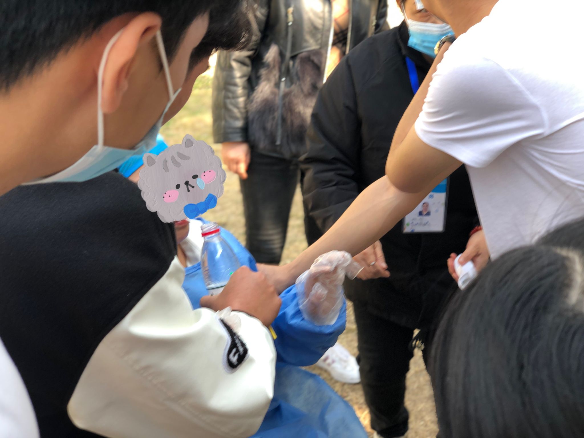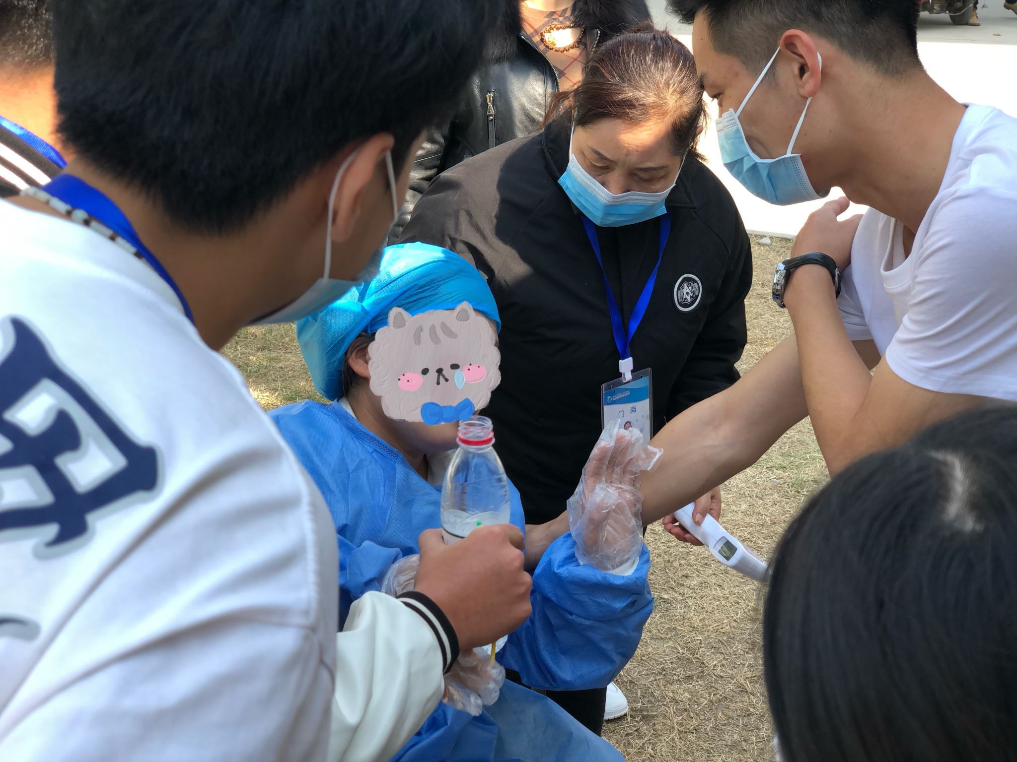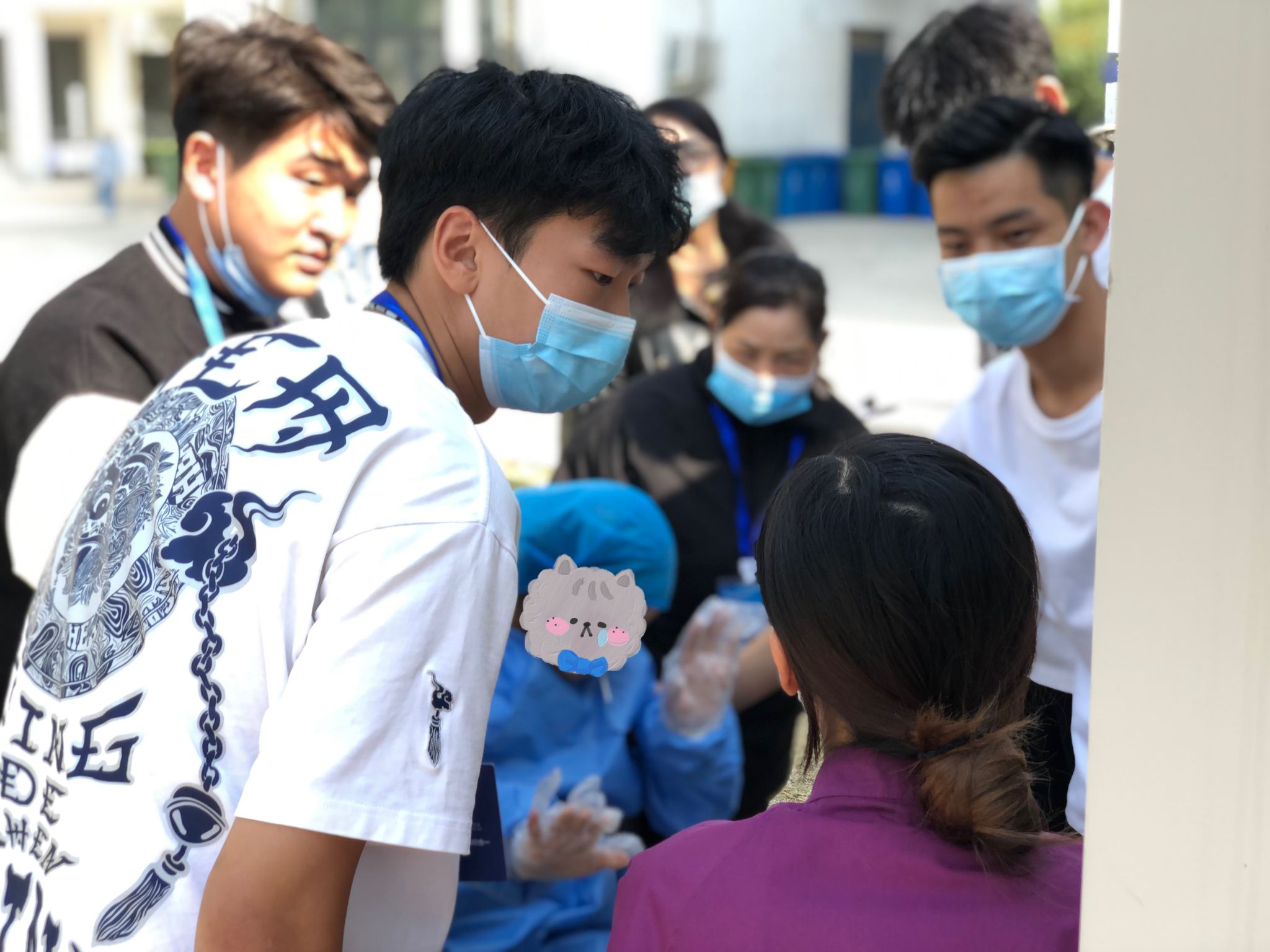 医务工作者在密不透风的防护服下每天都在超负荷的工作,他们忙碌的背影成为最亮丽的一道风景线。10月19日中午,国际工商学院团总支干部在组织22级新生做核酸时,发现医护人员不适,晕倒在核酸检测亭。国际工商学院团总支学生干部闫胜涛、祁山林、翁玉松等看到后,立即赶往核酸检测亭将医护人员扶至阴凉处,得知该医护人员有低血糖症状后,他们第一时间组织干部分别去购买牛奶、矿泉水、糖,来缓解医护人员的不适,让医护人员的身体得到了好转。