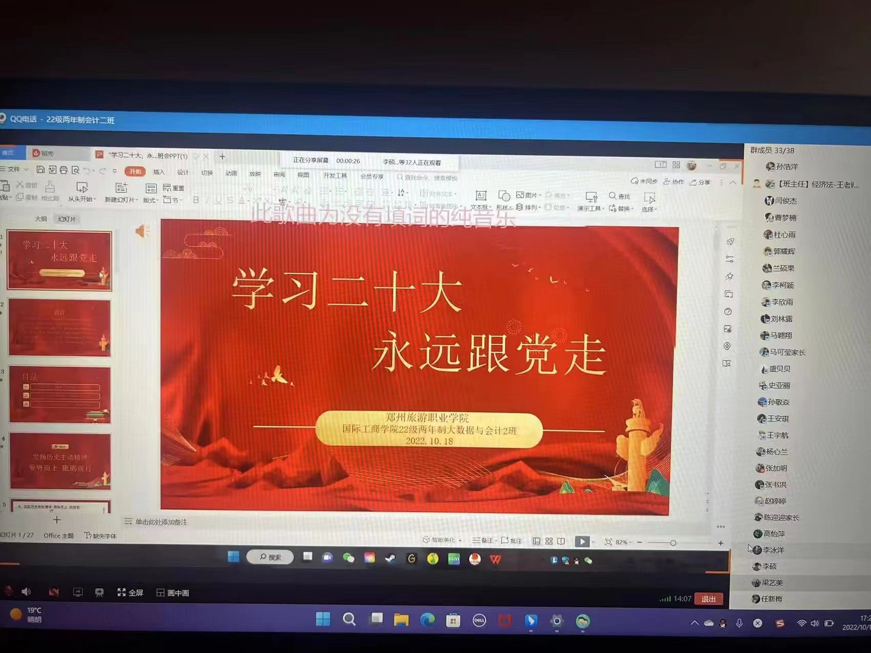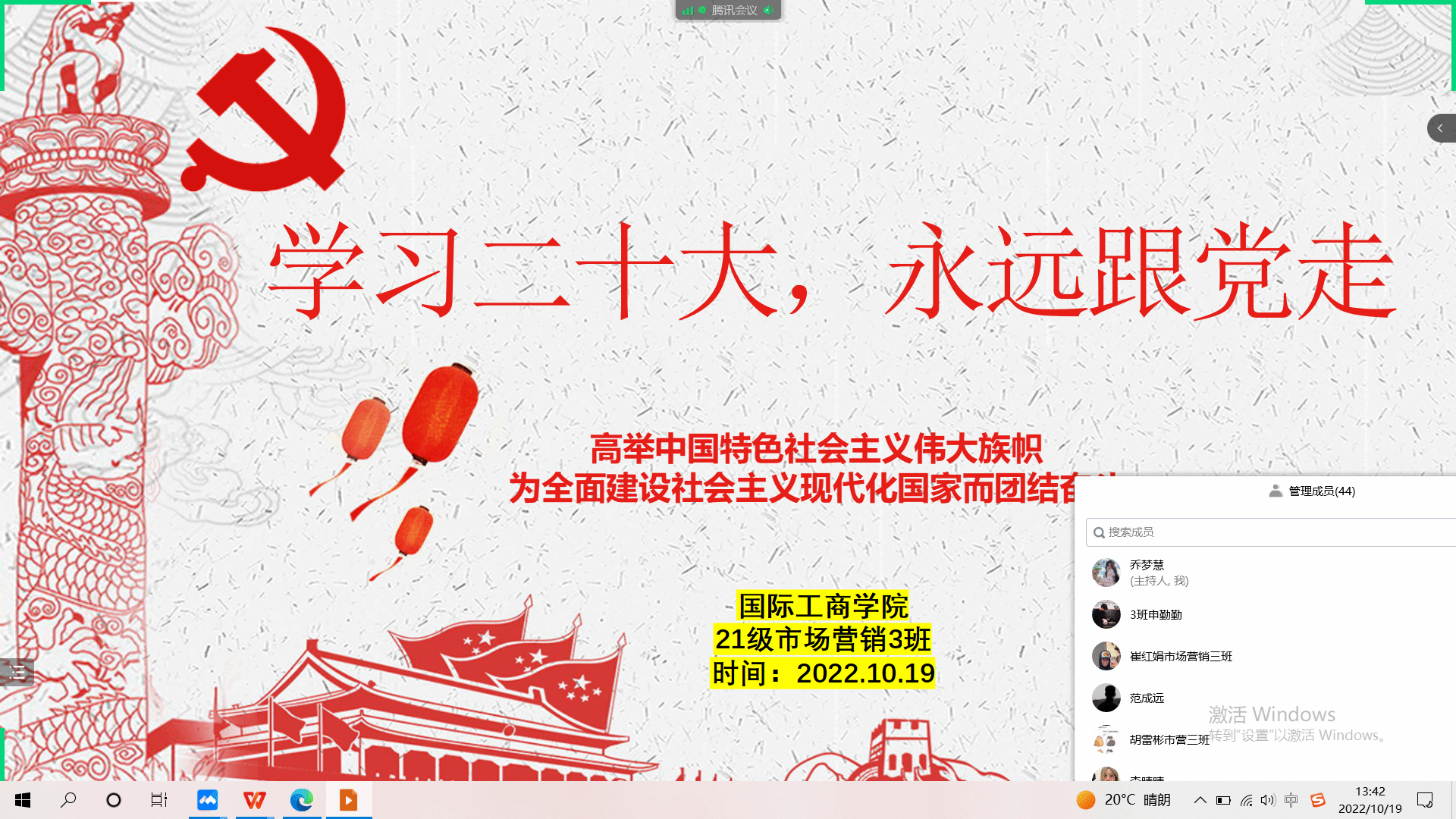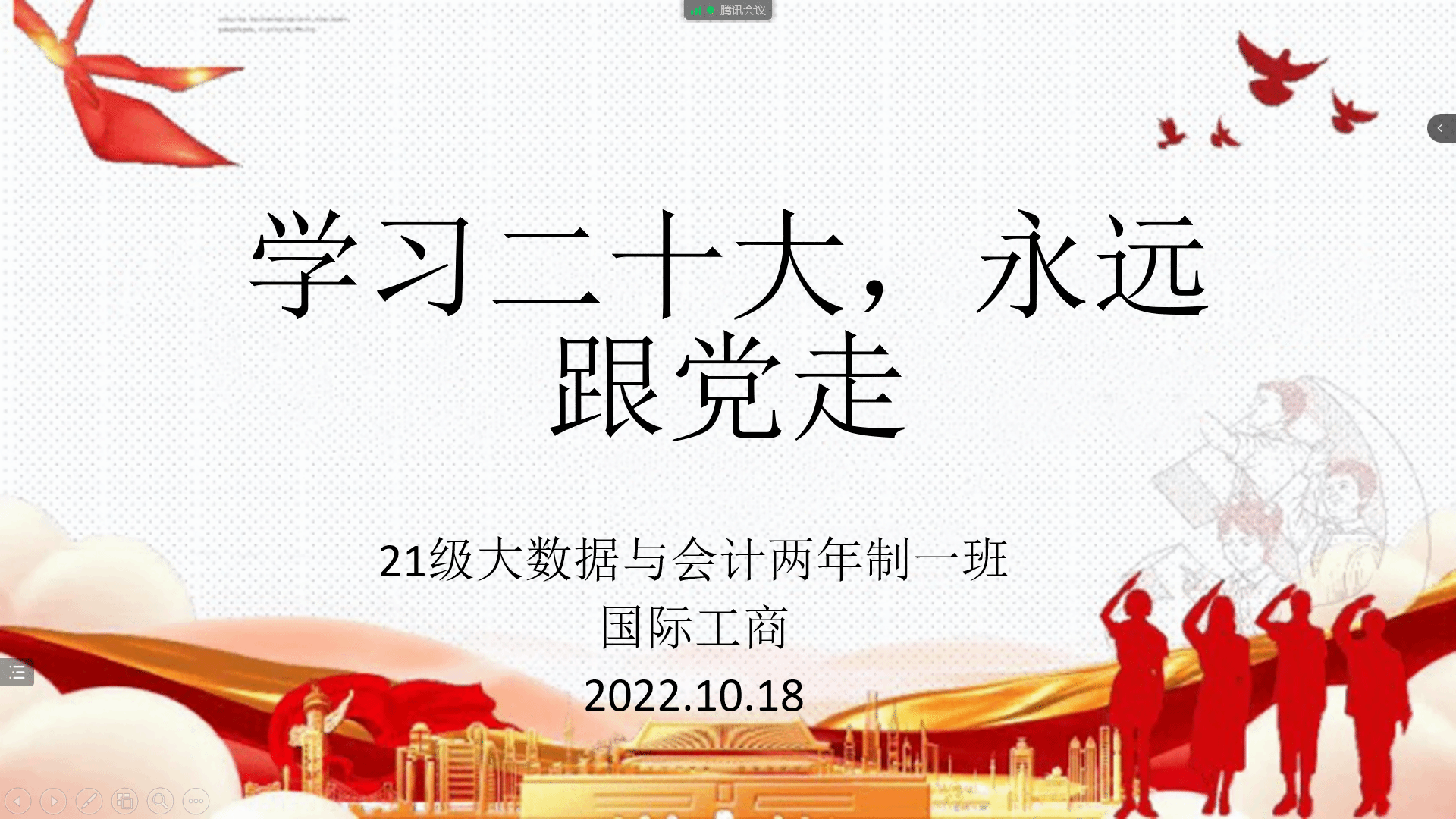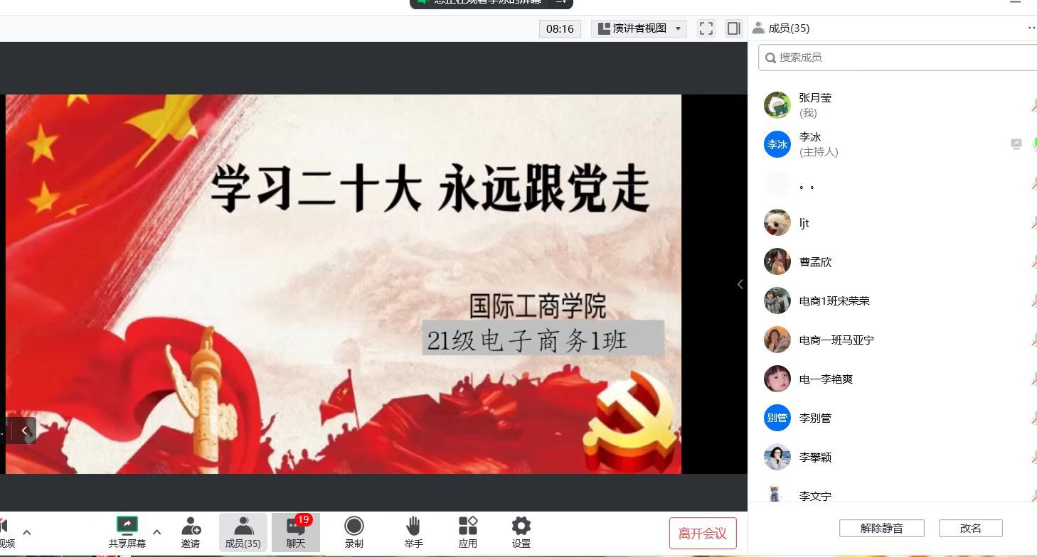 为了引导同学们学习和弘扬爱国主义精神,培养热爱祖国、热爱人民、热爱中国共产党的深厚情感,积极践行社会主义核心价值观。10月18日-10月19日,国际工商学院组织各班在线上开展“学习二十大,永远跟党走”主题班会。