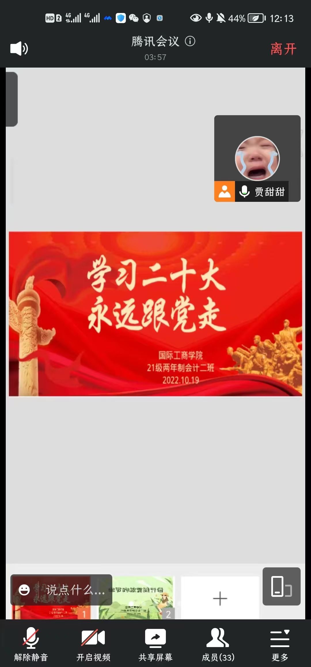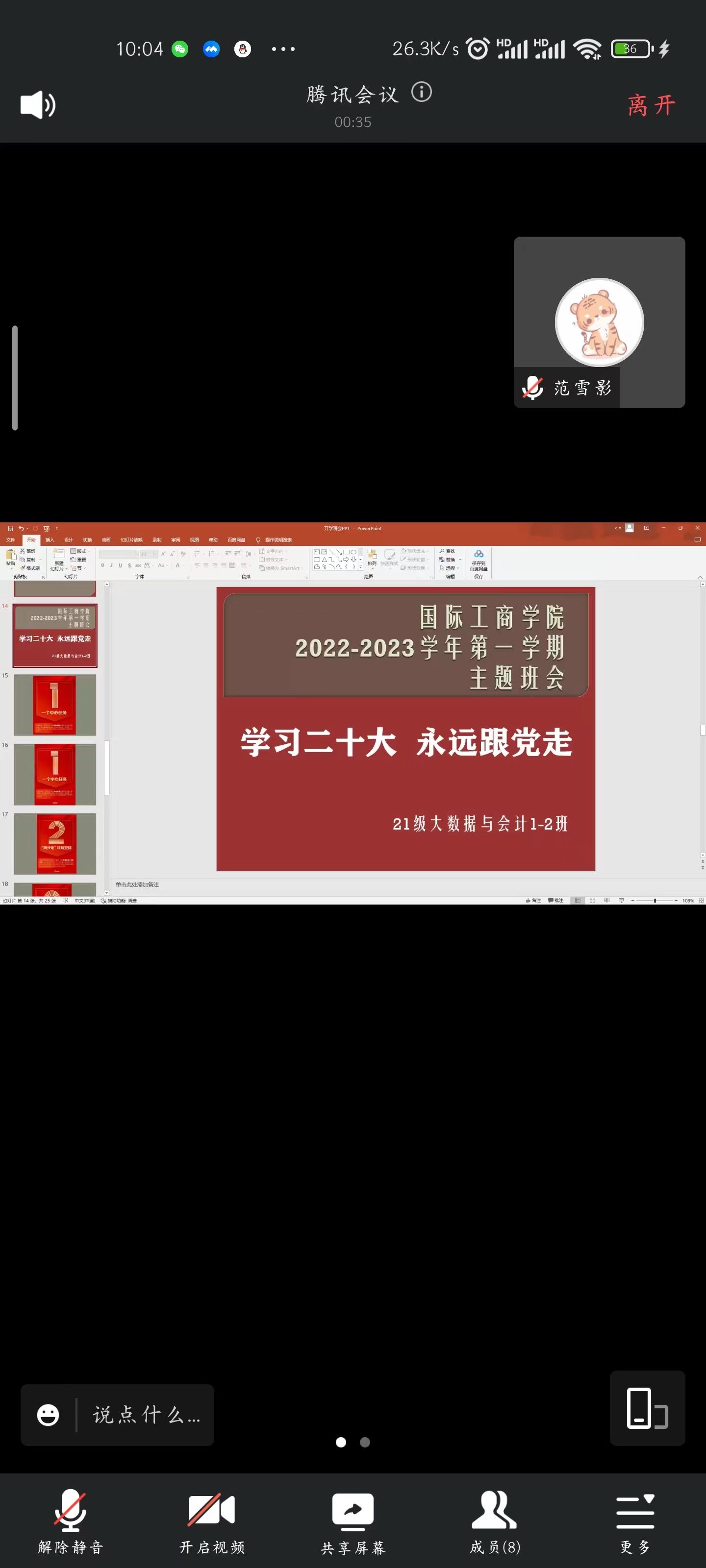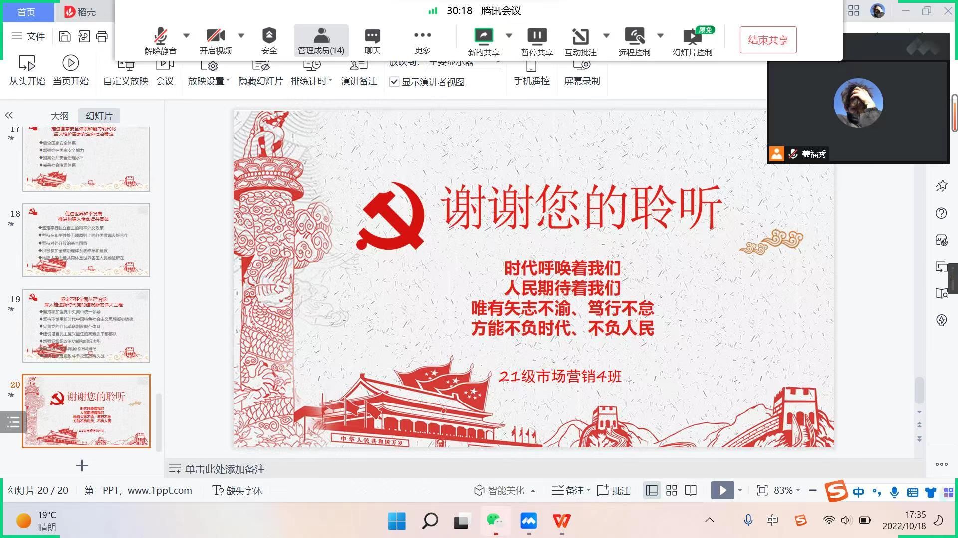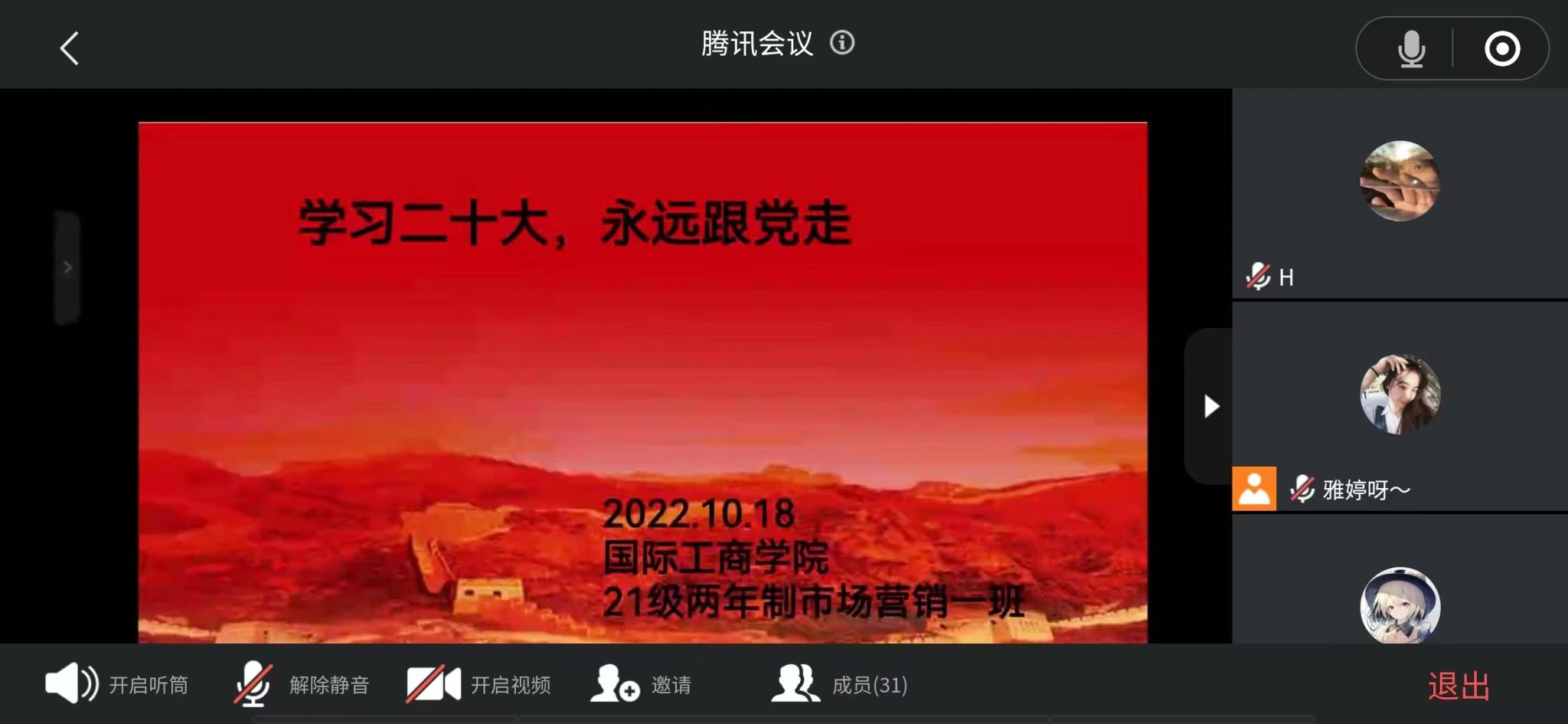 为了引导同学们学习和弘扬爱国主义精神,培养热爱祖国、热爱人民、热爱中国共产党的深厚情感,积极践行社会主义核心价值观。10月18日-10月19日,国际工商学院组织各班在线上开展“学习二十大,永远跟党走”主题班会。