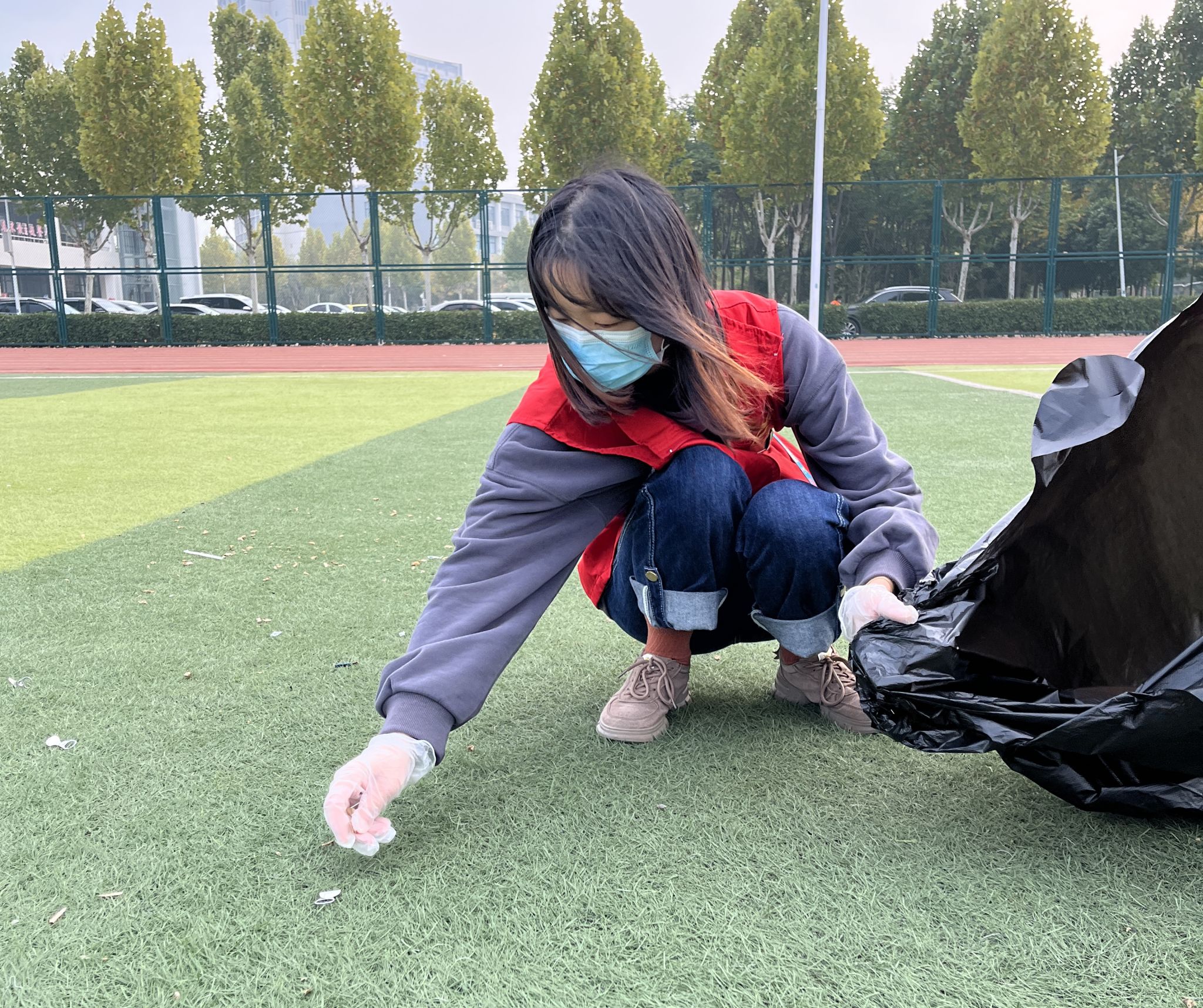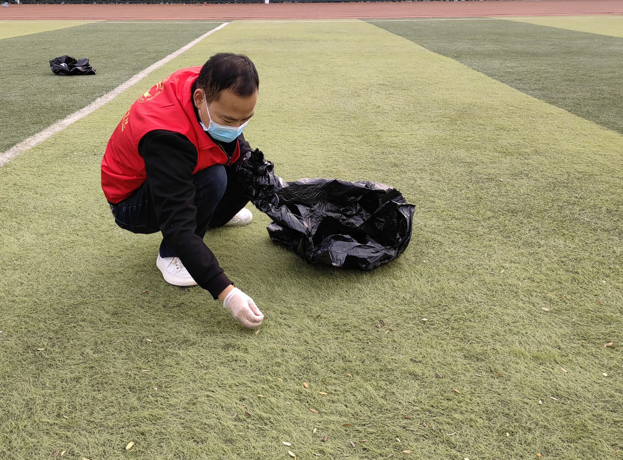 在操场上,我院党总支书记张鹏、孙文霞老师、张权老师等在校党员同志不怕脏不怕累,着手清理操场上的白色垃圾、瓜子花生皮屑等垃圾,为师生营造干净整洁的生活环境。疫情防控期间,在此提醒各位同学,爱护环境人人有责。操场休闲时,请佩戴好口罩,做好安全防护,不聚集,不扎堆,不乱扔垃圾,文明进场,有序退场,共同守护健康、卫生的校园环境。