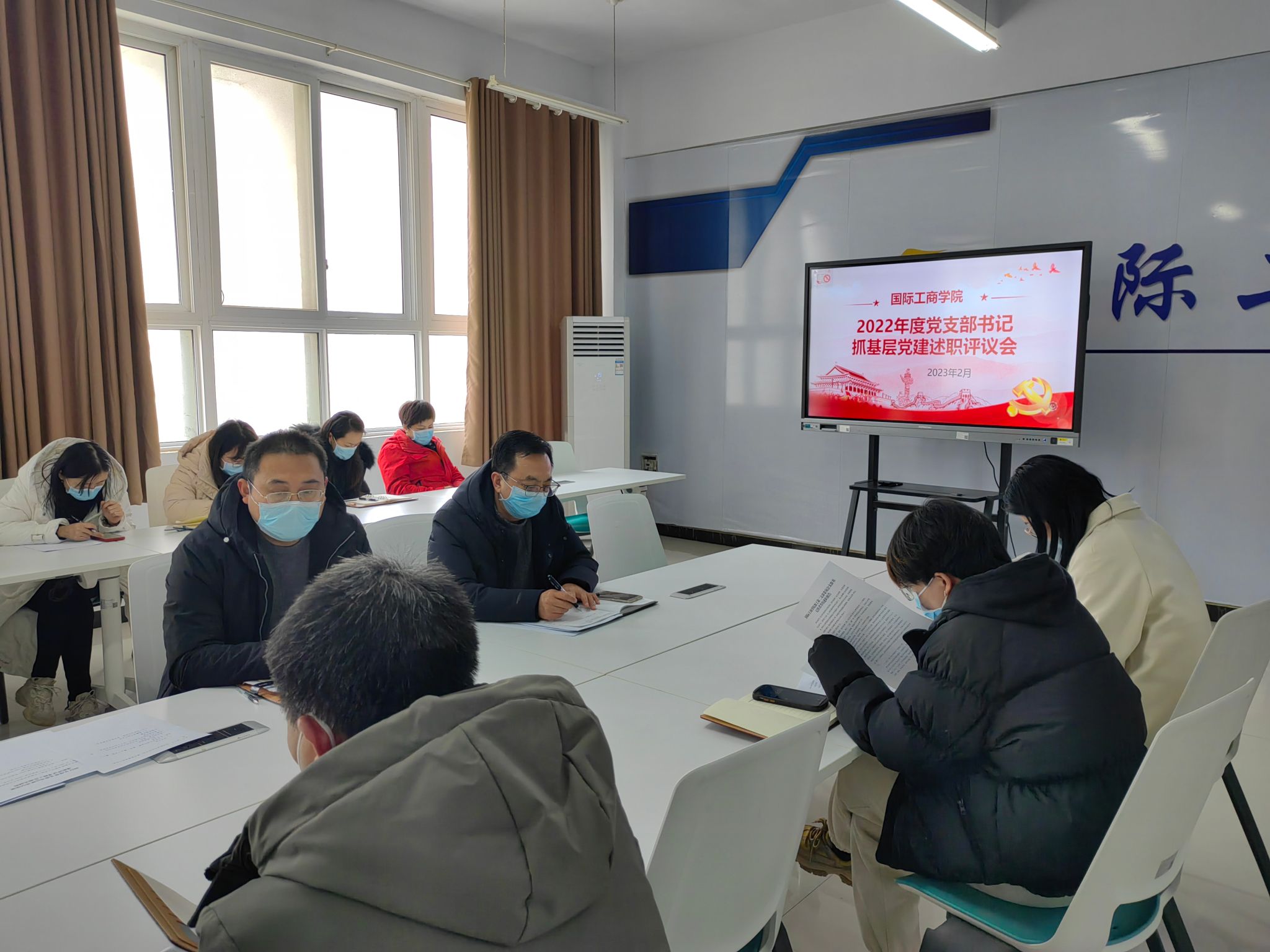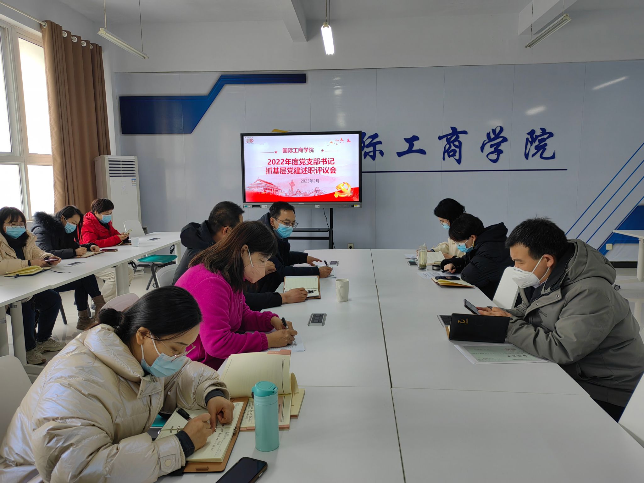 2月22日中午,国际工商学院党总支在1B304会议室召开2022年度党支部书记抓党建述职评议会。全体党员同志参加会议,特别邀请了民主党派同志、教师代表参会。会议由党总支书记张鹏主持。