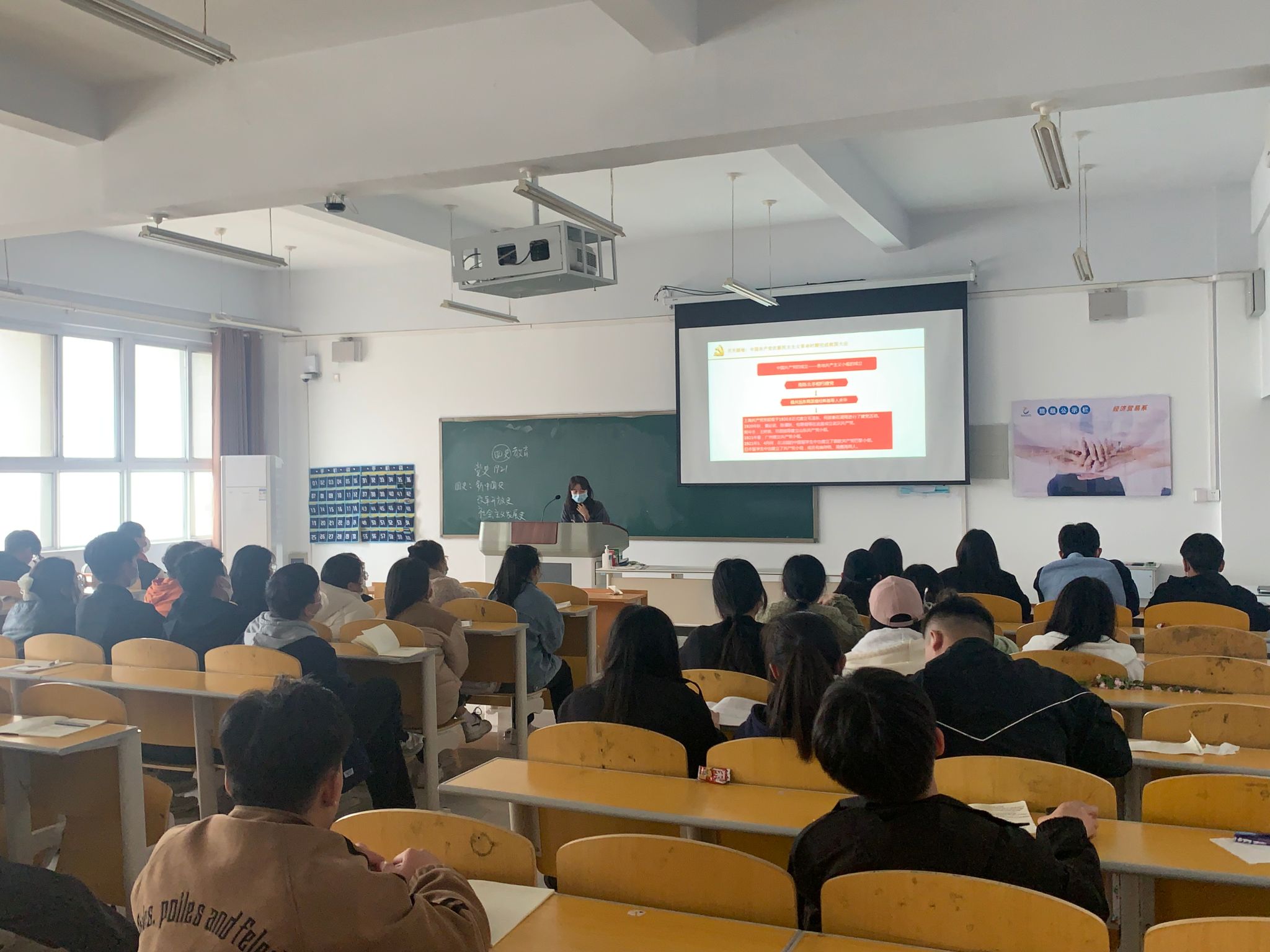 随后,孙文霞老师围绕四个“地”,即开天辟地、改天换地、翻天覆地、惊天动地,讲述中国共产党带领中华民族实现救国、兴国、富国、强国目标的辉煌历程,以及每一阶段创造的精神内涵。孙老师在讲课中将中国共产党伟大的精神谱系贯穿于党的发展历程,希望同学们能够像我们的党一样,在风华正茂的年纪,坚定理想信念,补足精神之“钙”,不断从党的百年奋斗历程中汲取智慧和力量,让思想在学习中升华,信念在努力中淬炼,力量在实践中凝聚,踔厉奋发,勇毅前行,为实现个人理想、为实现中华民族伟大复兴的中国梦而不懈奋斗。