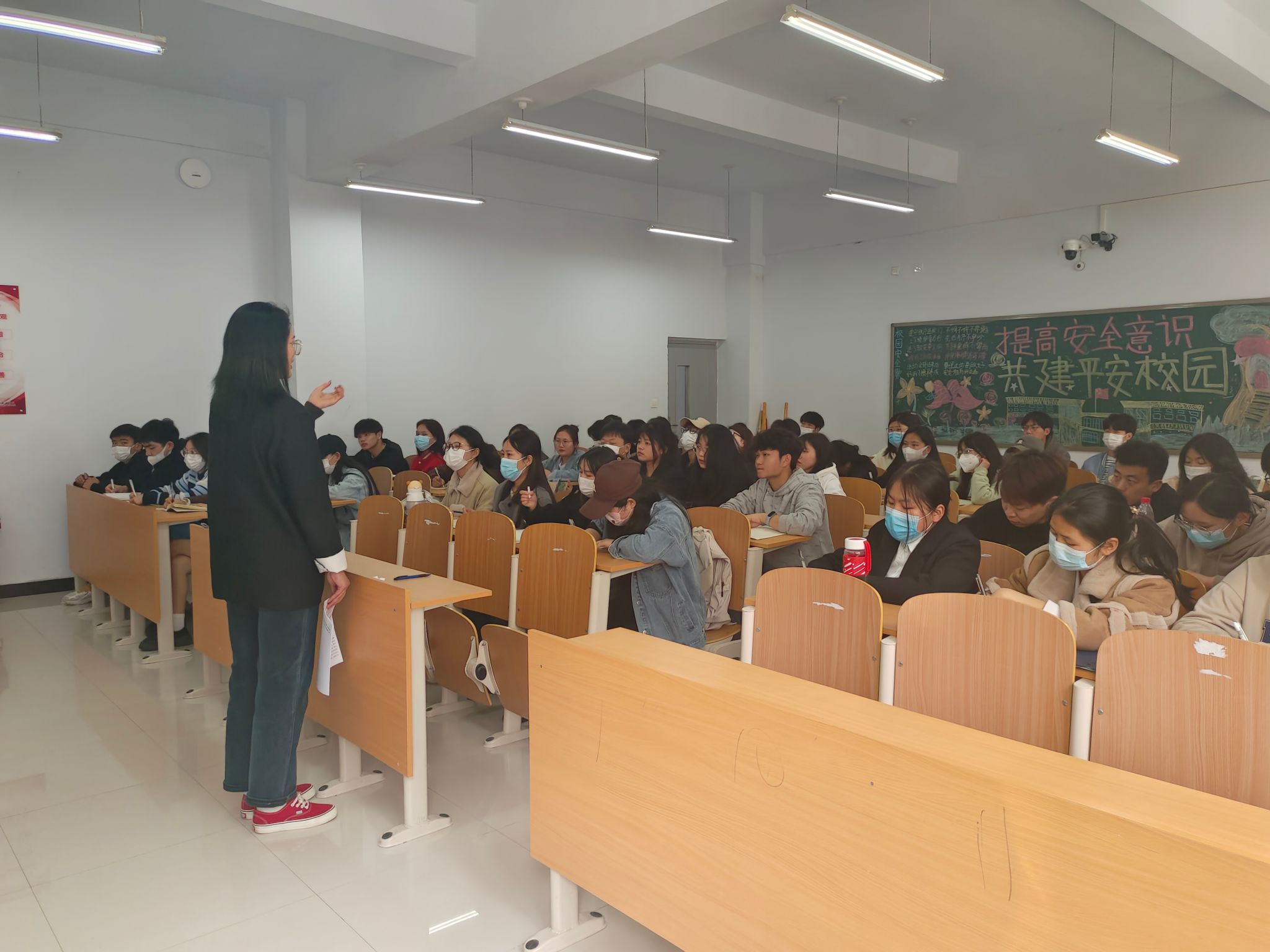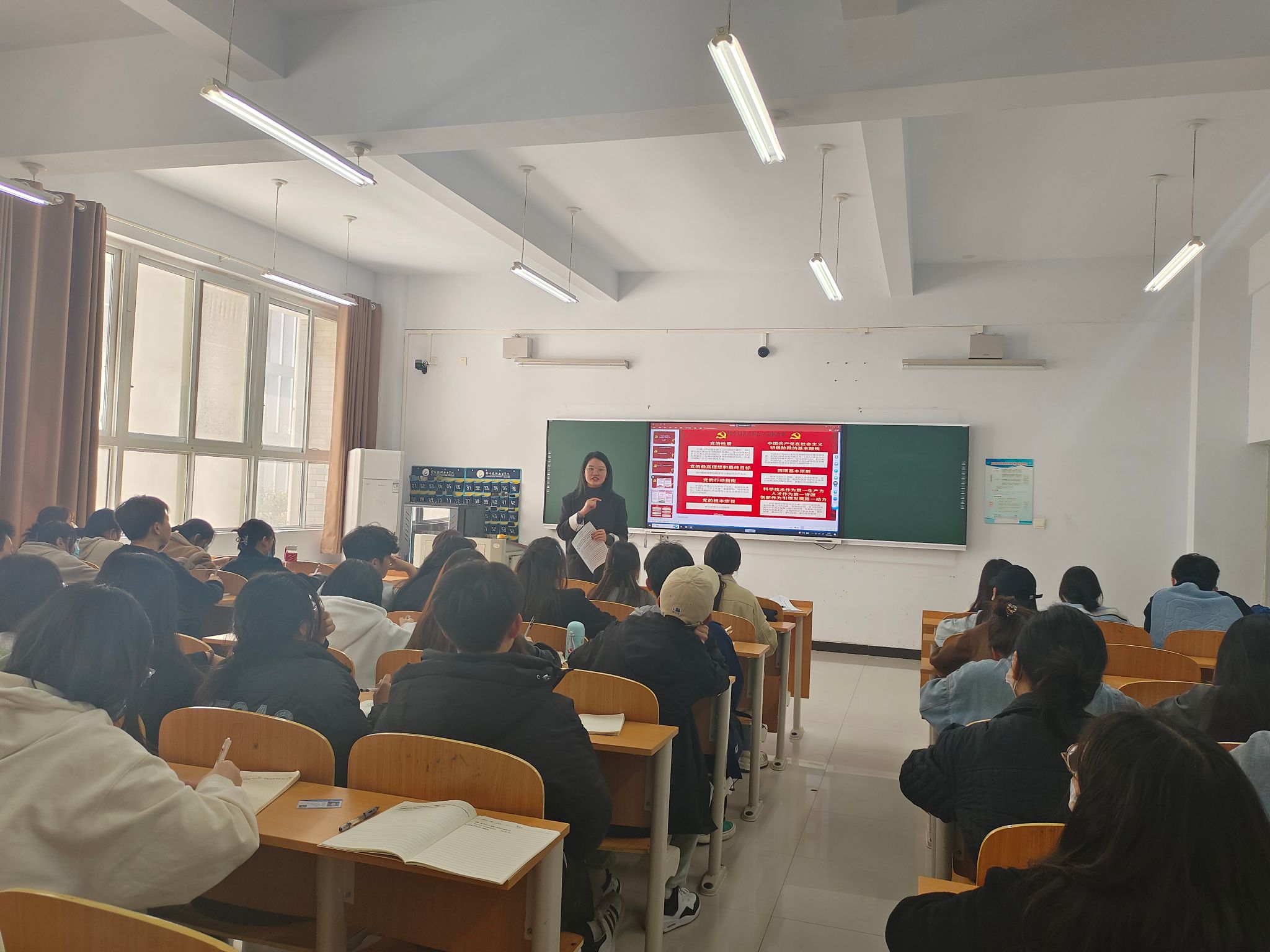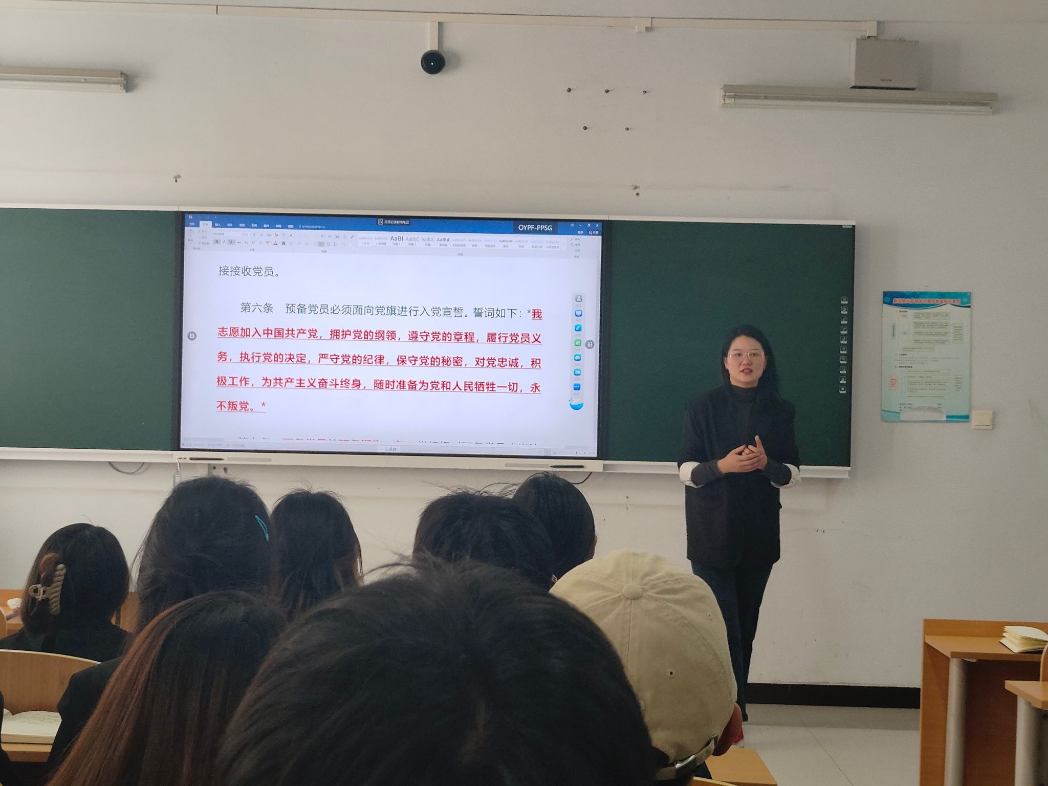 在这次党课培训中,葛秀丽老师首先带着大家一起学习党章,讲述了党章修改的原因及出发点,带领大家学习党的性质、党的最高理想、中国共产党的初心与使命、伟大的建党精神、“四个意识”等30个关于新党章的知识点。紧接着,葛秀丽老师对同学们进行党章知识测试,同学们都能积极主动正确地回答问题。葛秀丽老师对同学们能够牢固掌握本次党课知识表示满意。