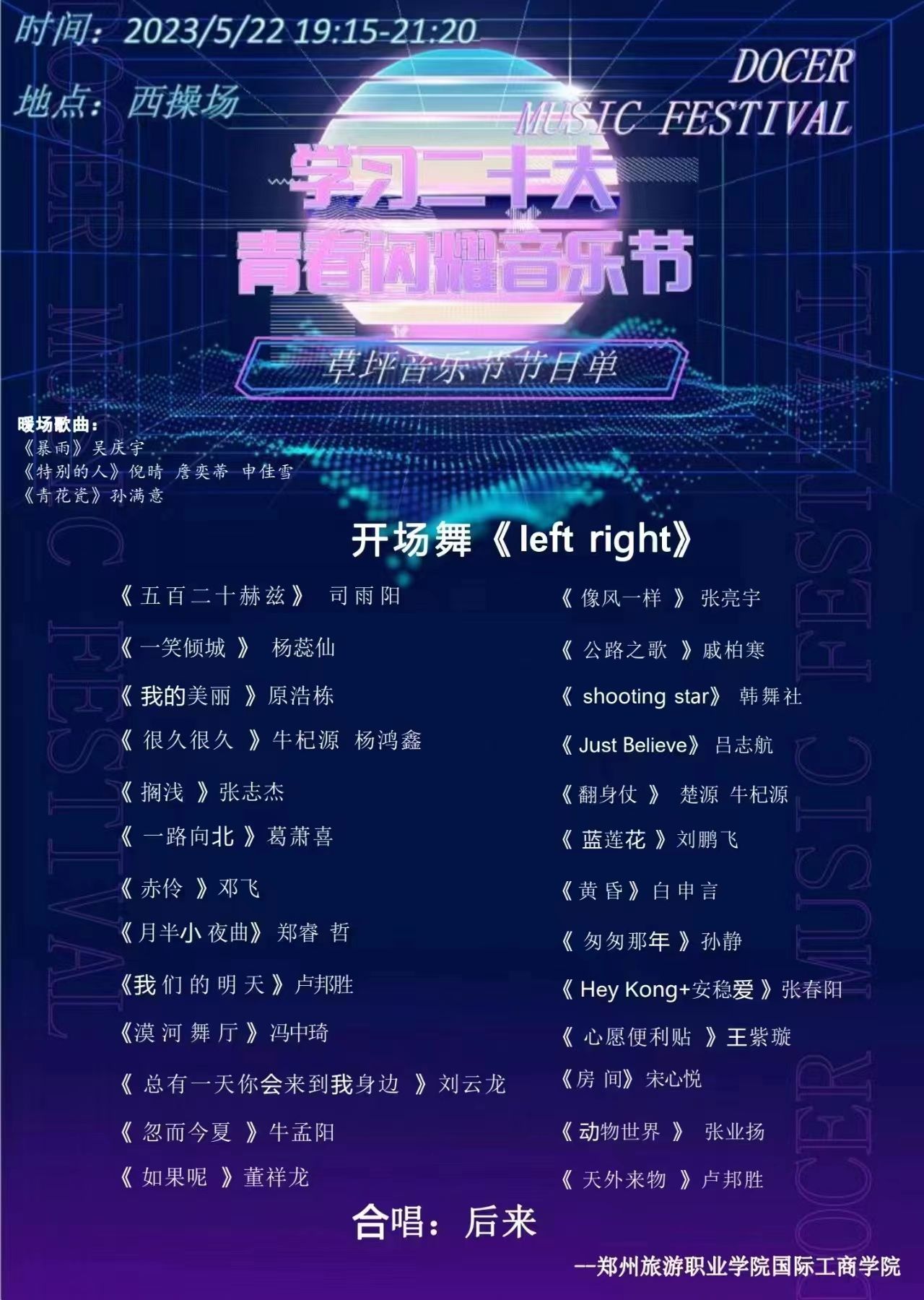 为深入学习贯彻党的二十大精神,丰富校园文化生活,展现青春激昂风采,给即将离校的同学留下一段难忘的记忆。国际工商学院于5月23日在西操场举行“学习党的二十大,青春闪耀音乐节”毕业音乐会。