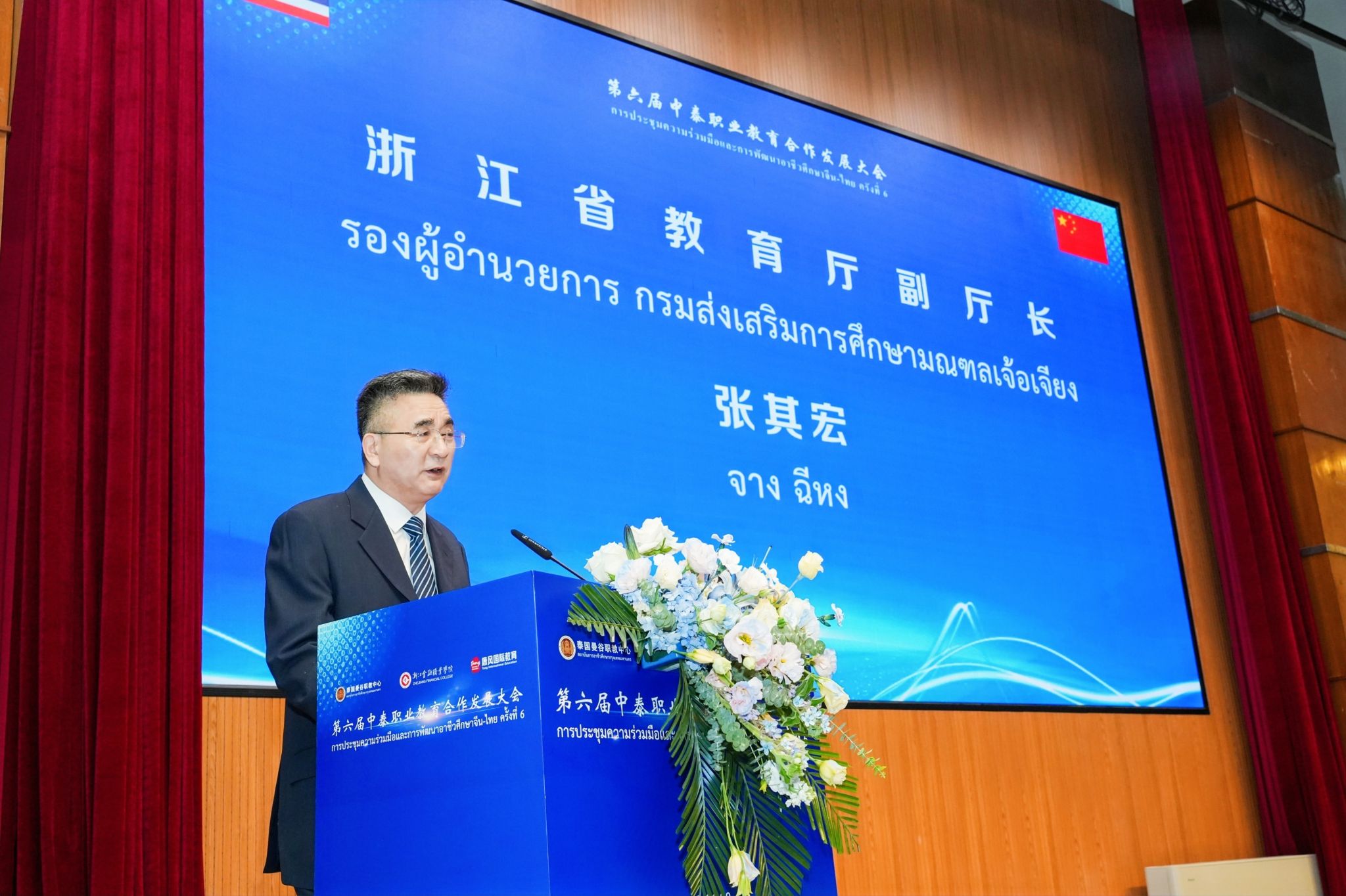 此次会议邀请曼谷职业教育中心领导及下属院校校长、浙江省教育厅、中泰两国70余所院校300余名嘉宾参会。首先,浙江省教育厅二级巡视员张其宏致辞,介绍了浙江省的经济发展情况与教育对外开放情况,并希望各位与会代表深入探讨、凝聚共识、互学互鉴,共同提升中泰职业教育合作的质量。