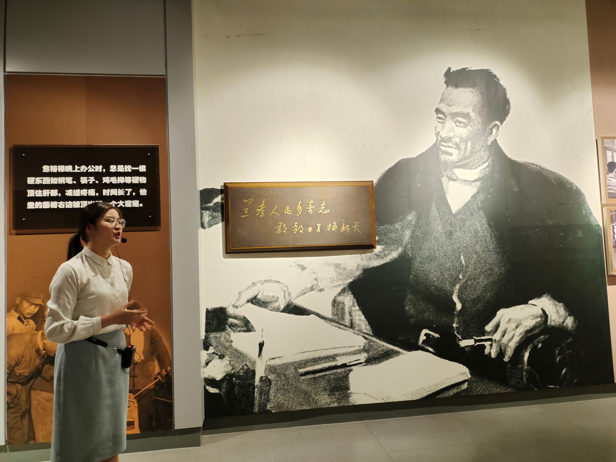 在纪念馆里重温焦裕禄事迹,在实践中领悟焦裕禄精神。跟随讲解员的脚步,志愿服务队怀着崇敬的心情走进了兰考县文化交流中心,重温“焦桐”故事。在“神州赤子”、“临危受命”、“执政为民”、“干部楷模”、“今日兰考”五个展区内,志愿服务队驻足举目,细阅历史痕迹,聆听历史声音。一张张珍贵的历史图片、一件件生活用品、一幕幕感人故事,再现了焦裕禄同志访贫问苦、心系群众、为民送暖,带领兰考人民治理“风沙、盐碱、内涝”三害的历史情景。