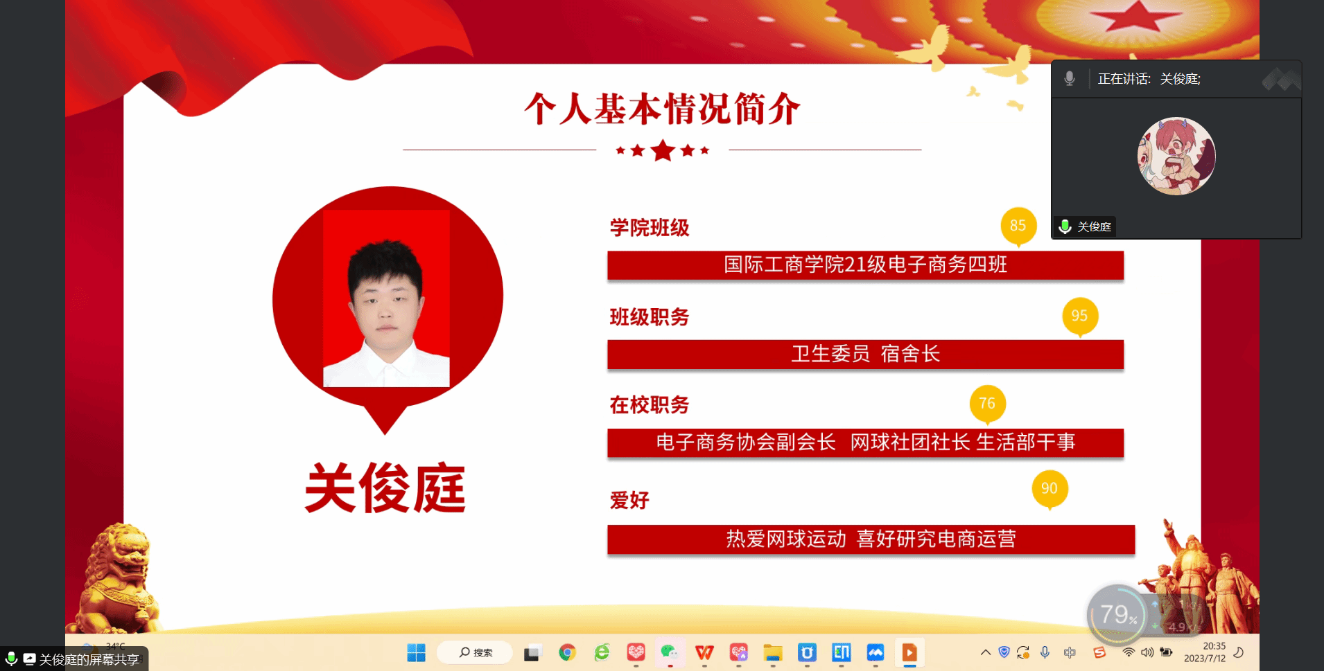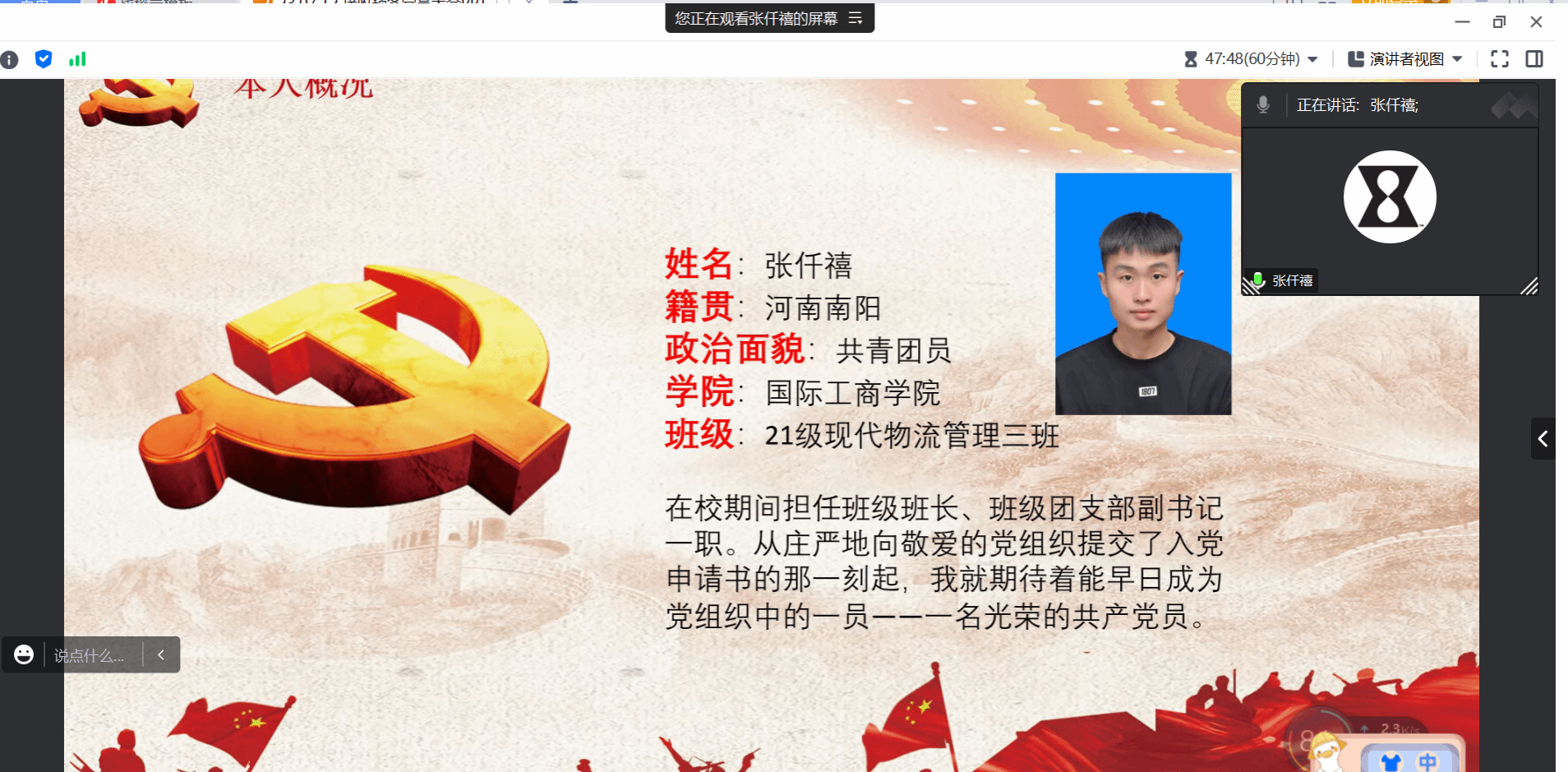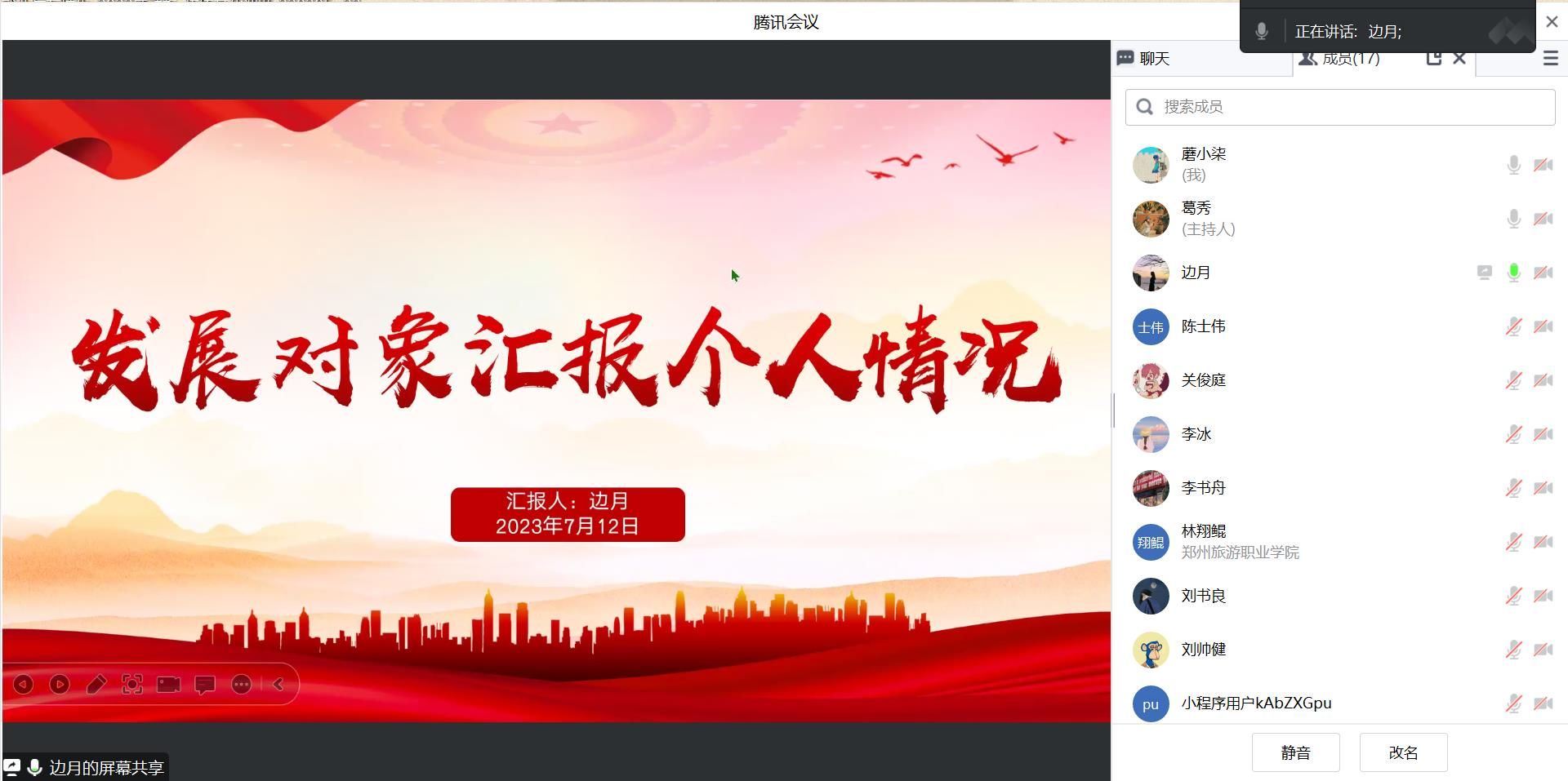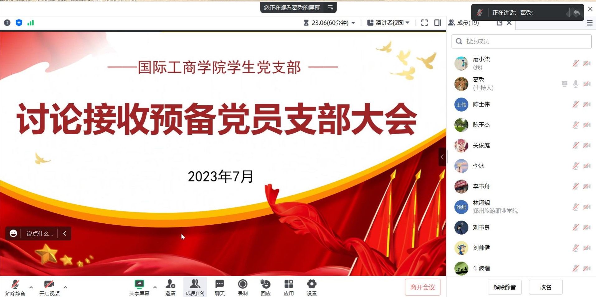 为深入学习贯彻党的二十大精神,夯实巩固基层党组织建设,不断吸收新鲜血液,着力锻造先锋队伍,充分发挥党组织的战斗堡垒作用。7月12日,国际工商学院学生党支部采取“线上线下”相结合的方式召开支部大会,讨论接收李书舟等9名同志为预备党员的相关事宜。会议由学生党支部书记葛秀丽同志主持,党支部全体成员、入党介绍人及9名党员发展对象参加大会。
