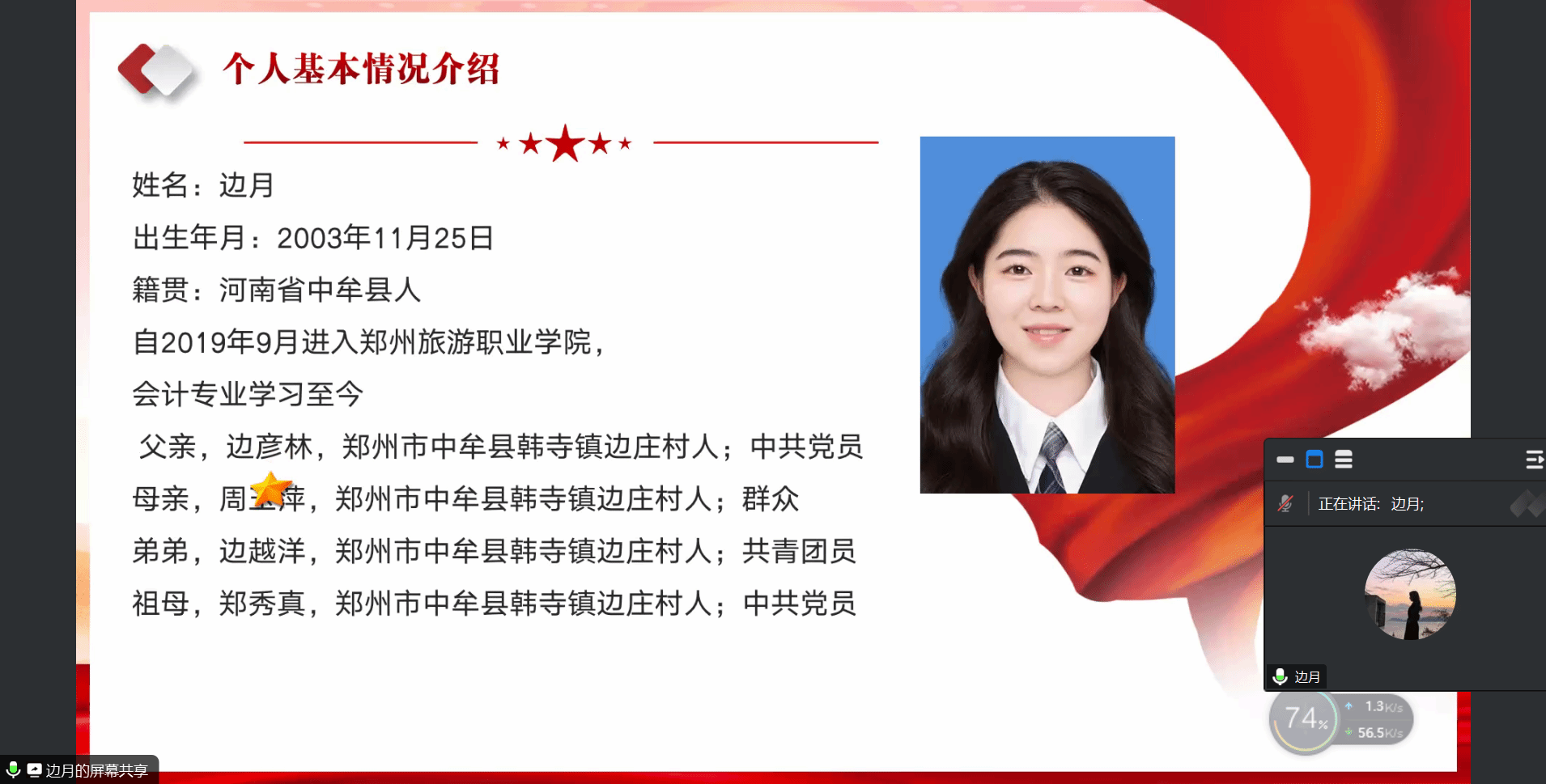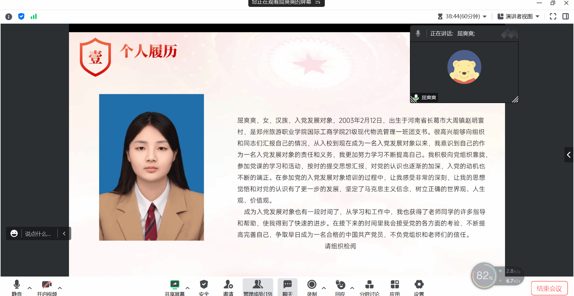 大会进行第一项,发展对象李书舟等9名同志从对党的认识、入党动机、个人履历、家庭成员和社会关系情况、现实表现,以及需向党组织说明的其他问题等方面向党组织做详细汇报。